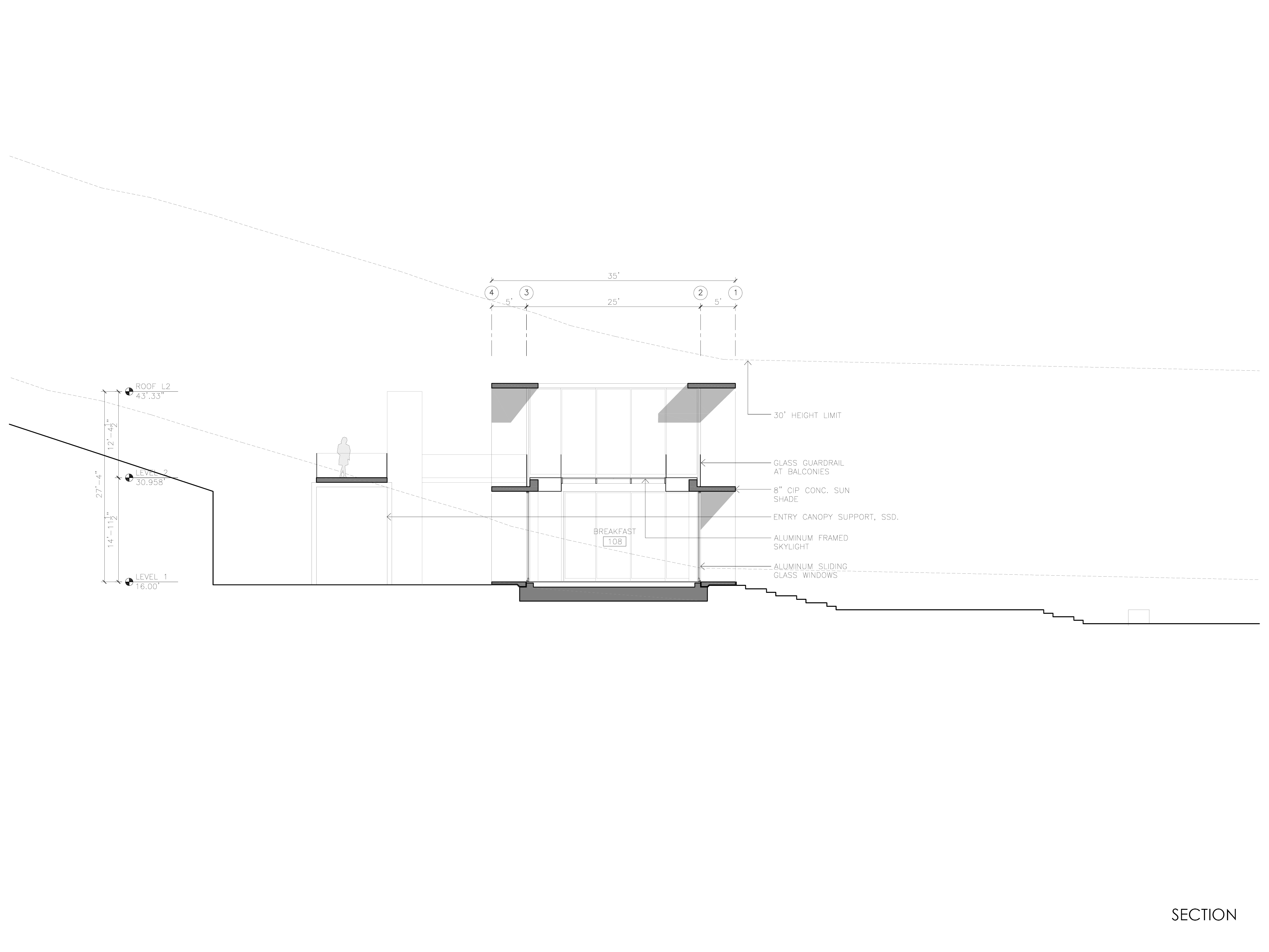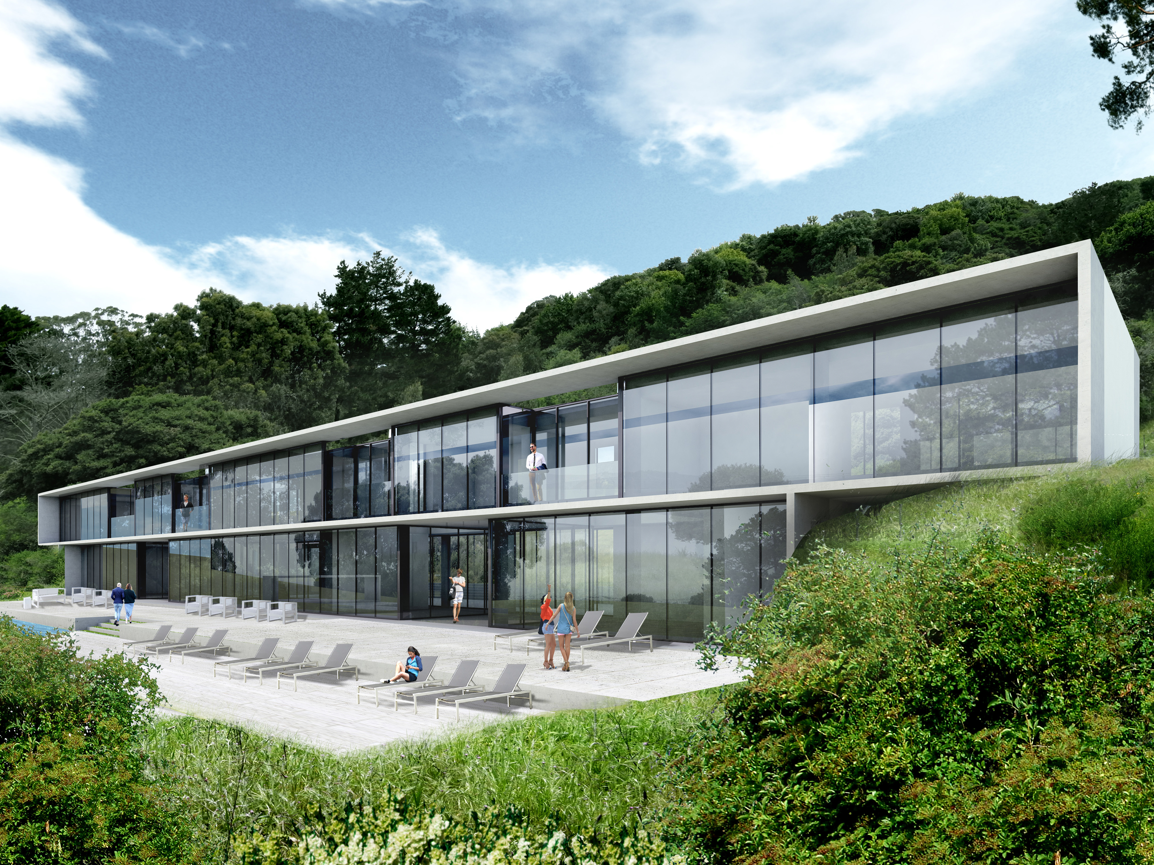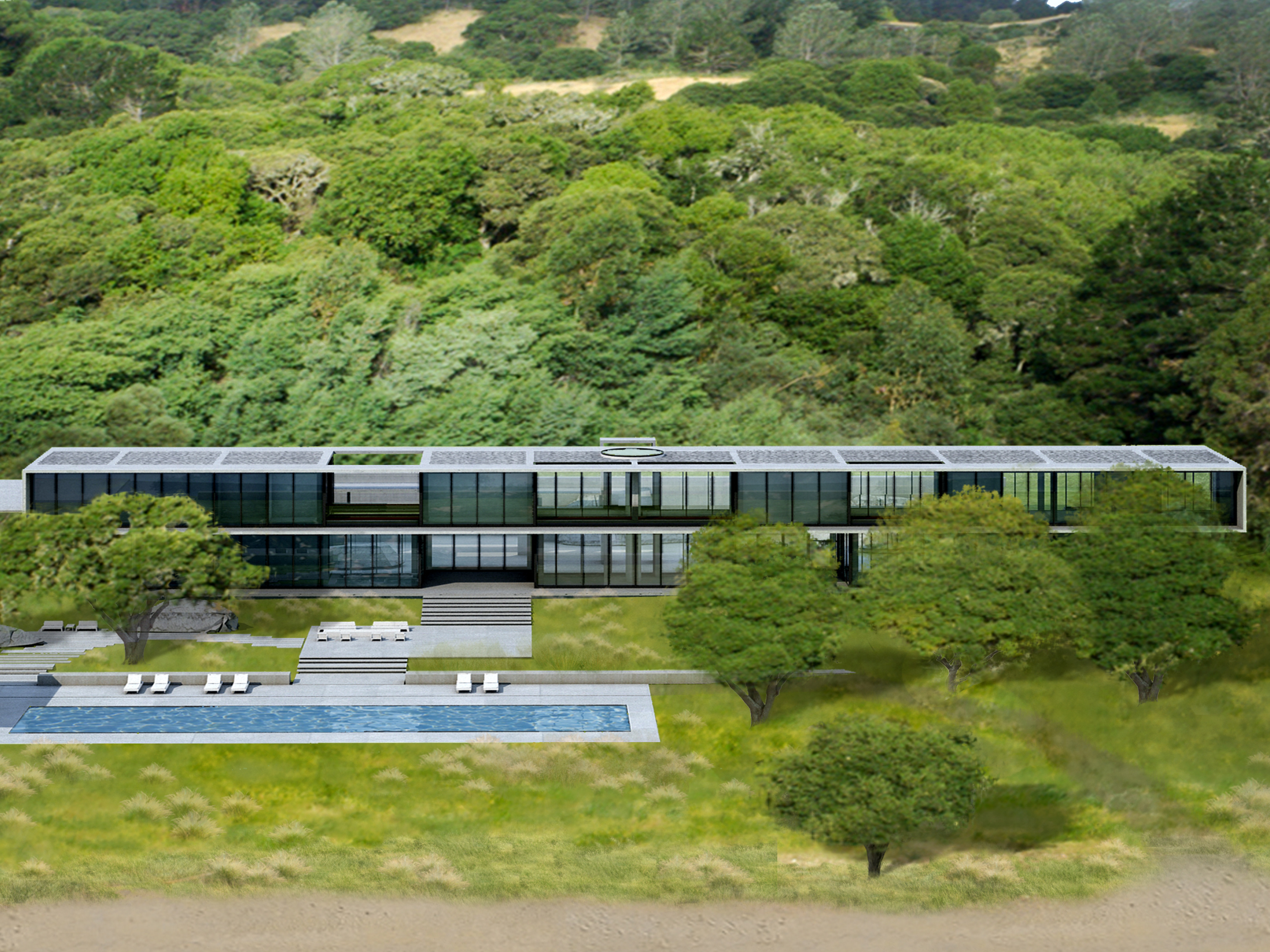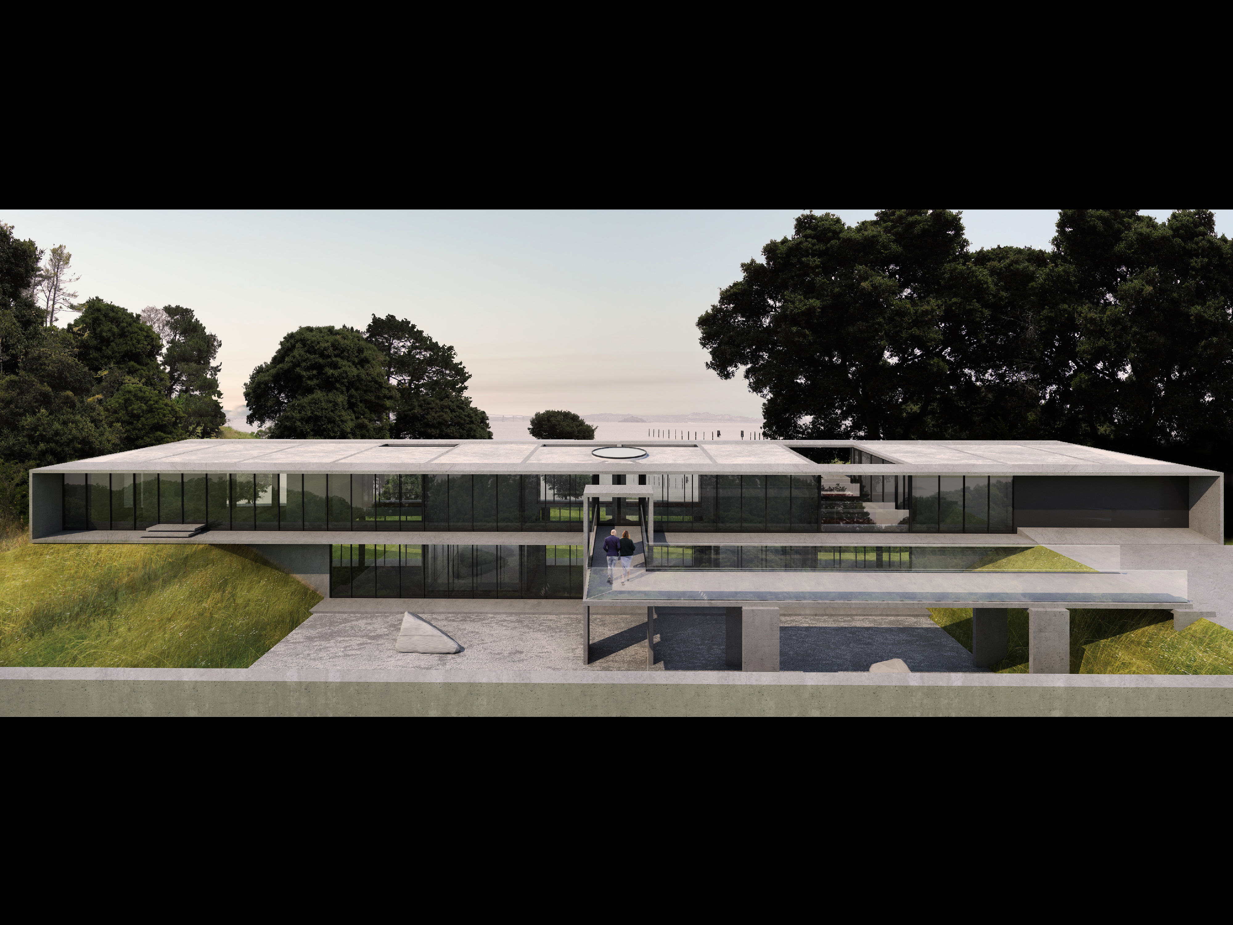 The building is a long bar, filling a saddle in the landscape. The arrival and entry are on the upper level via a bridge, which through a hole in the bar, view the San Rafael Bridge across the Bay. From the two story entry, a stair spirals down to lower level and water.