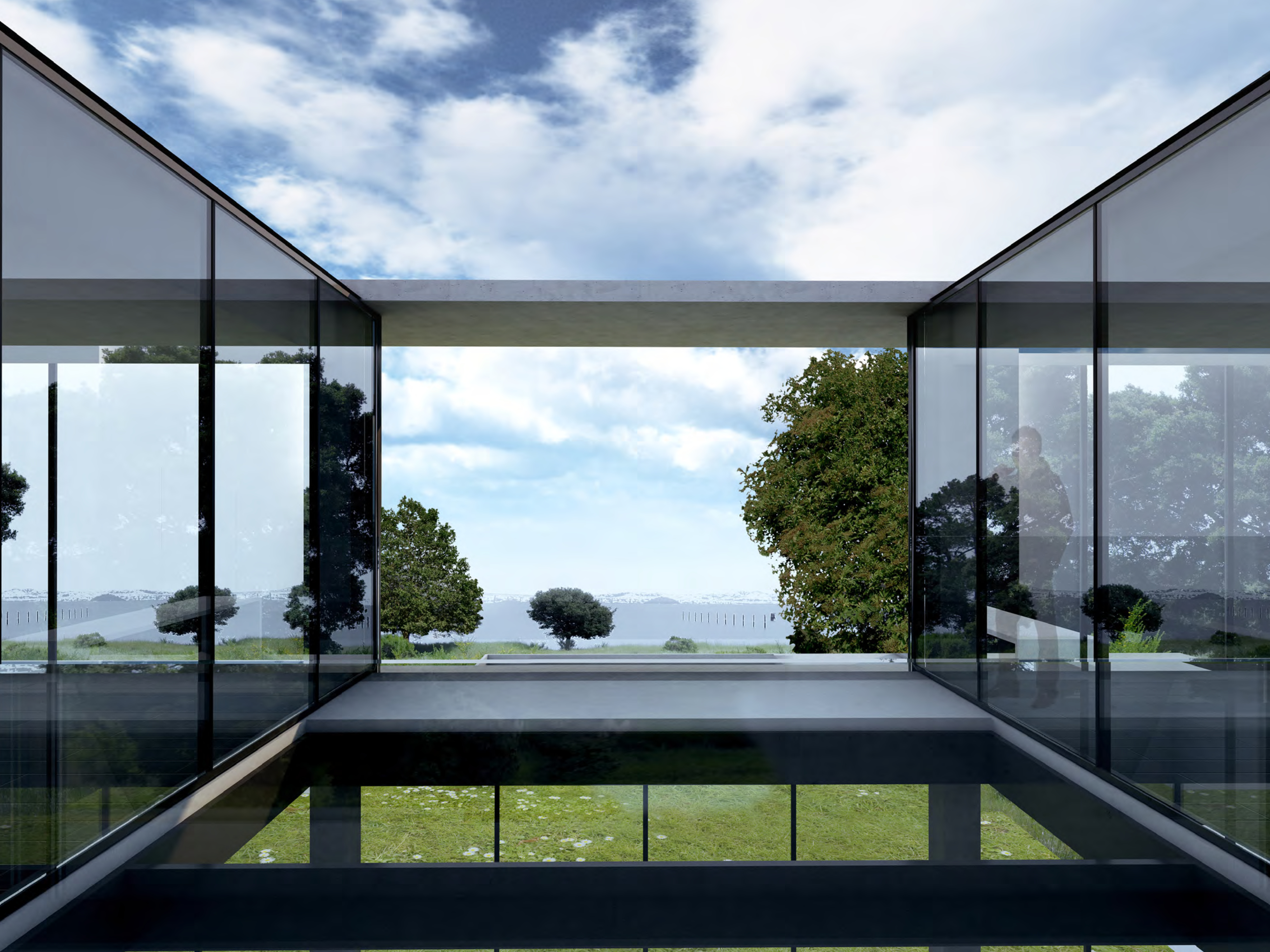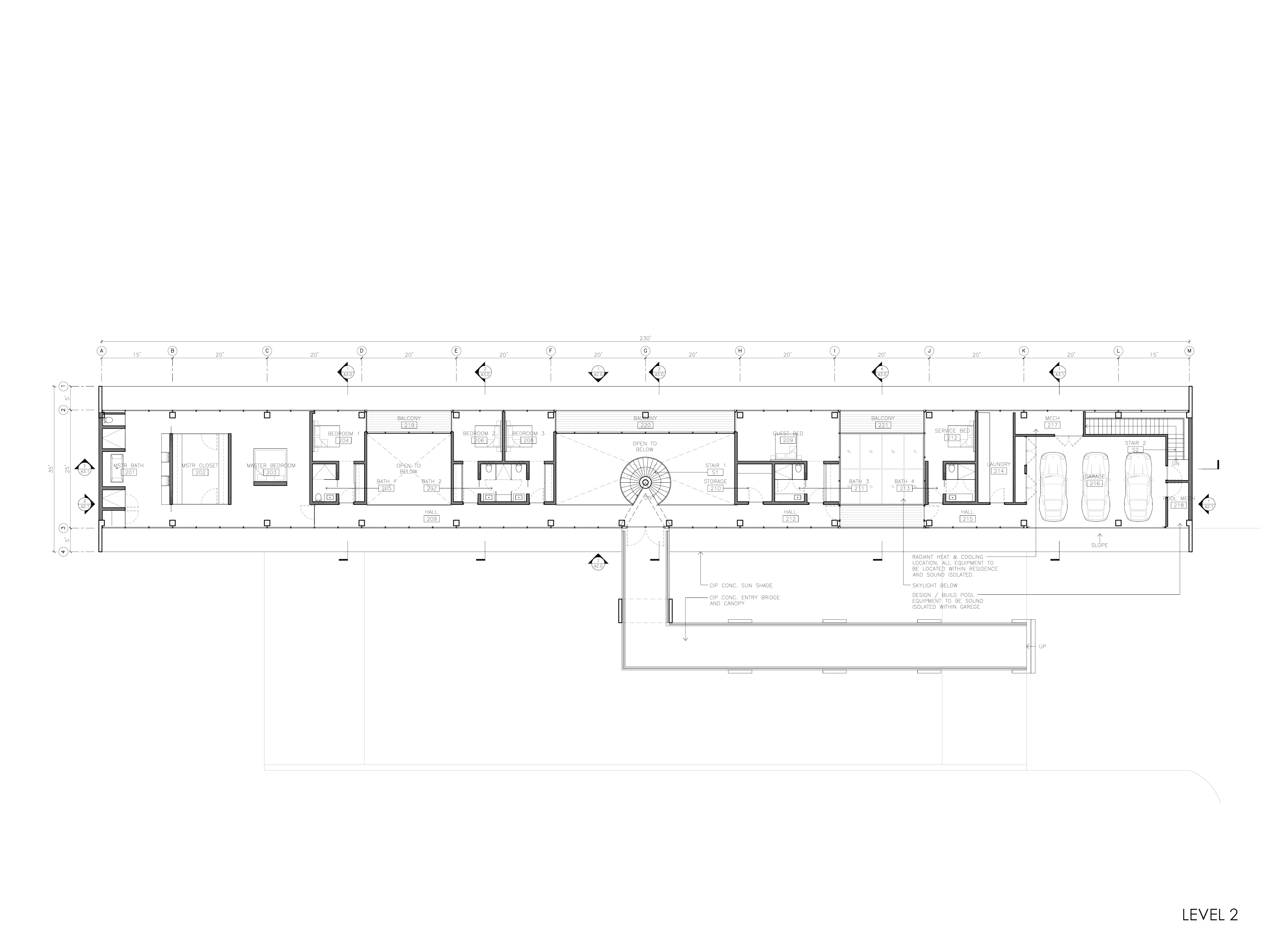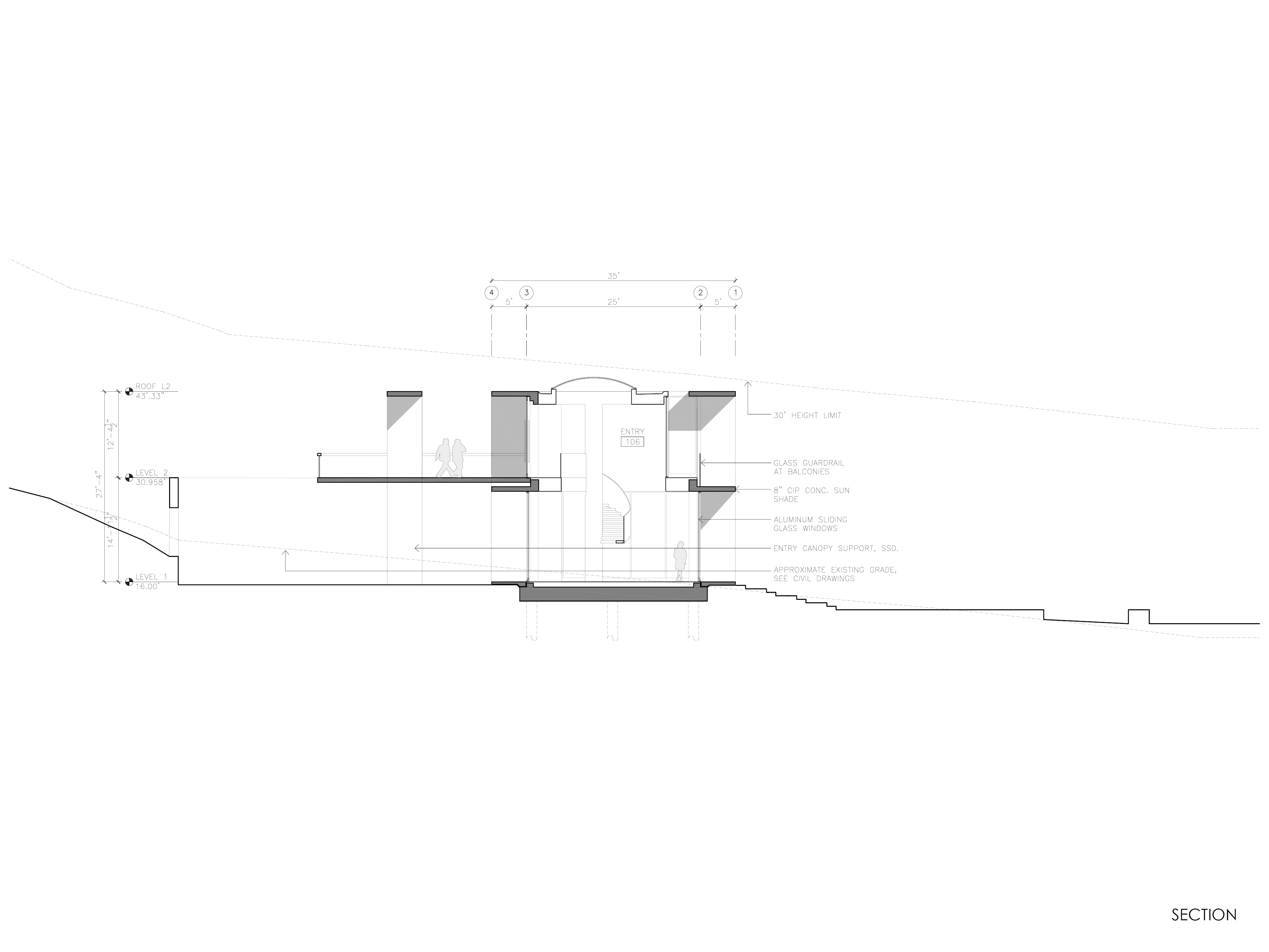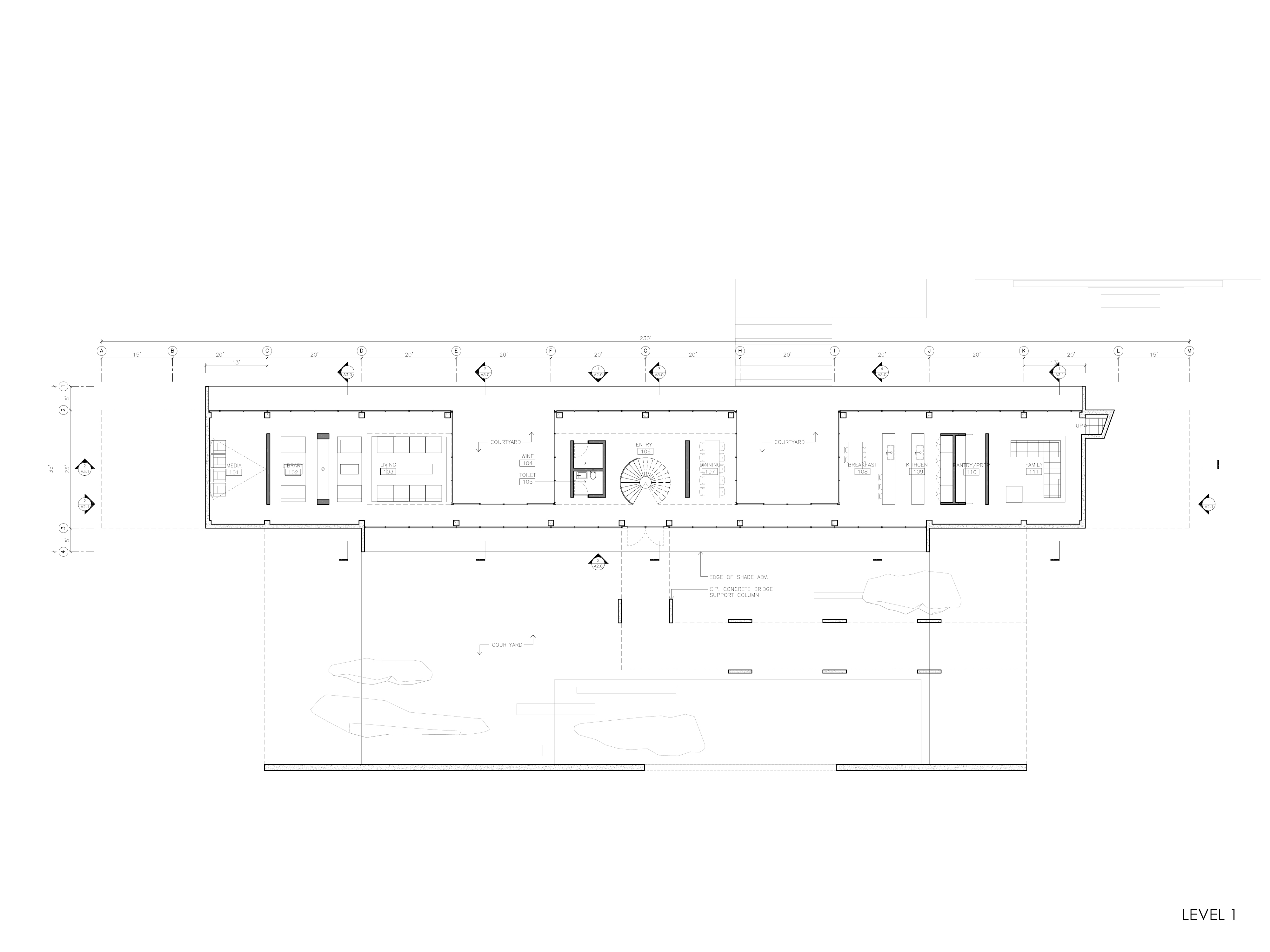 The building is a long bar, filling a saddle in the landscape. The arrival and entry are on the upper level via a bridge, which through a hole in the bar, view the San Rafael Bridge across the Bay. From the two story entry, a stair spirals down to lower level and water.