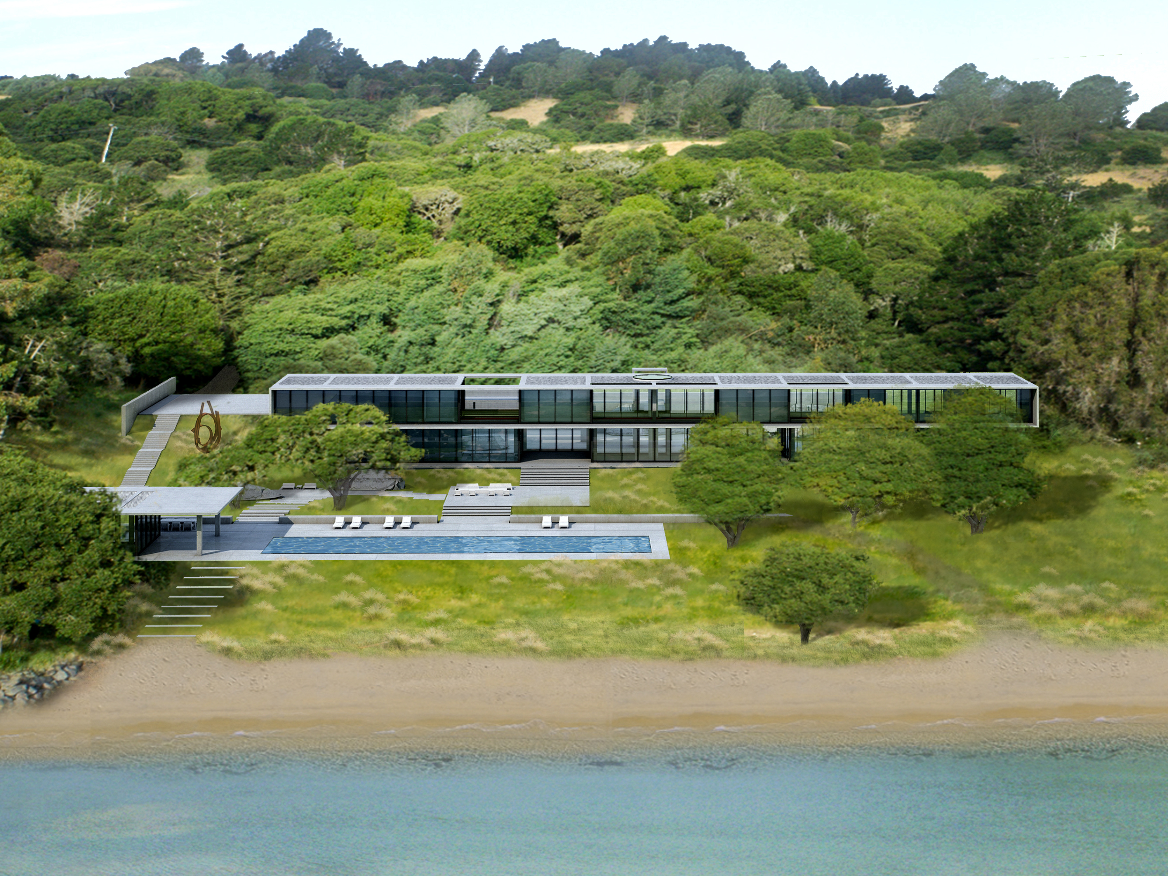 All the public spaces of the house are located on the lower level, terracing down to the beach and bay on one side, and to the hills and mountains on the other.