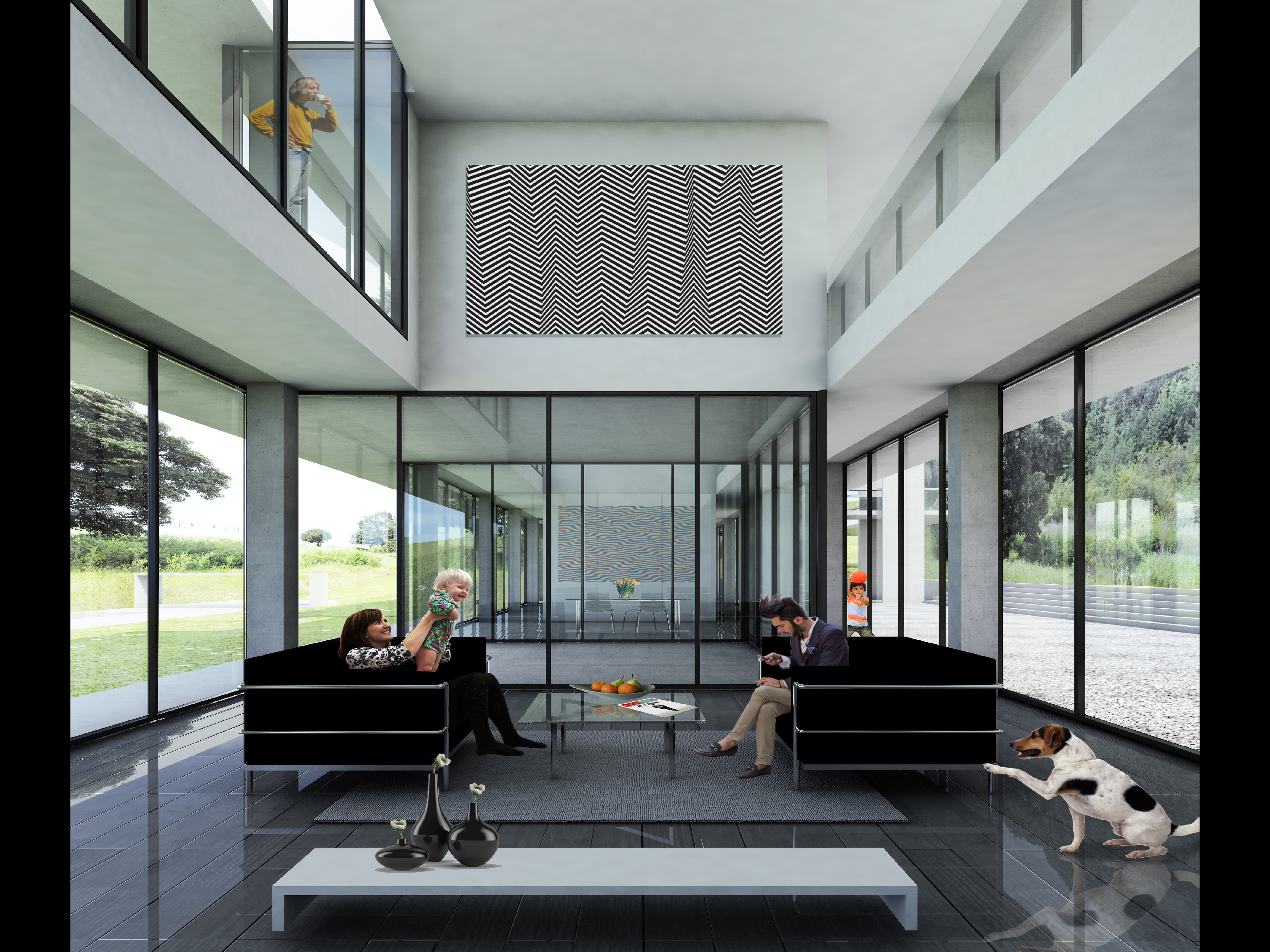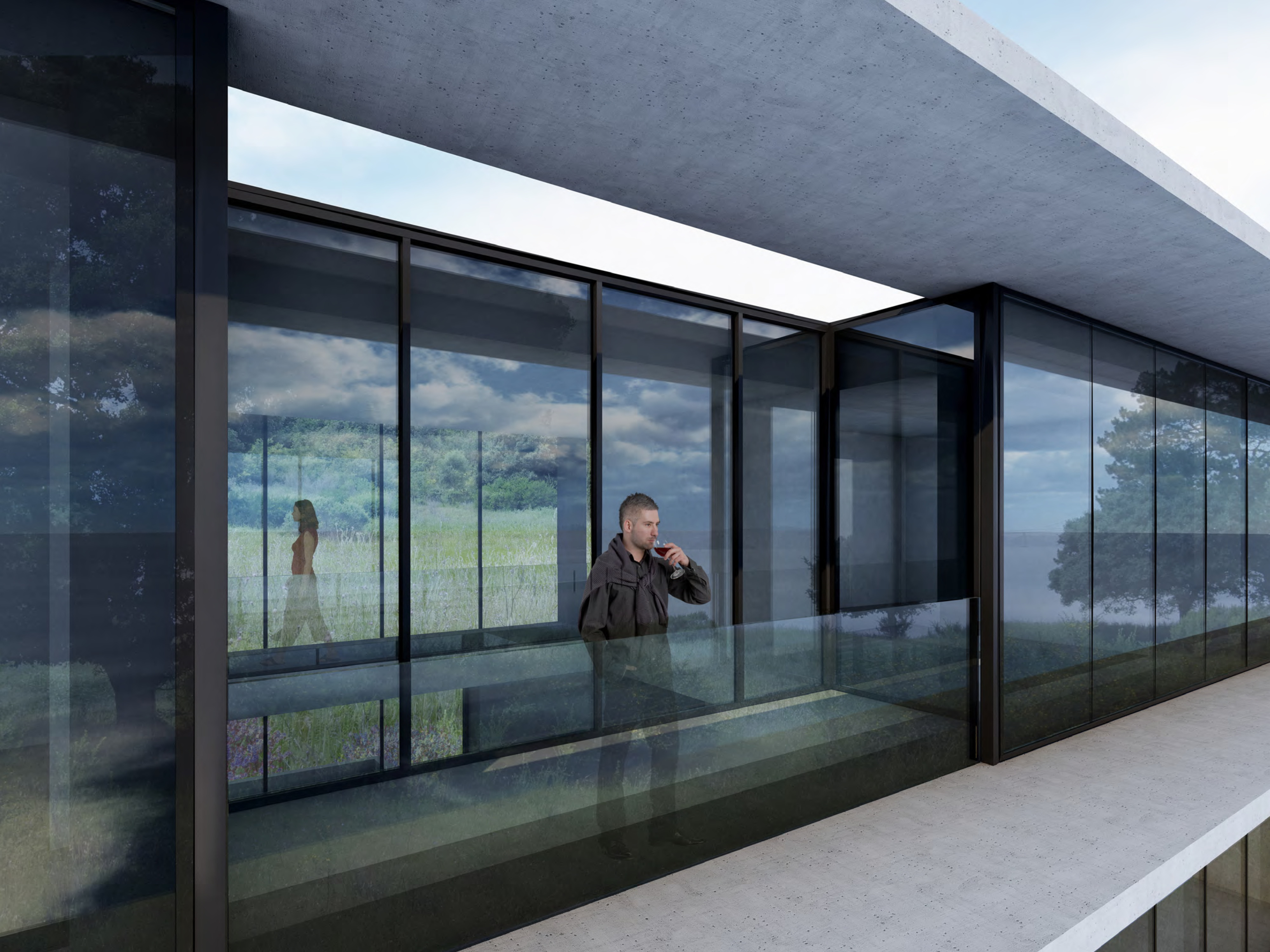 Along the length of the bar, incised courts and decks merge inside and outside.