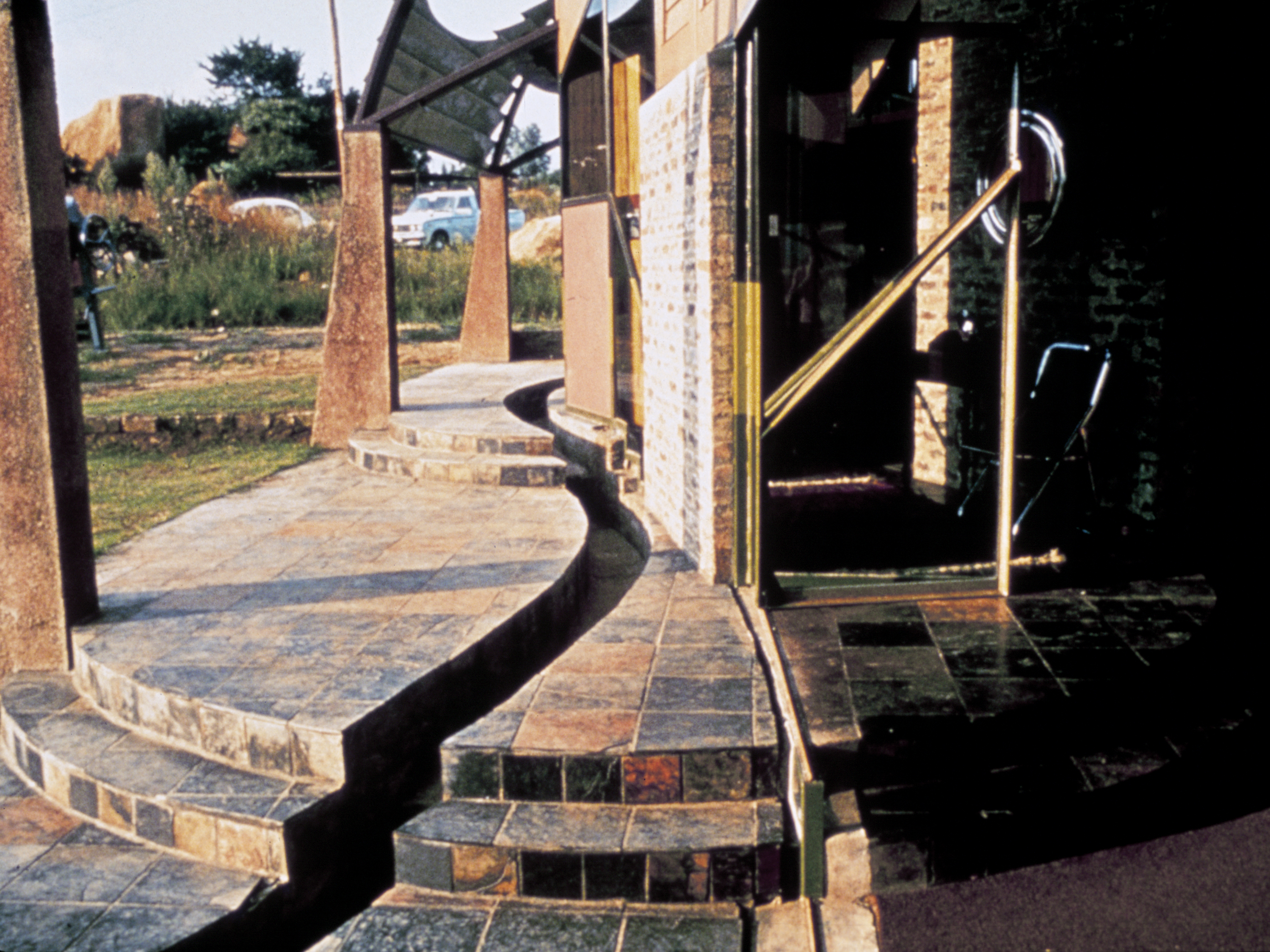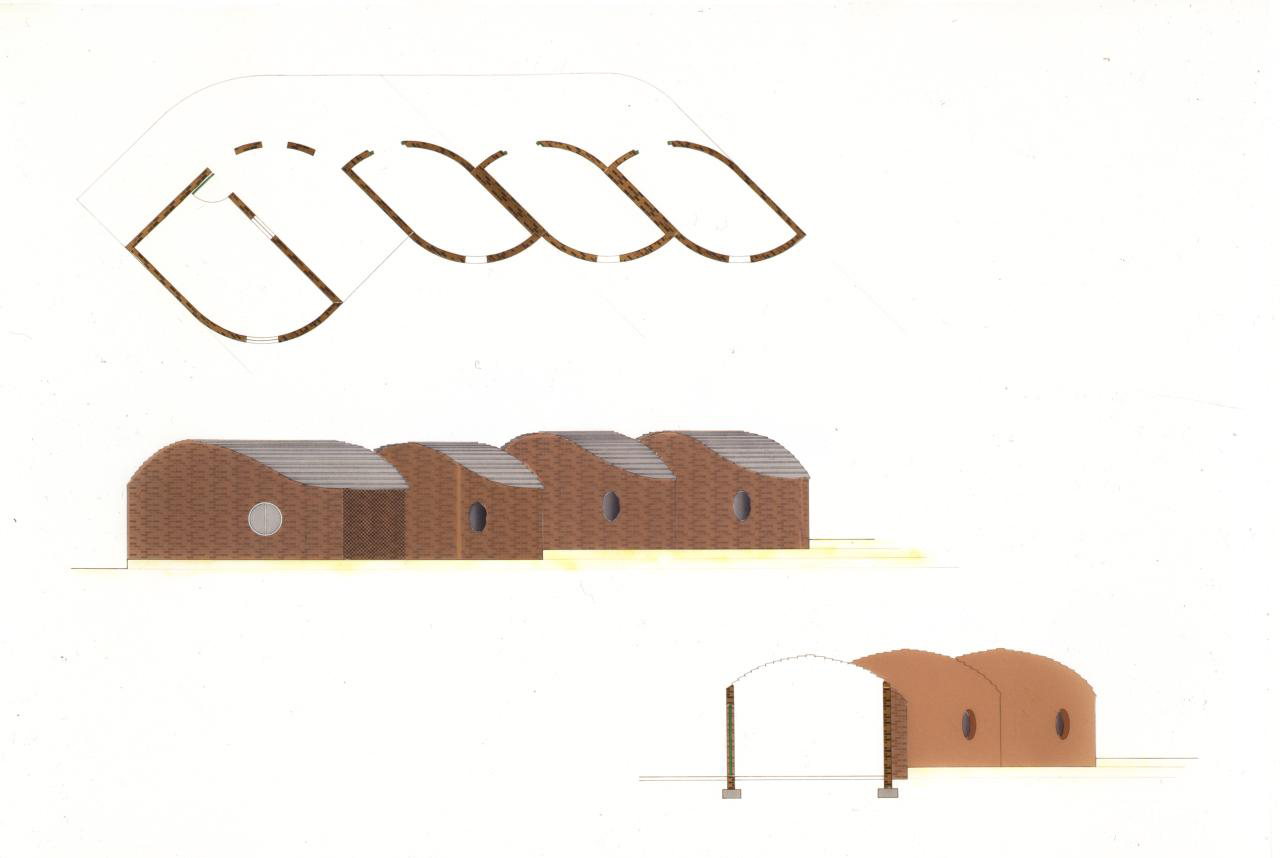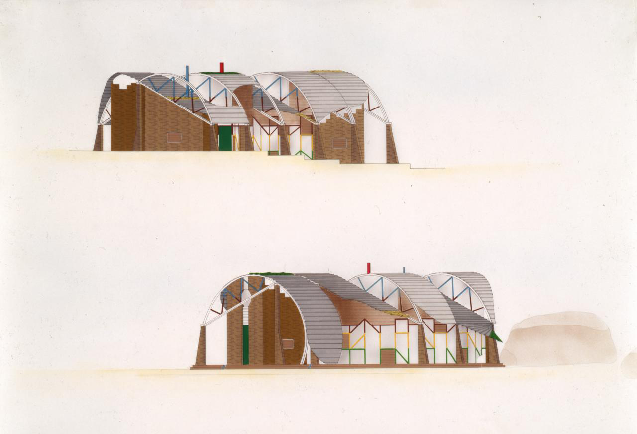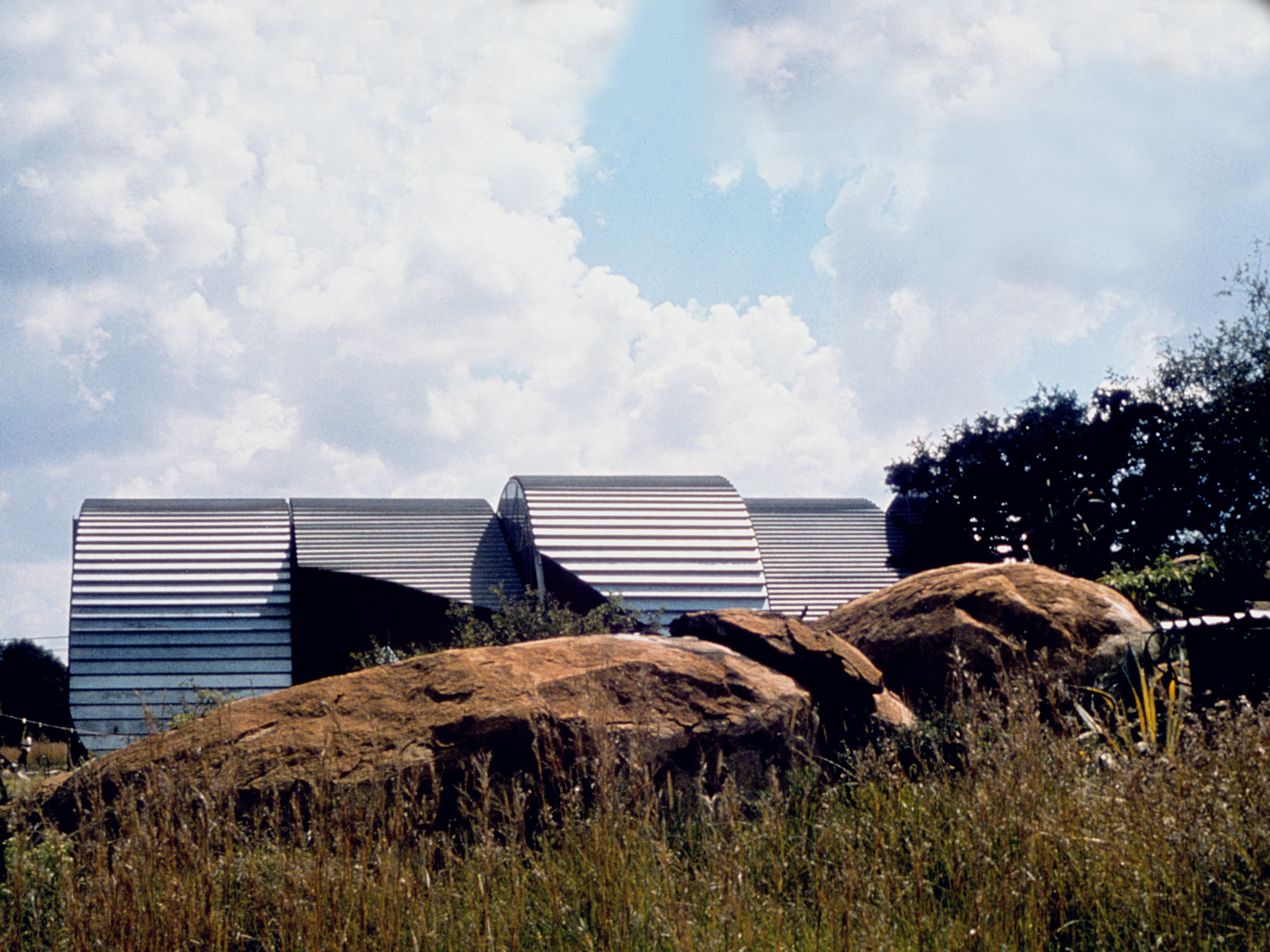The terraces are continuous and sweep up along the rim of the circle as roofs, weaving the ground into the sky, containing in its thickness the sheltered habitable part. The trusses open the roof to the air, whose hollowness supports the space, traps the clouds, pours off the rains. The circle of the buildings walling the oasis are, beginning at the rocks, the house, workshop and garage, the cottage, three huts loosely woven with the earth, the historic antecedent N'debelle plan, and the horselike stables.