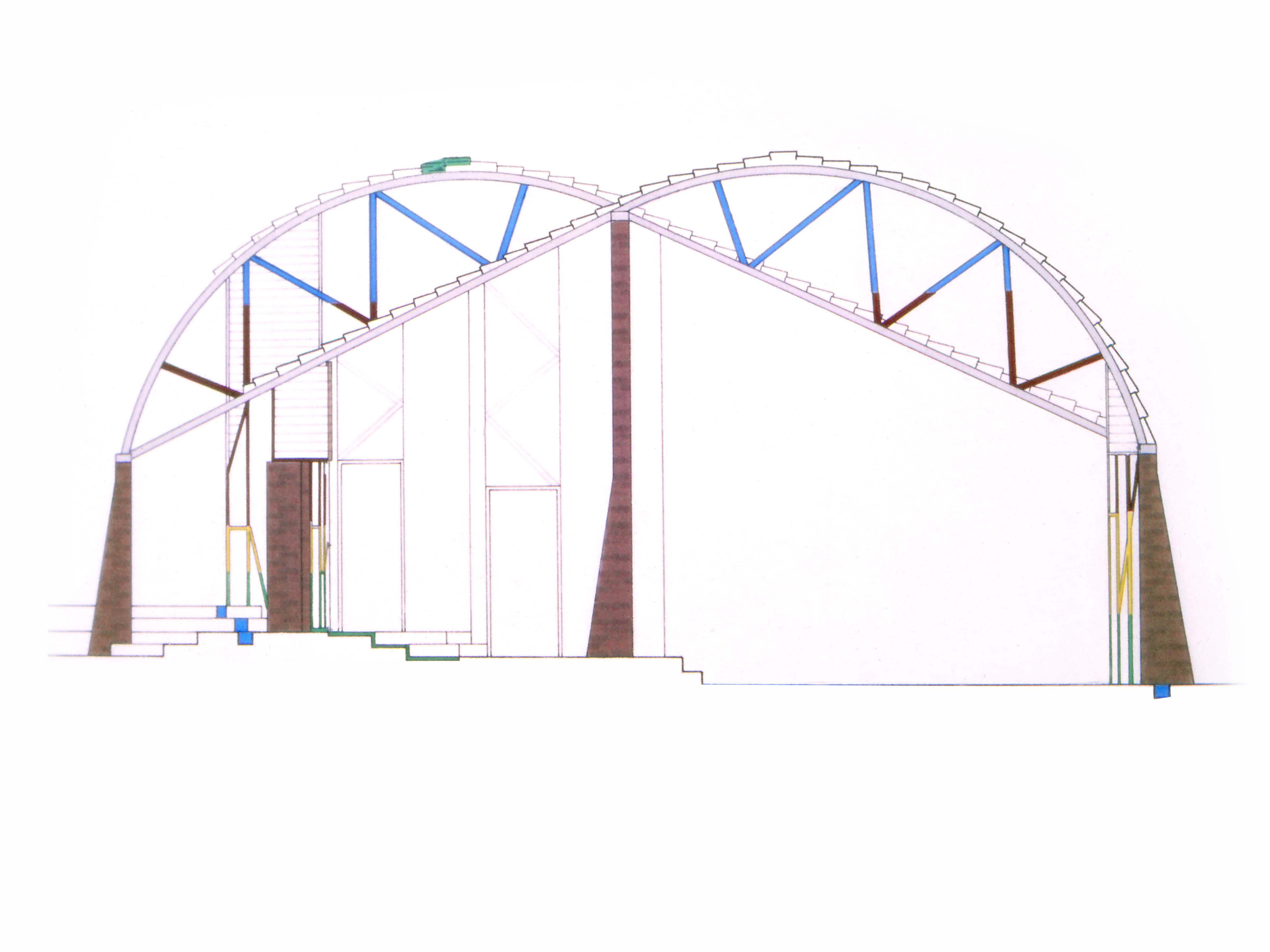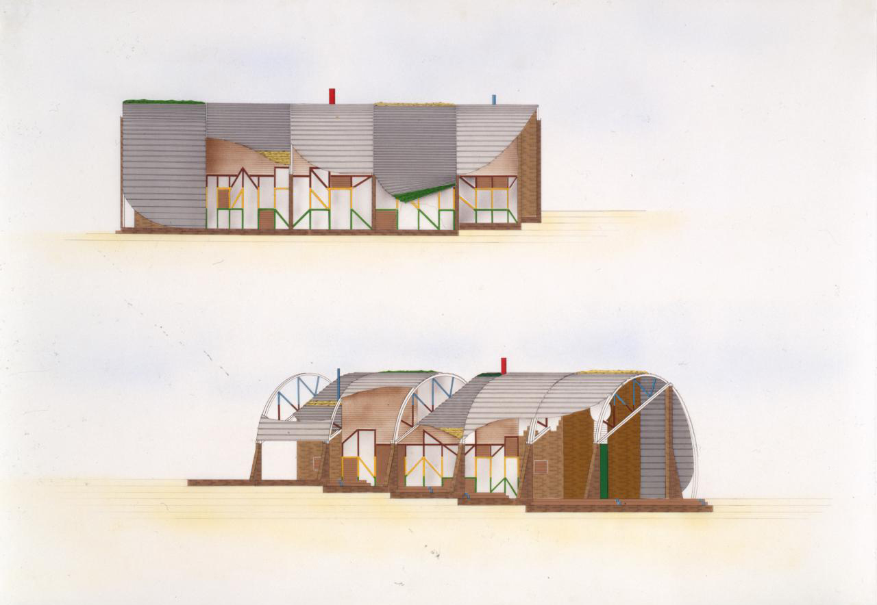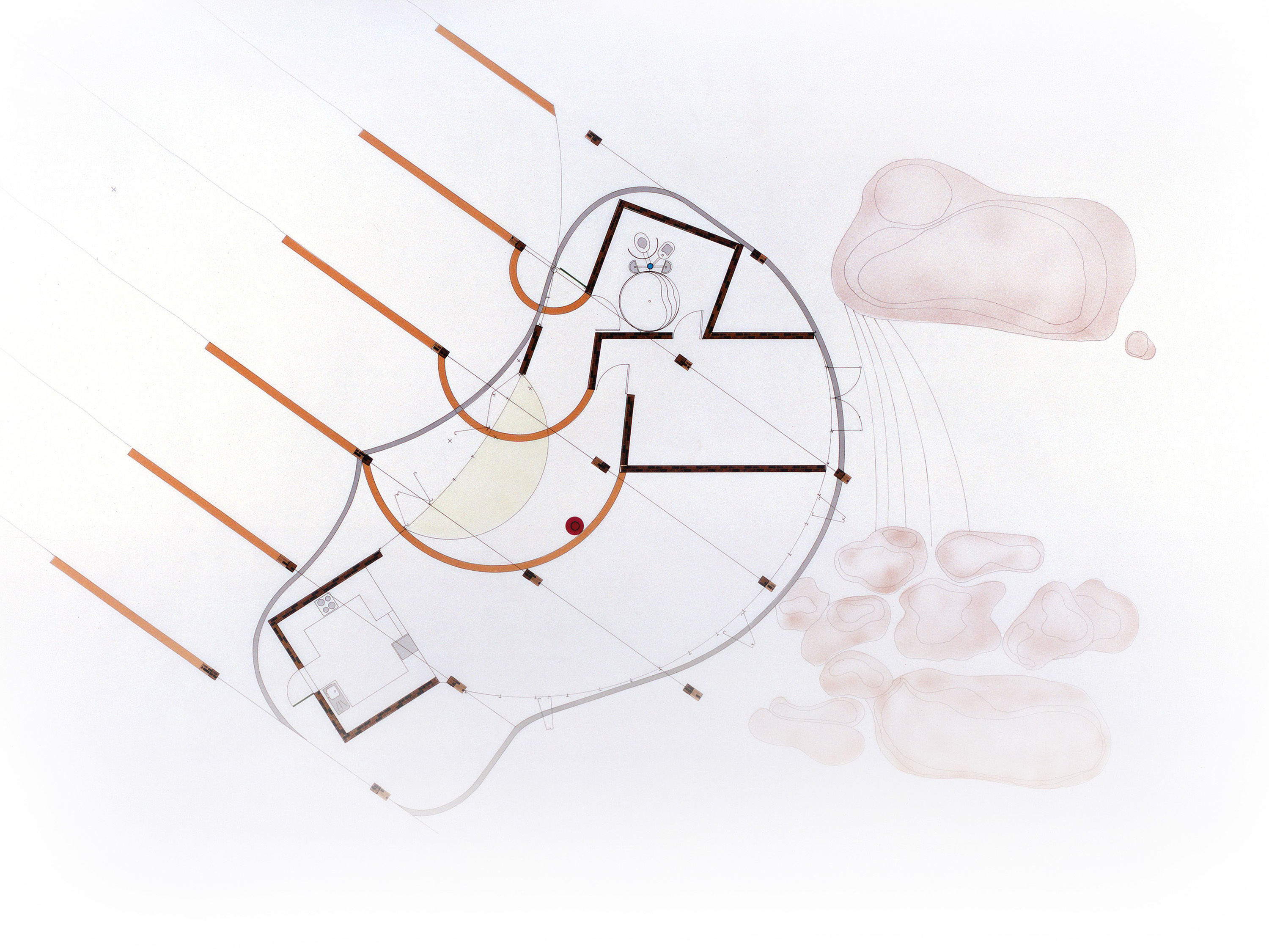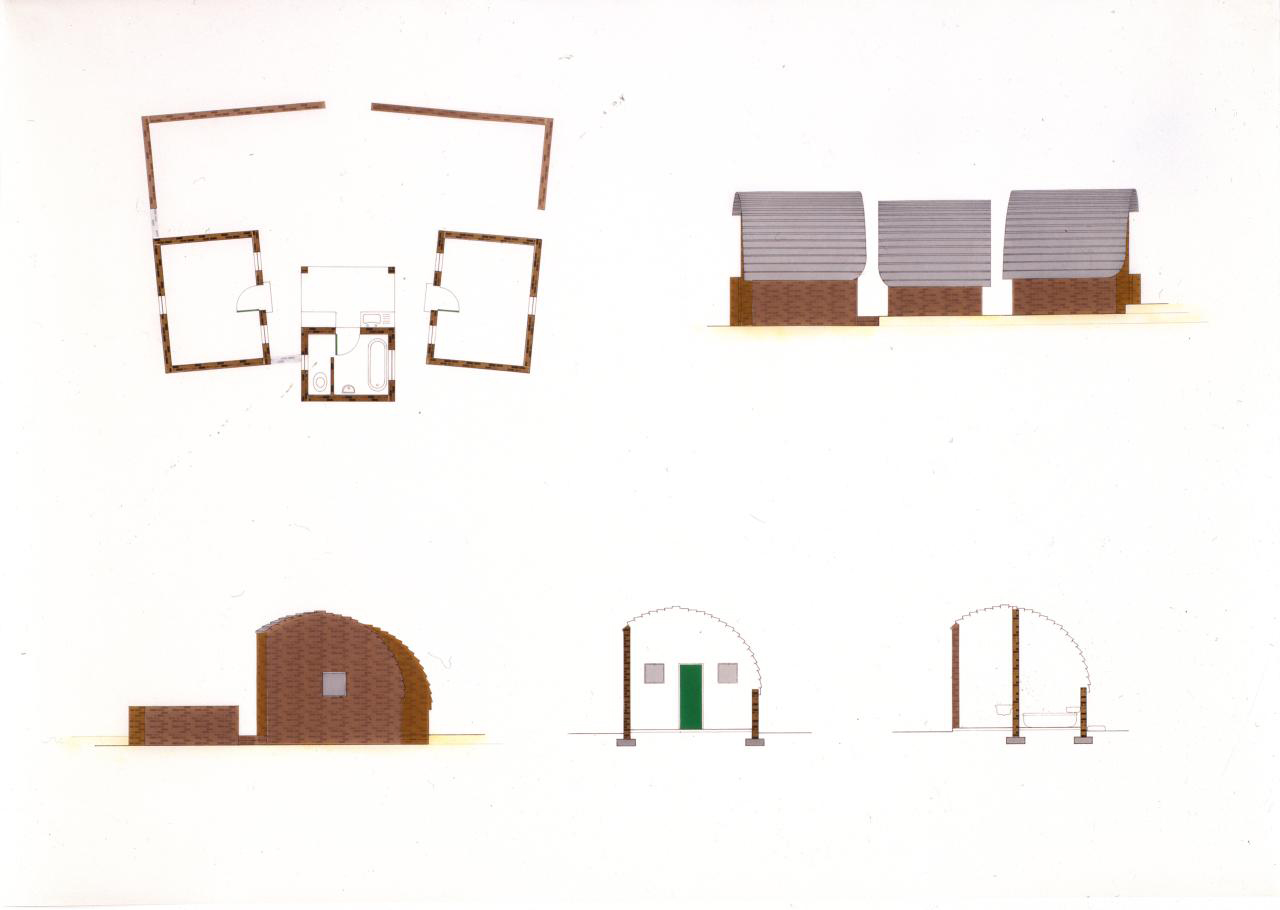 The terraces are continuous and sweep up along the rim of the circle as roofs, weaving the ground into the sky, containing in its thickness the sheltered habitable part. The trusses open the roof to the air, whose hollowness supports the space, traps the clouds, pours off the rains. The circle of the buildings walling the oasis are, beginning at the rocks, the house, workshop and garage, the cottage, three huts loosely woven with the earth, the historic antecedent N'debelle plan, and the horselike stables.