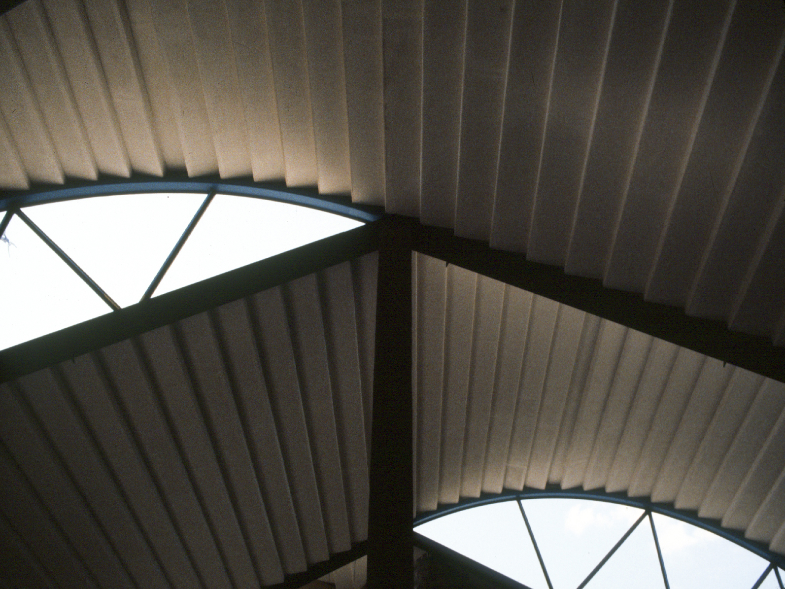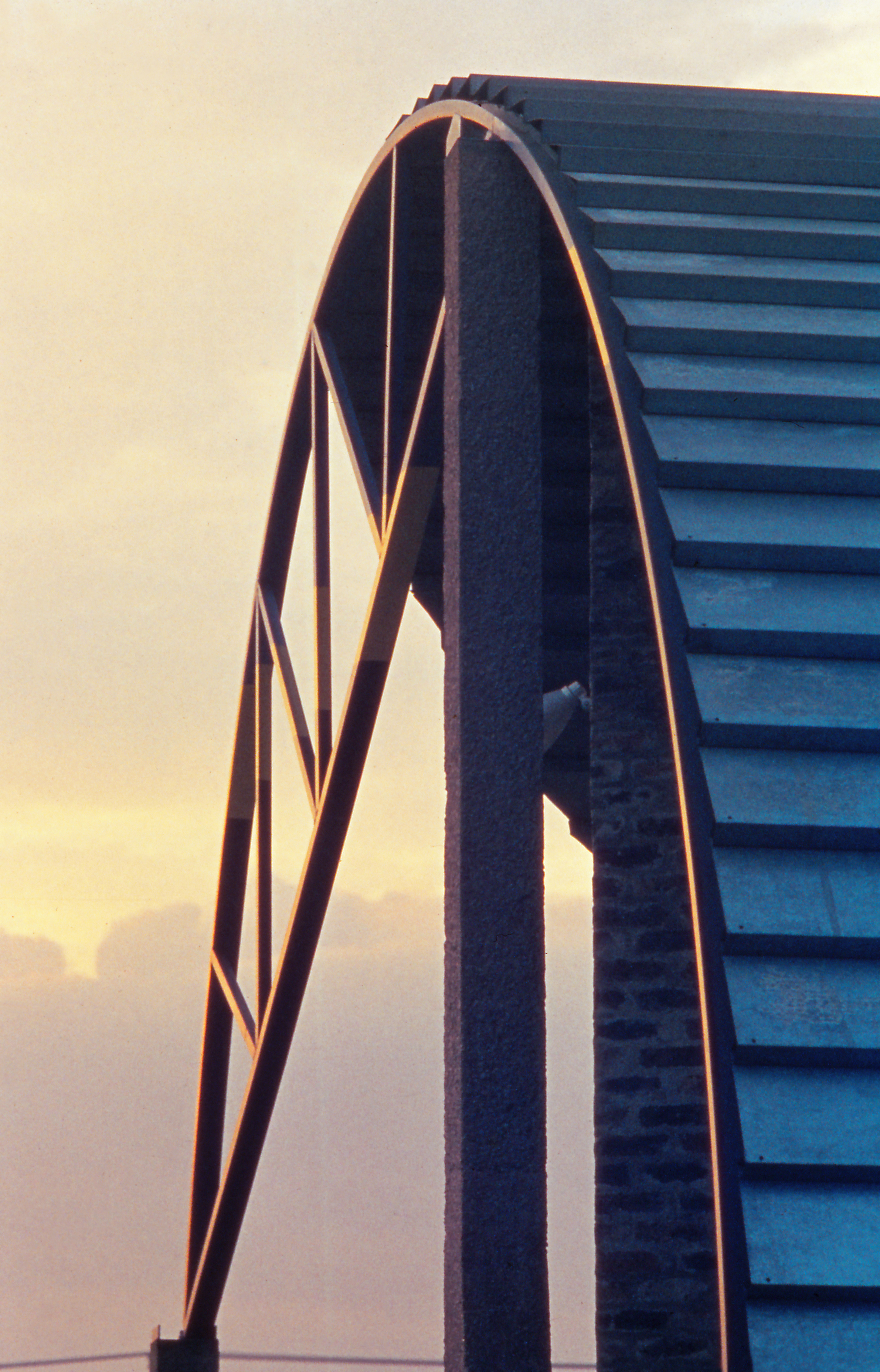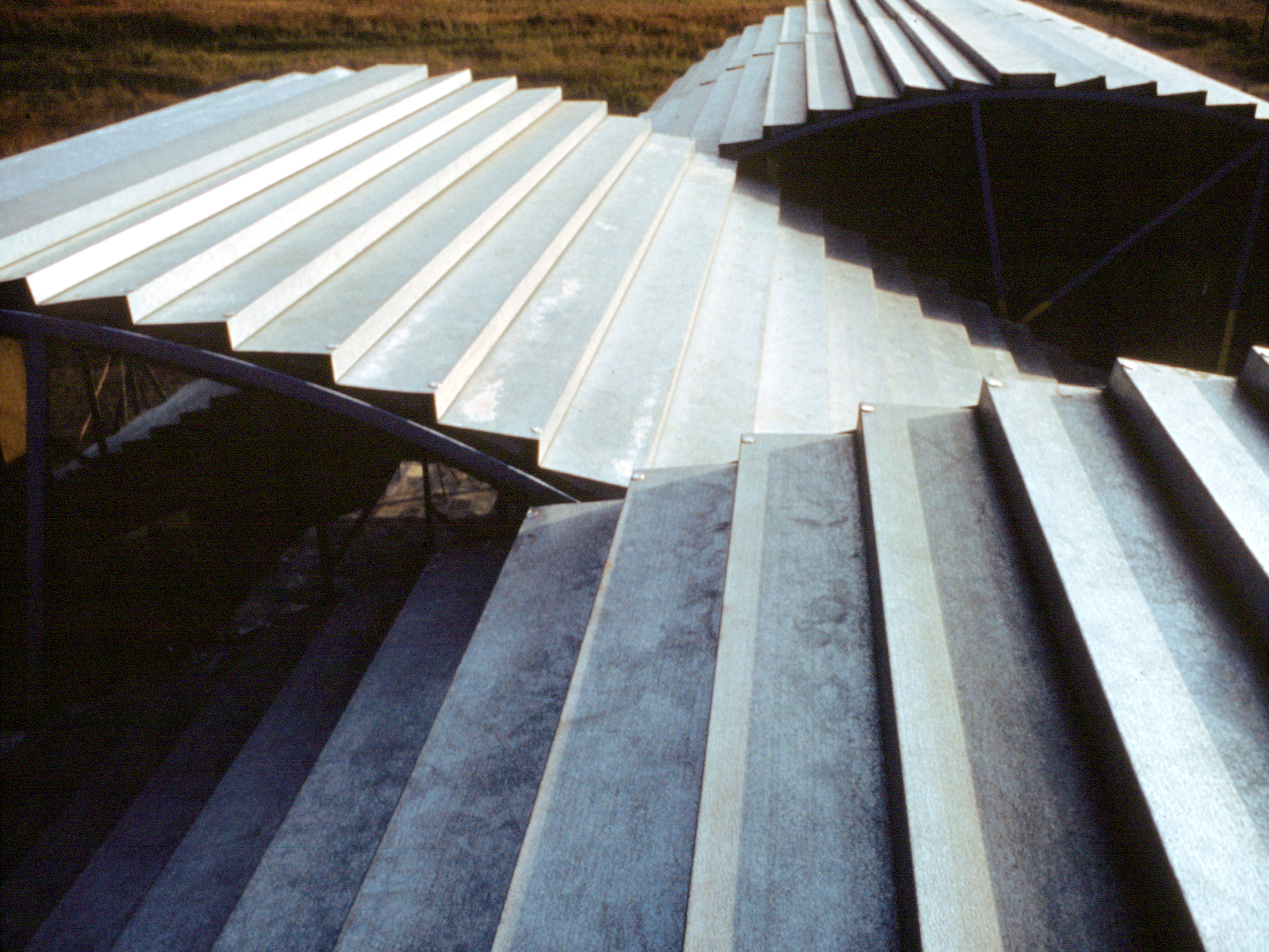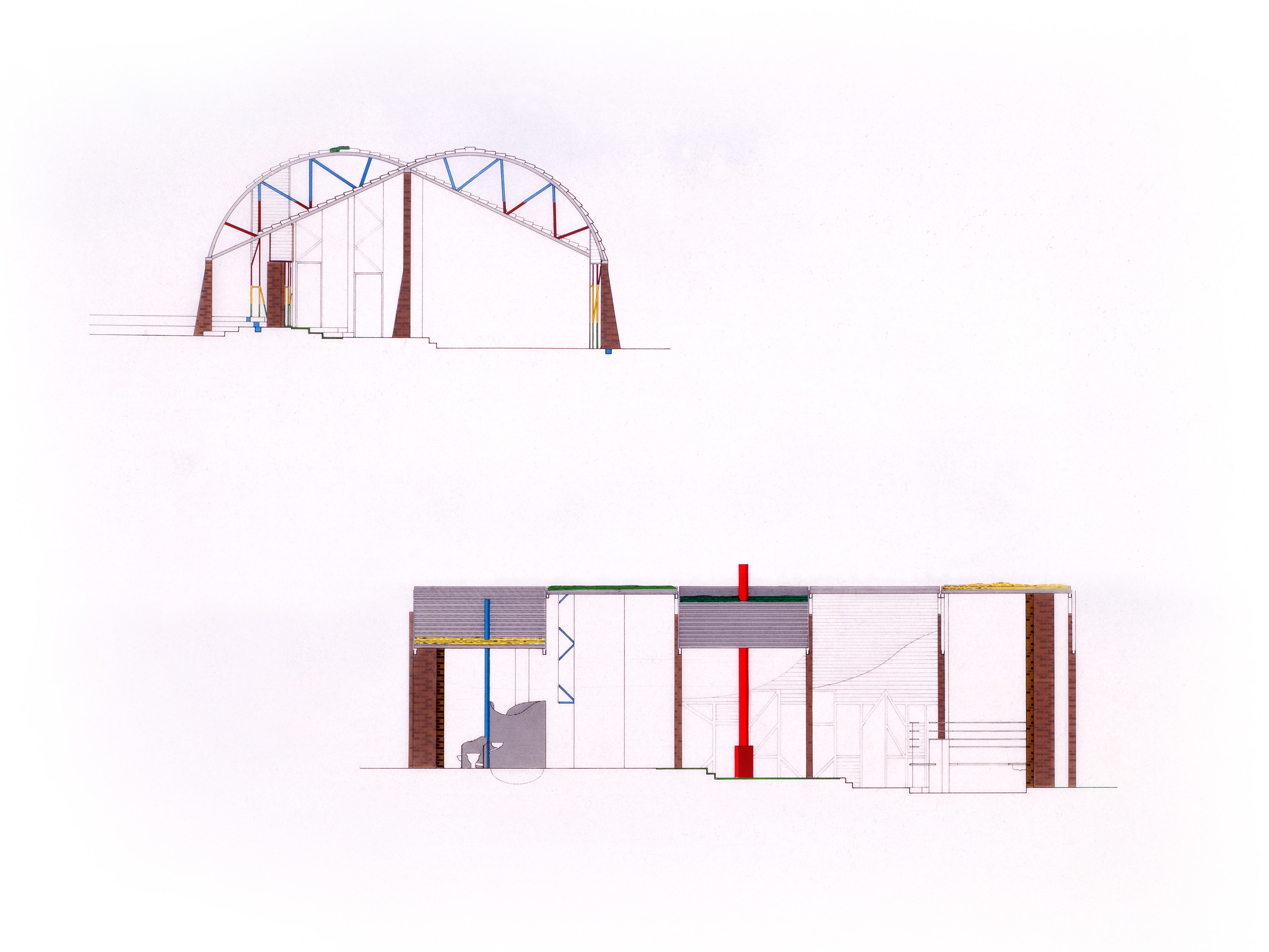 The terraces are continuous and sweep up along the rim of the circle as roofs, weaving the ground into the sky, containing in its thickness the sheltered habitable part. The trusses open the roof to the air, whose hollowness supports the space, traps the clouds, pours off the rains. The circle of the buildings walling the oasis are, beginning at the rocks, the house, workshop and garage, the cottage, three huts loosely woven with the earth, the historic antecedent N'debelle plan, and the horselike stables.