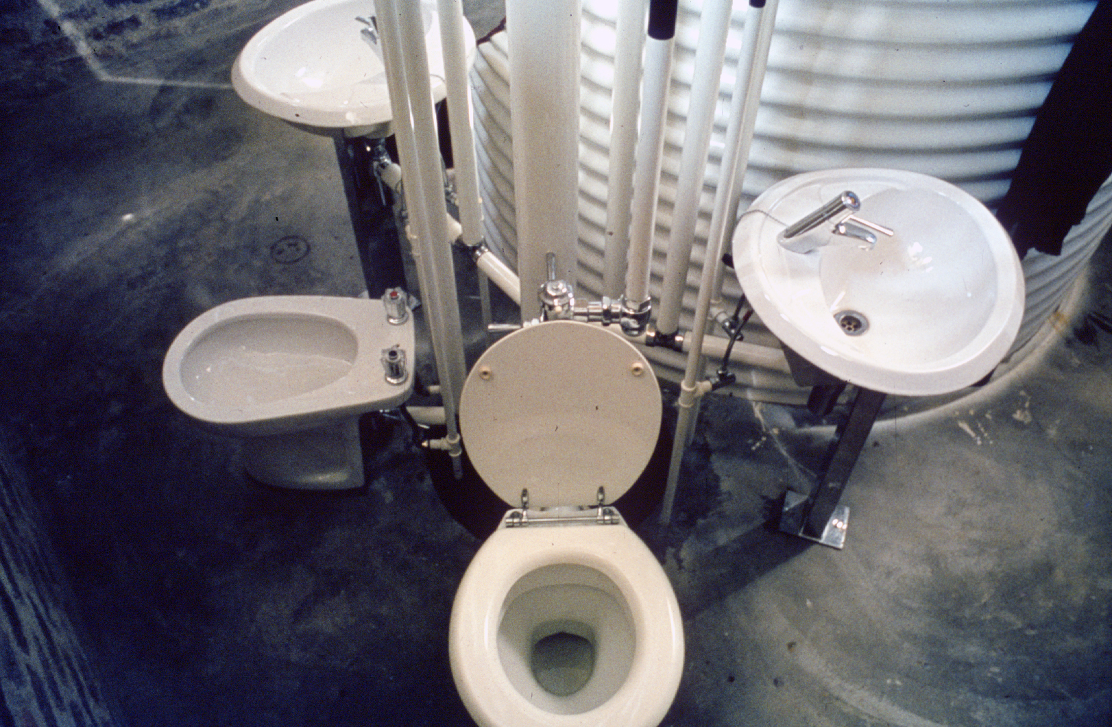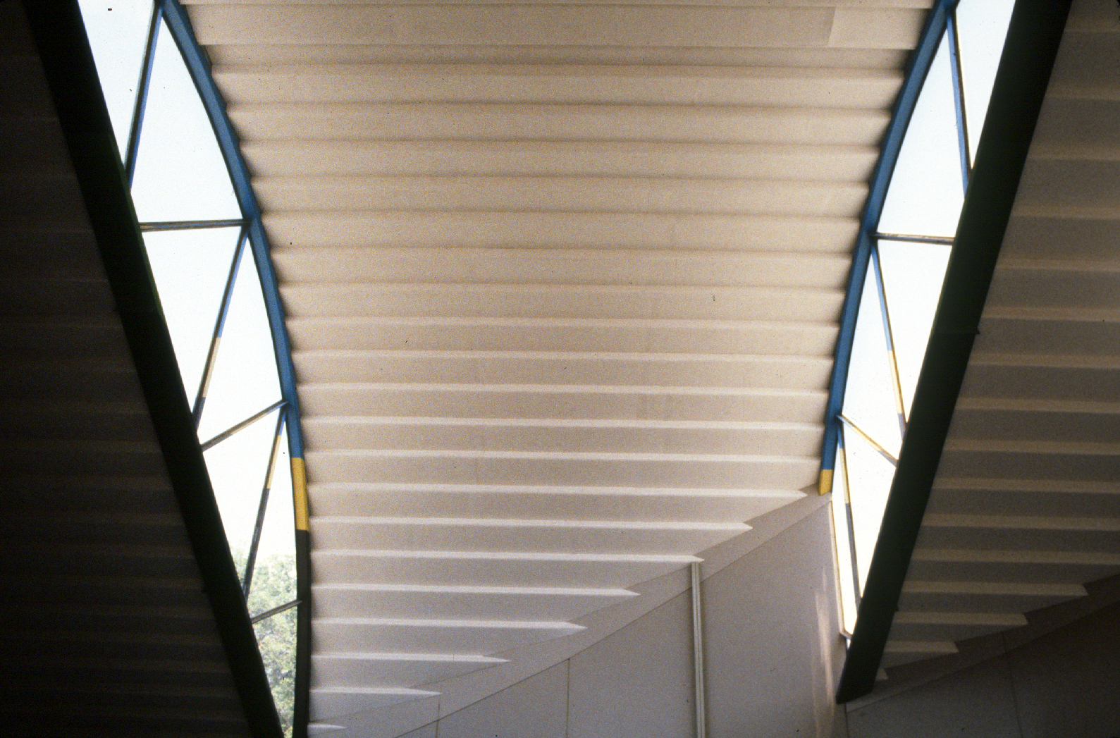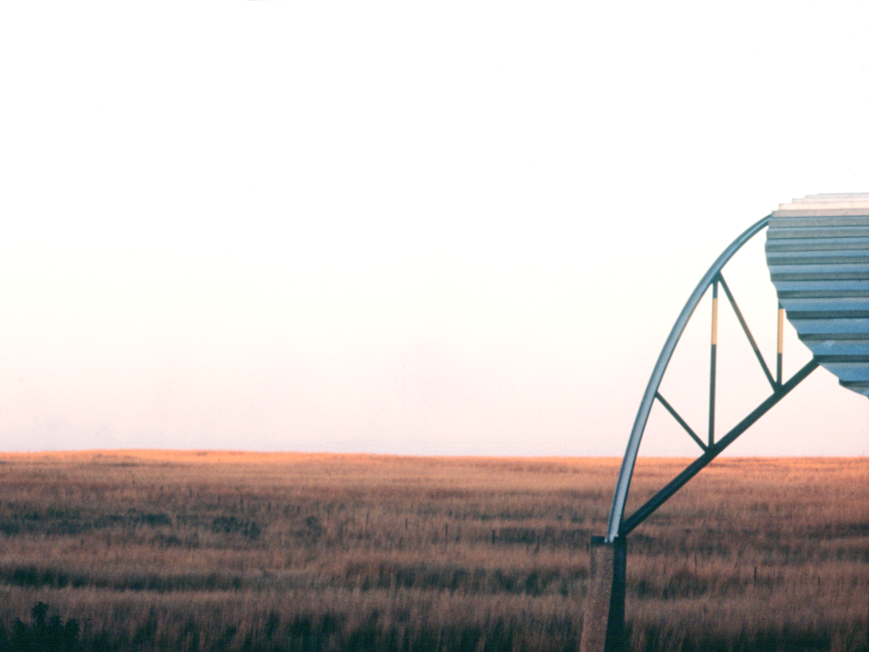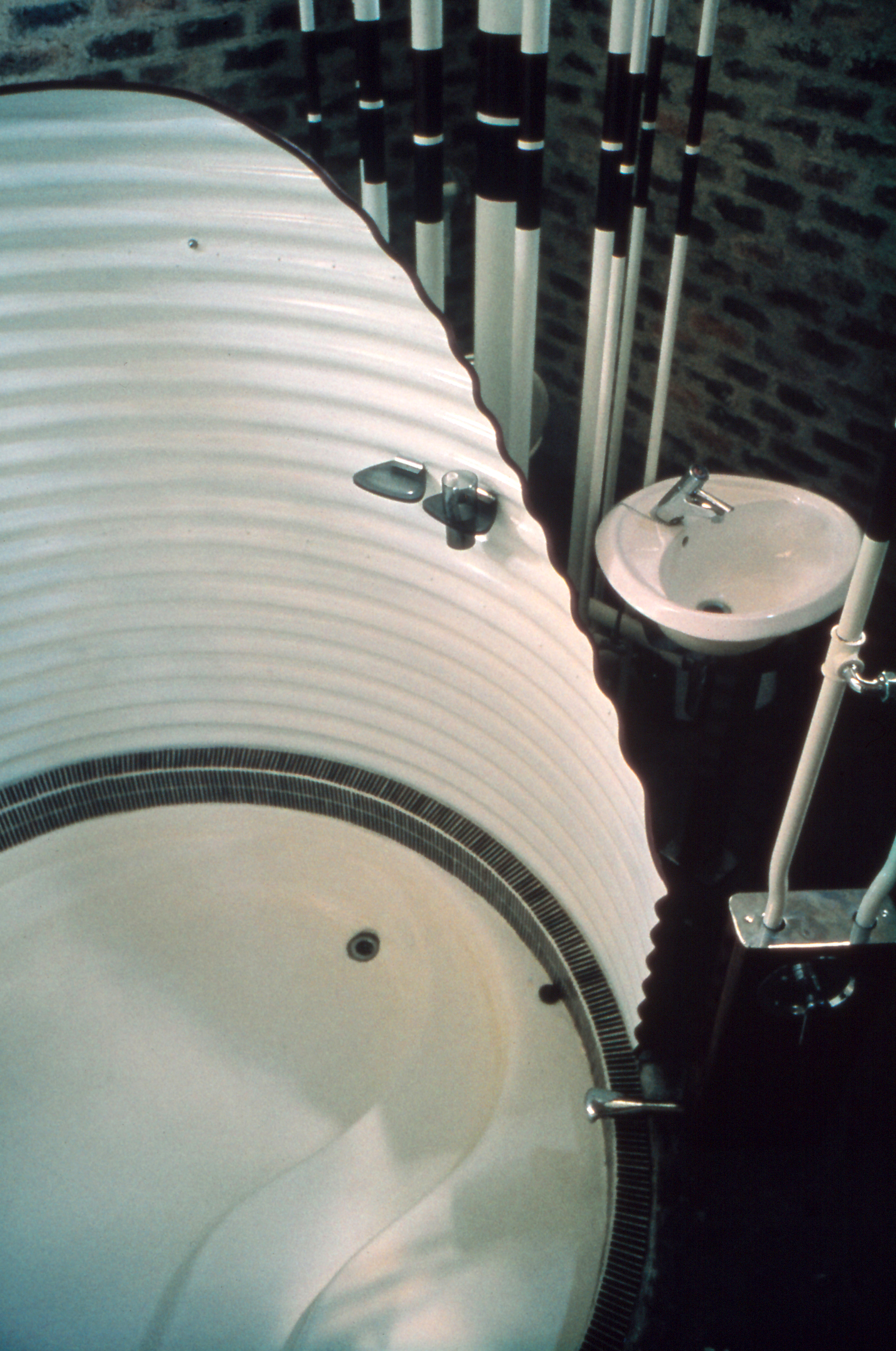 The terraces are continuous and sweep up along the rim of the circle as roofs, weaving the ground into the sky, containing in its thickness the sheltered habitable part. The trusses open the roof to the air, whose hollowness supports the space, traps the clouds, pours off the rains. The circle of the buildings walling the oasis are, beginning at the rocks, the house, workshop and garage, the cottage, three huts loosely woven with the earth, the historic antecedent N'debelle plan, and the horselike stables.