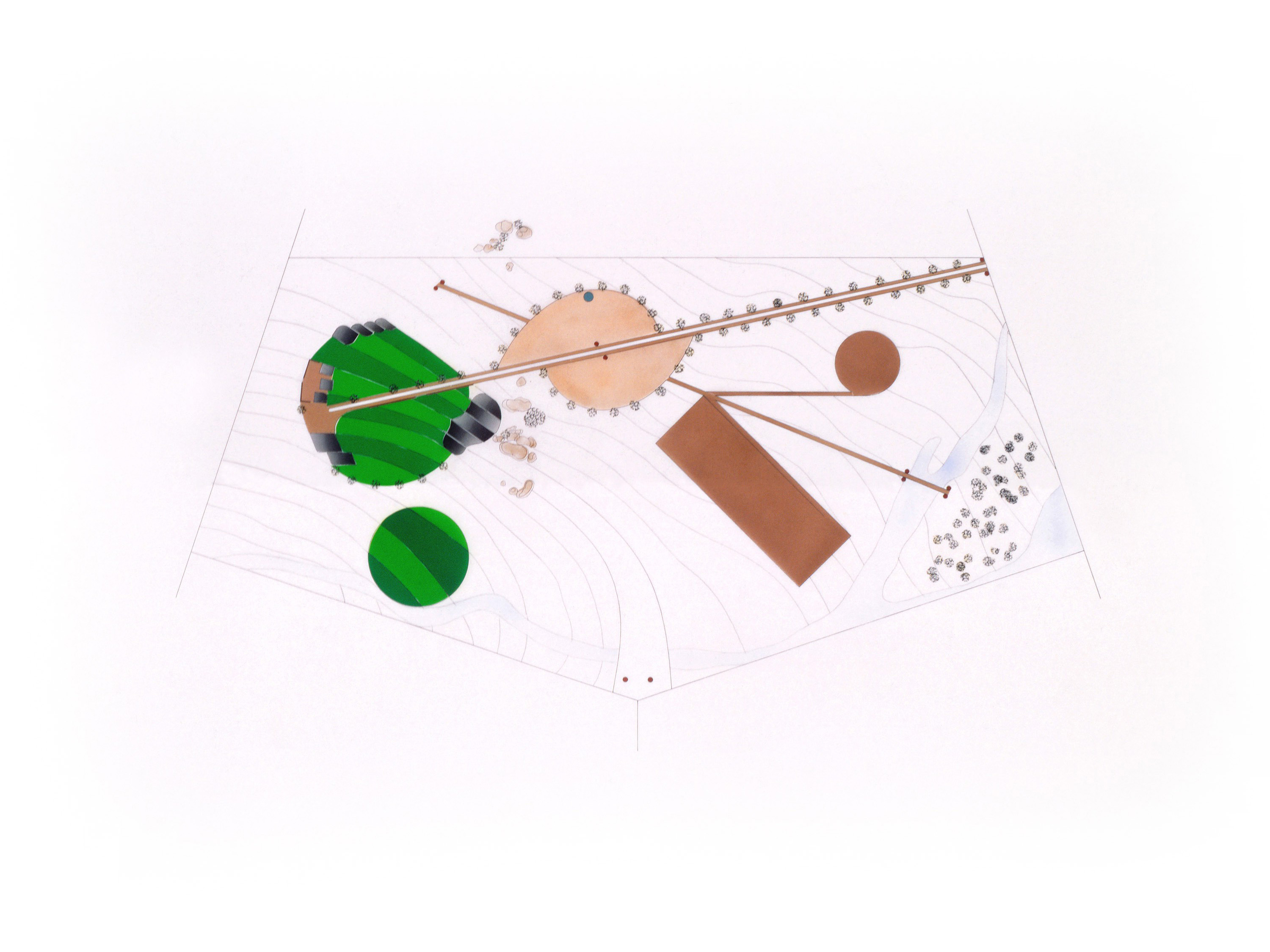 A circle, beginning at the rocks, is marked out on the ground. The contours, man's abstracted interpretation and dimensioning of the landscape, are terraced into the circle, and planted in two alternating strains of grass.