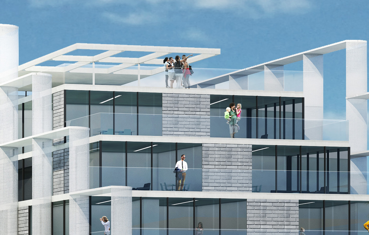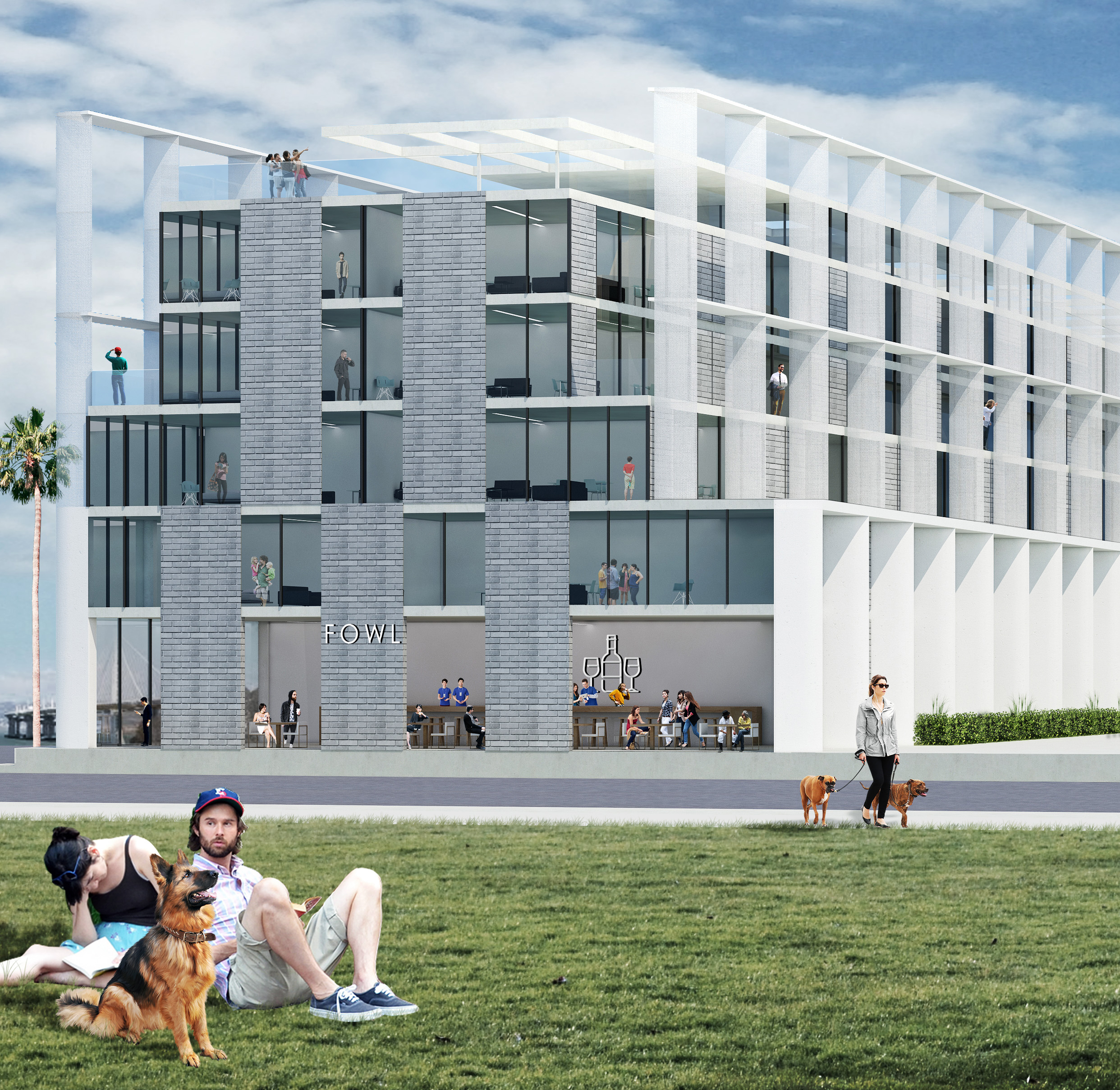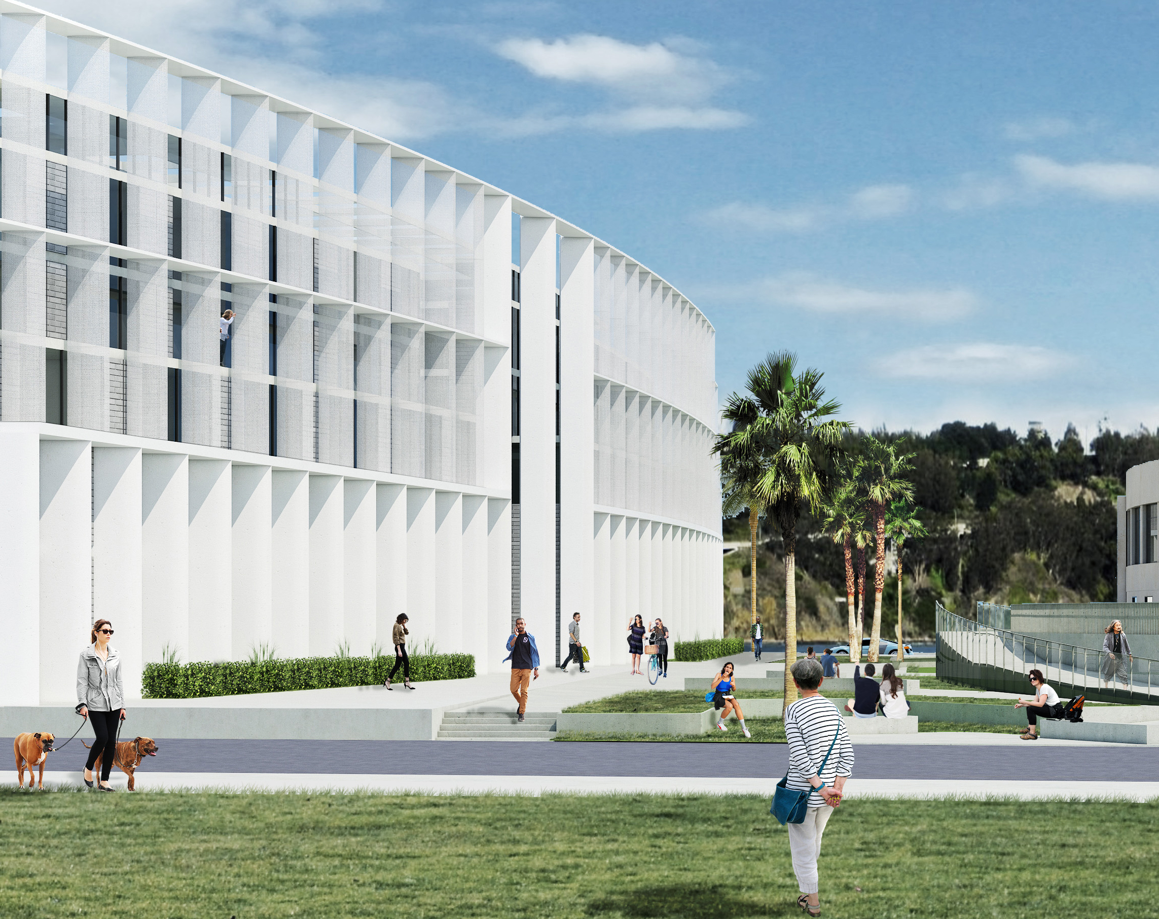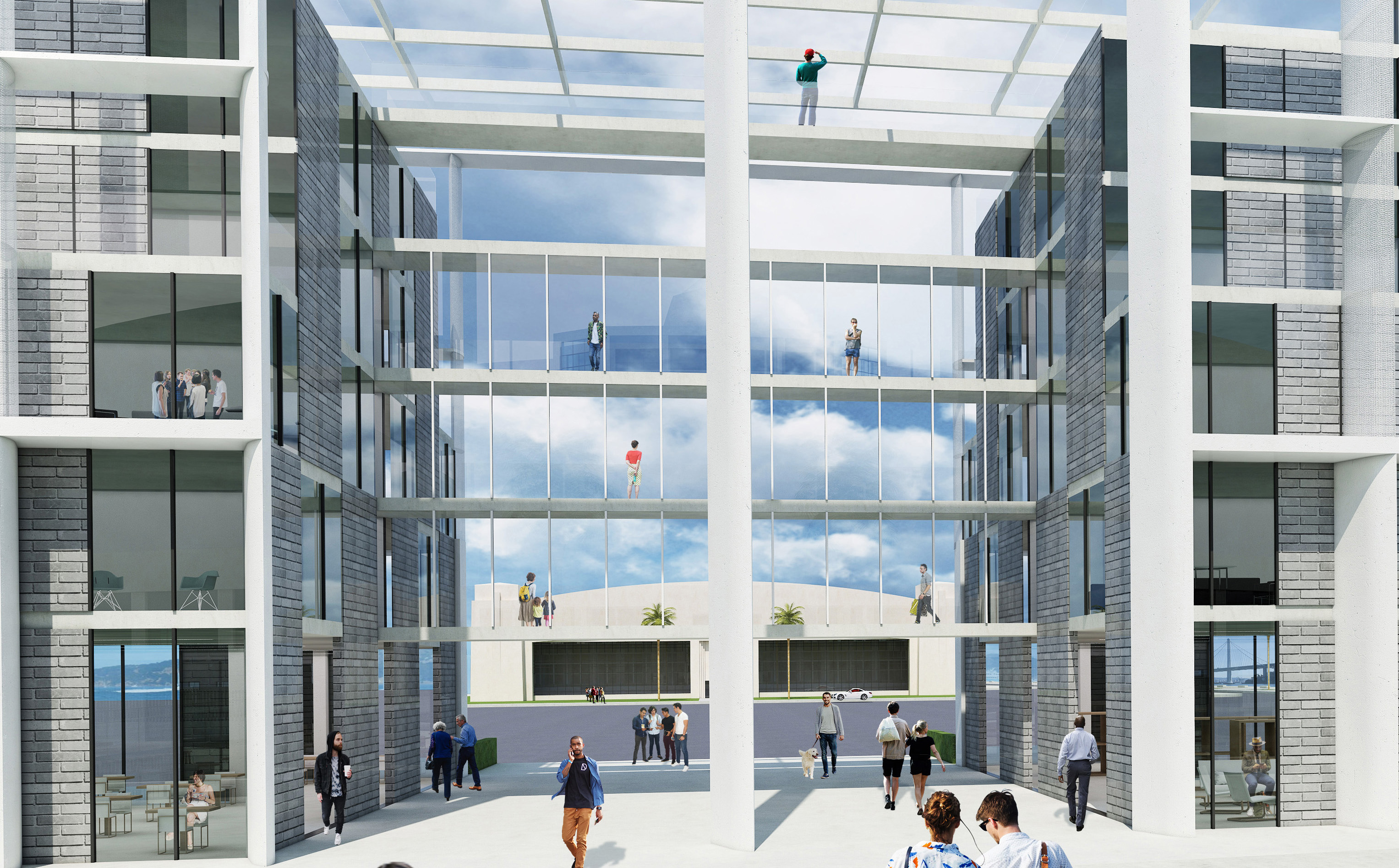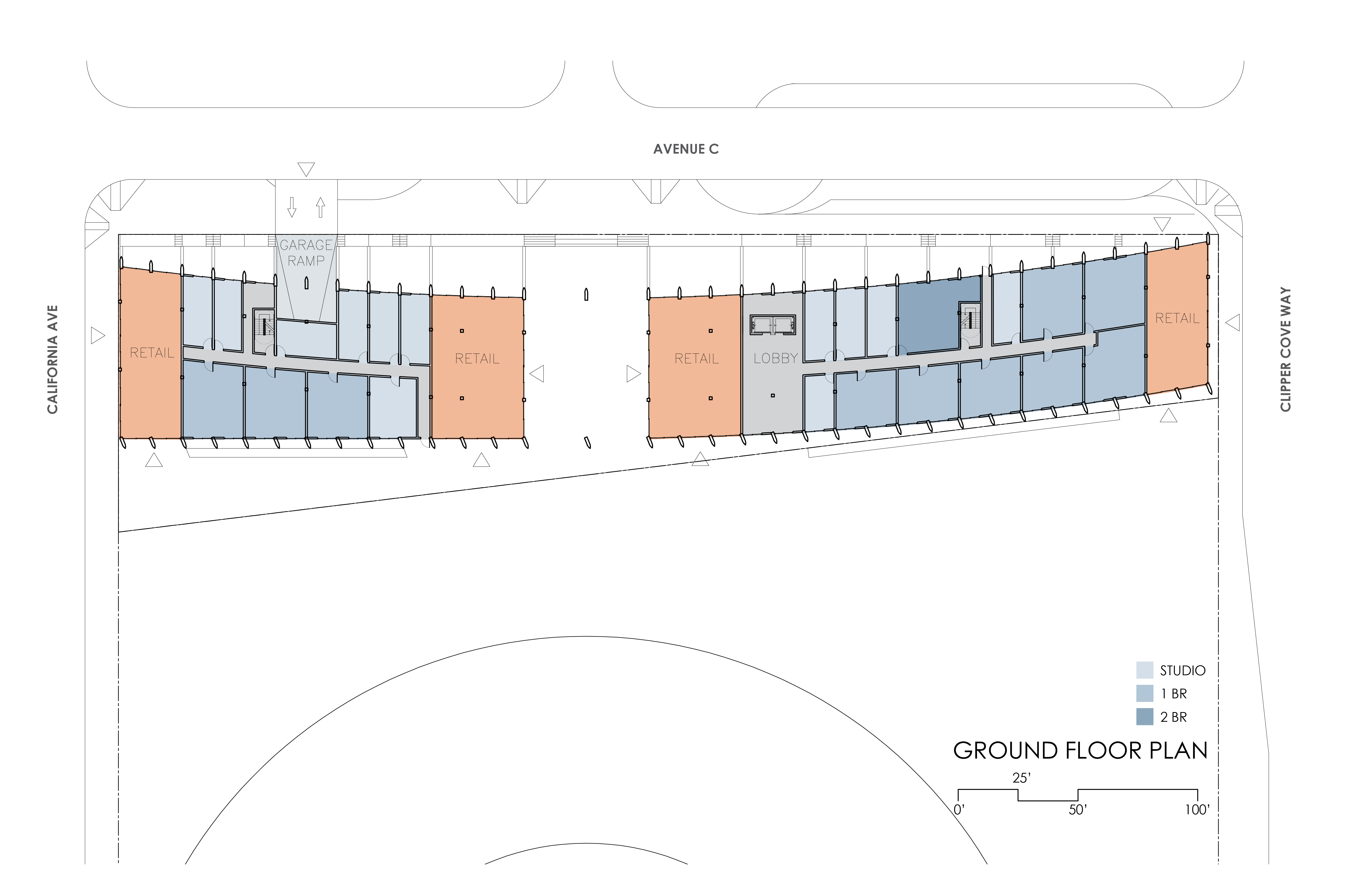 Building One’s central axis is the path from the Ferry Plaza to the Main Retail Street, and bisects our site. Our building is arranged around this axis, with the ends particularized to their specific conditions, stepping down to Clipper Cove and the Marina on one side, correcting to California Ave and the future development on the other. The counter arc pulls the building away from Avenue C’s bus traffic.