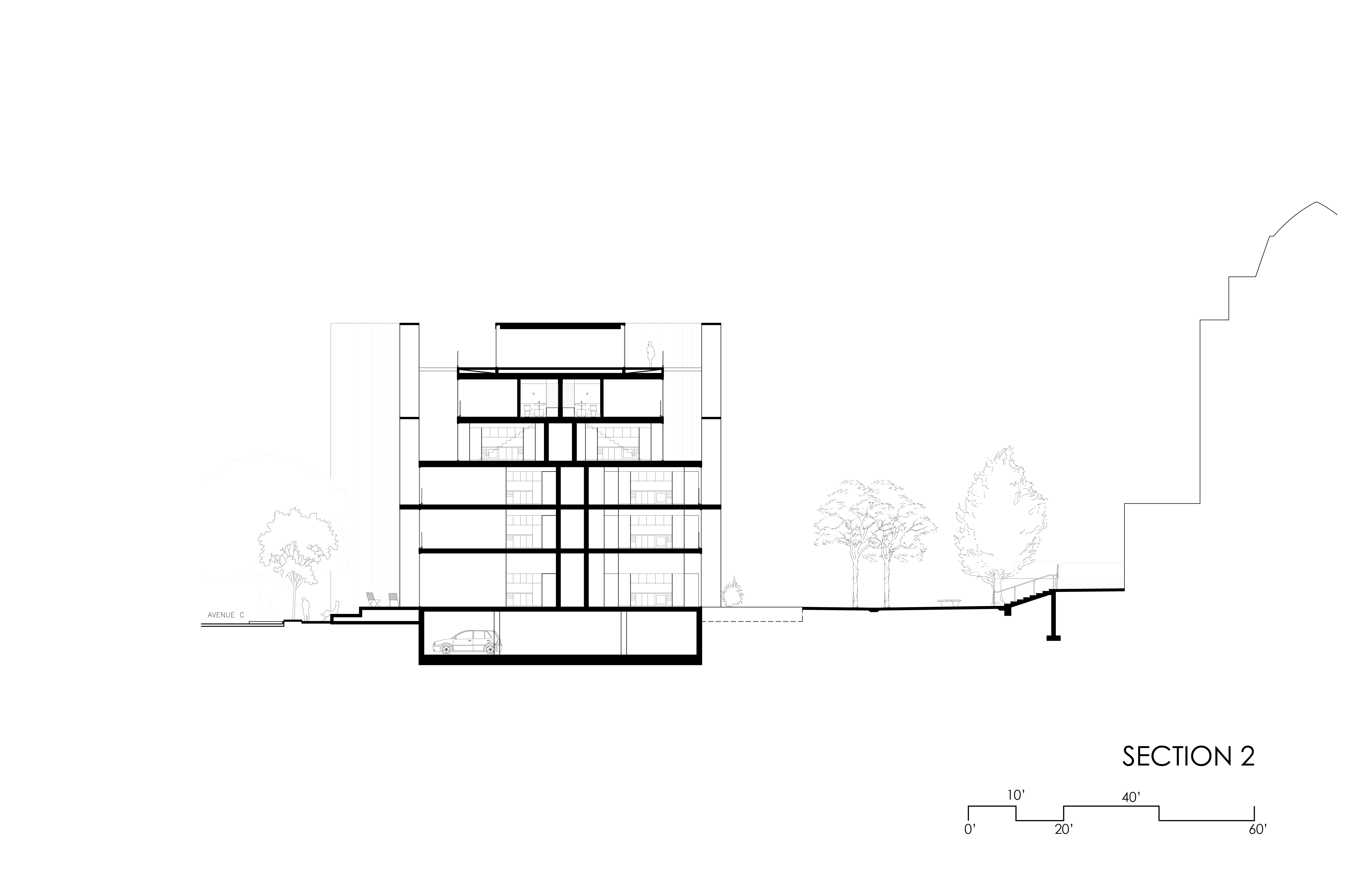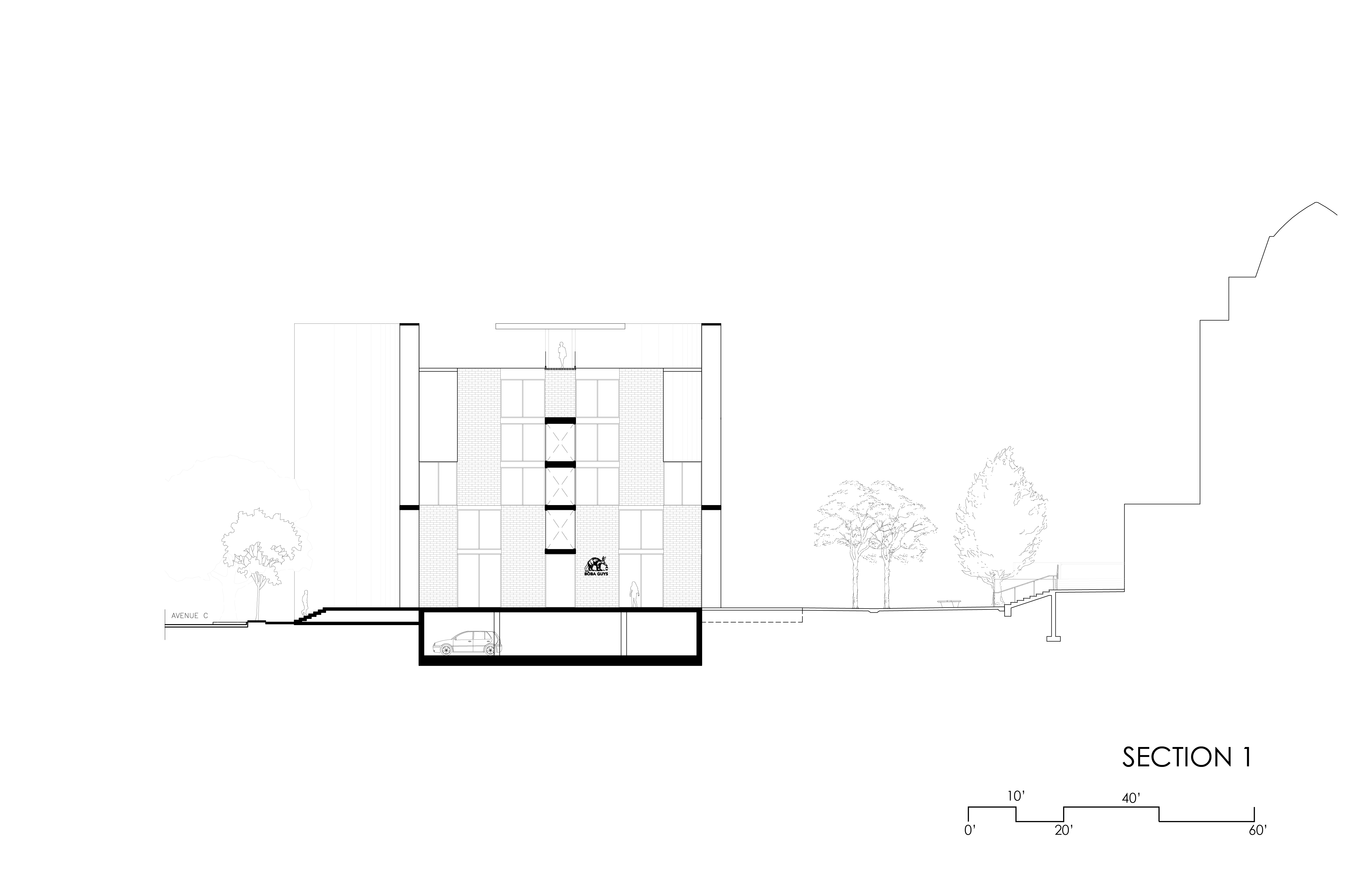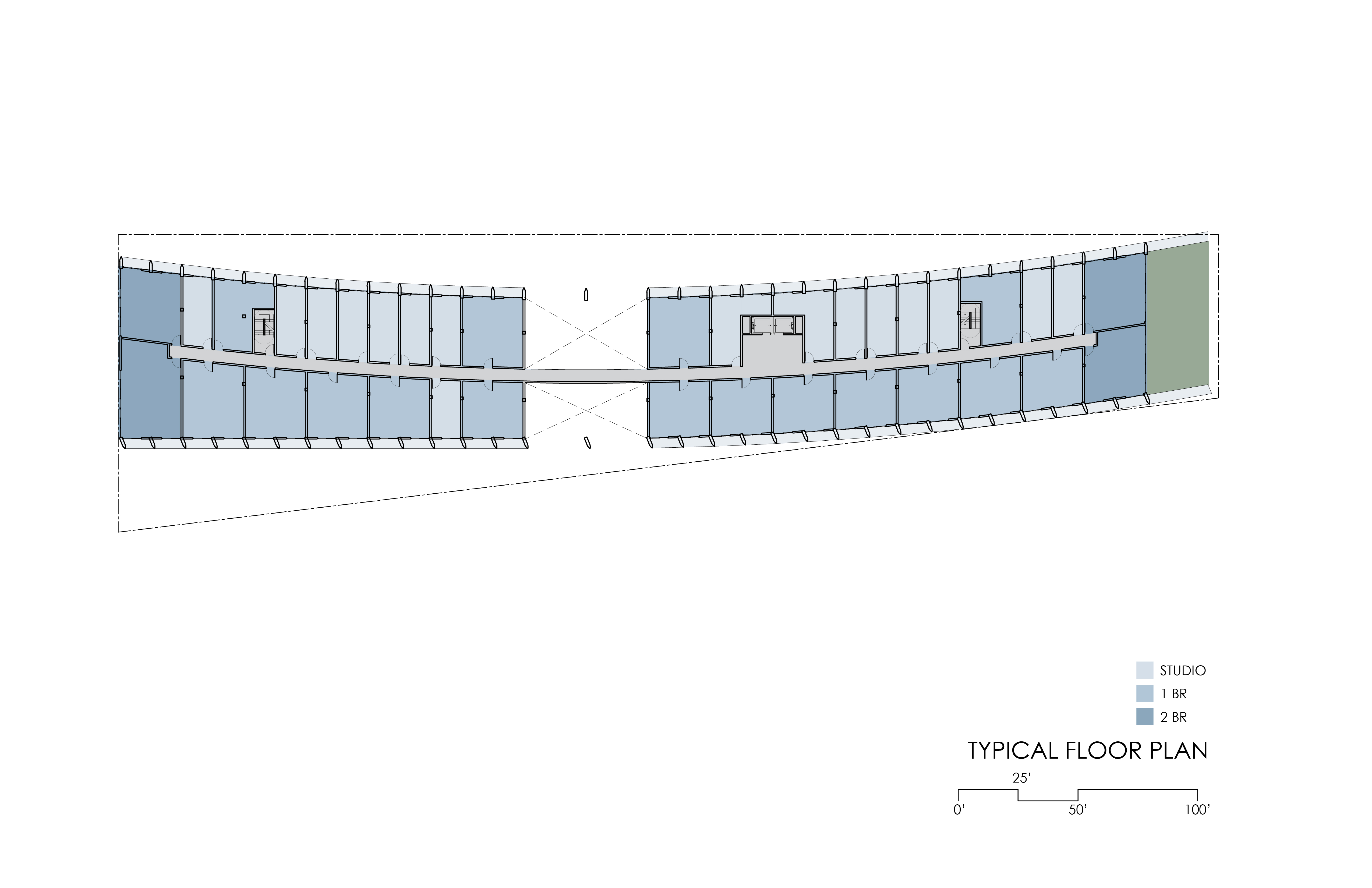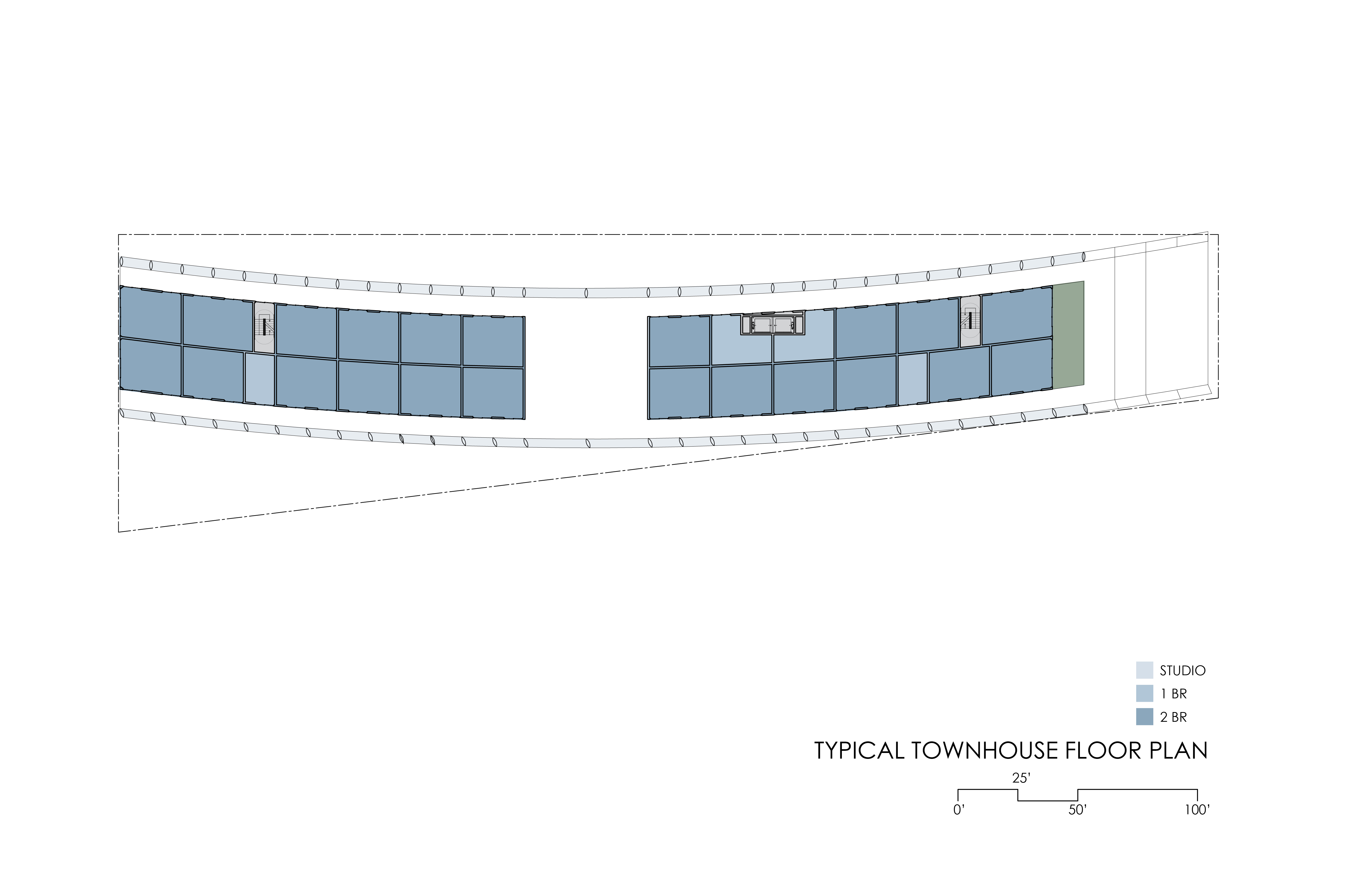 Level 1 has bookends of retail with residences in-between. The lobby is south of the passage, and accessed from both sides. The Climatic Façade on the west is mirrored by fins that create depth and block sound on the east. Units on the east have large porches 3’ above grade, accessed by stairs.