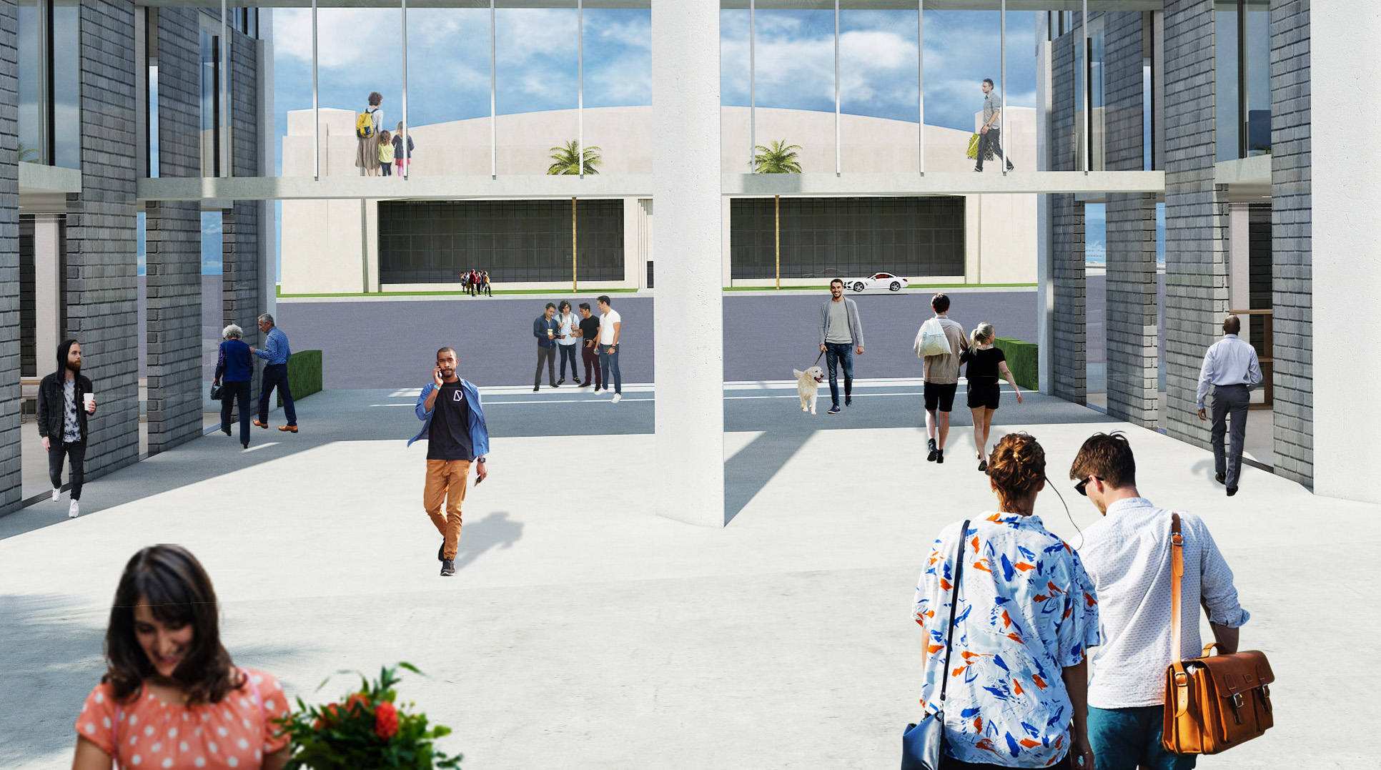 Through the passage is a gateway to the future Retail Main Street, terminating in the vaulted roof façade of a historic warehouse.