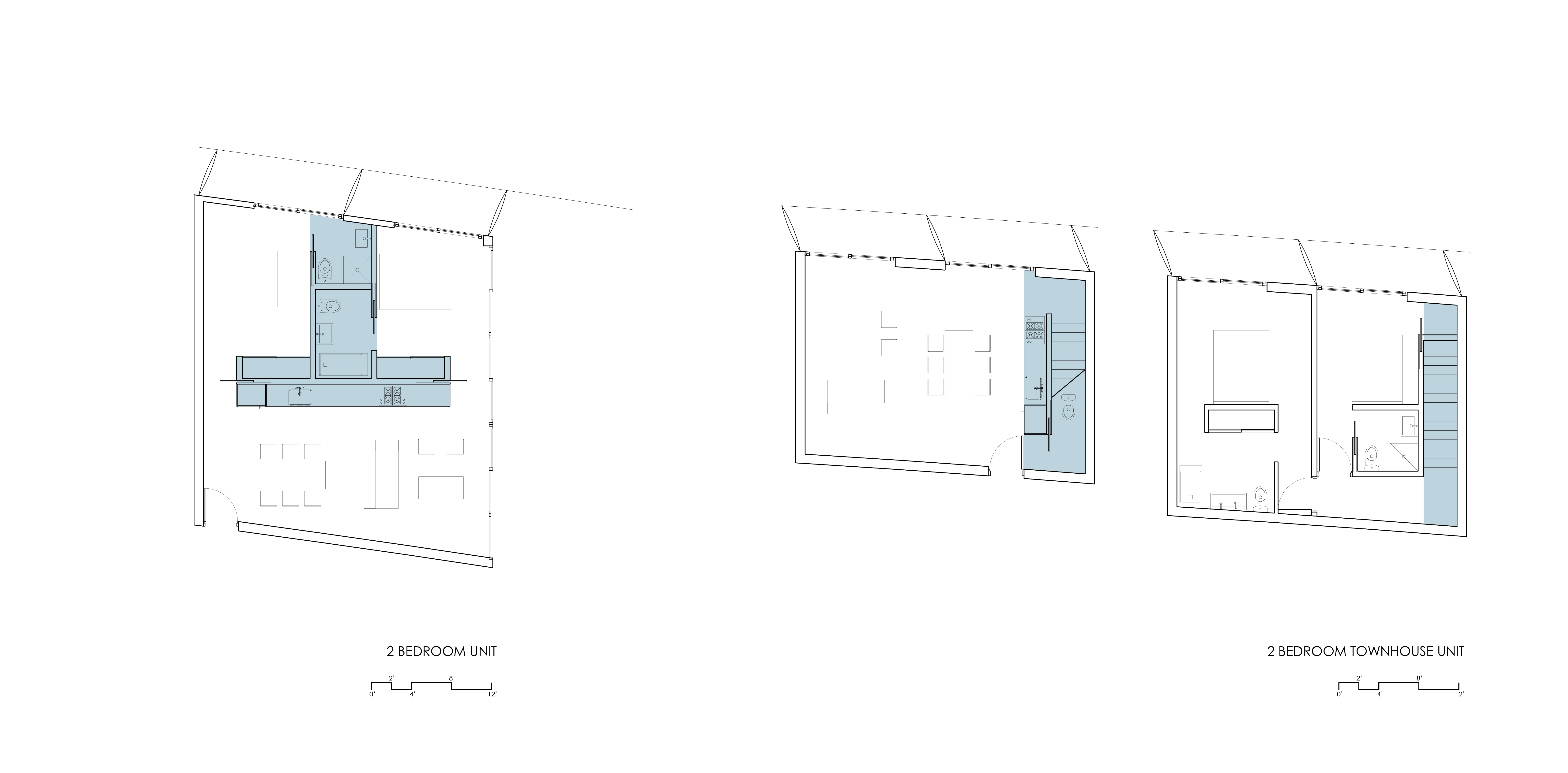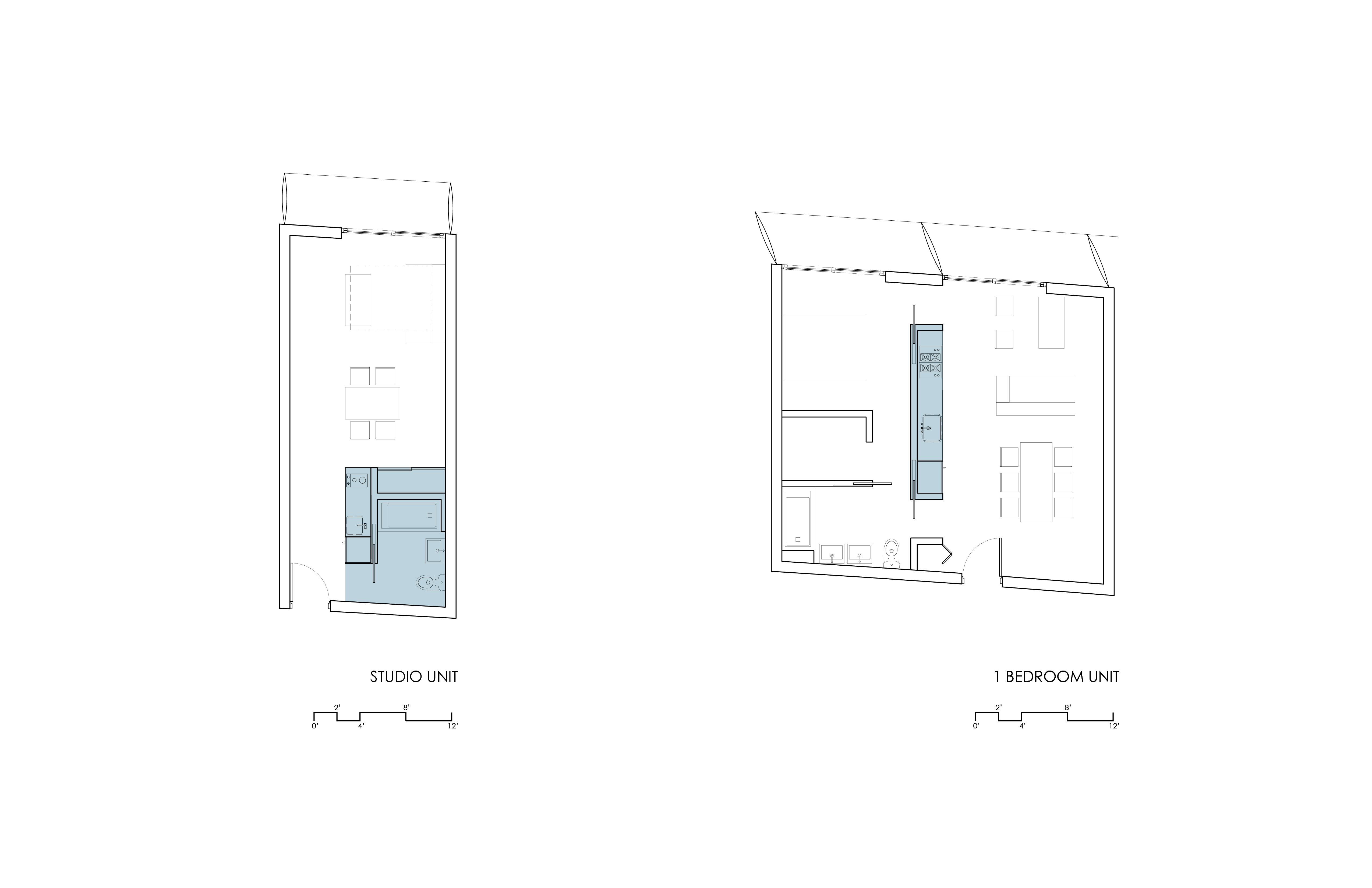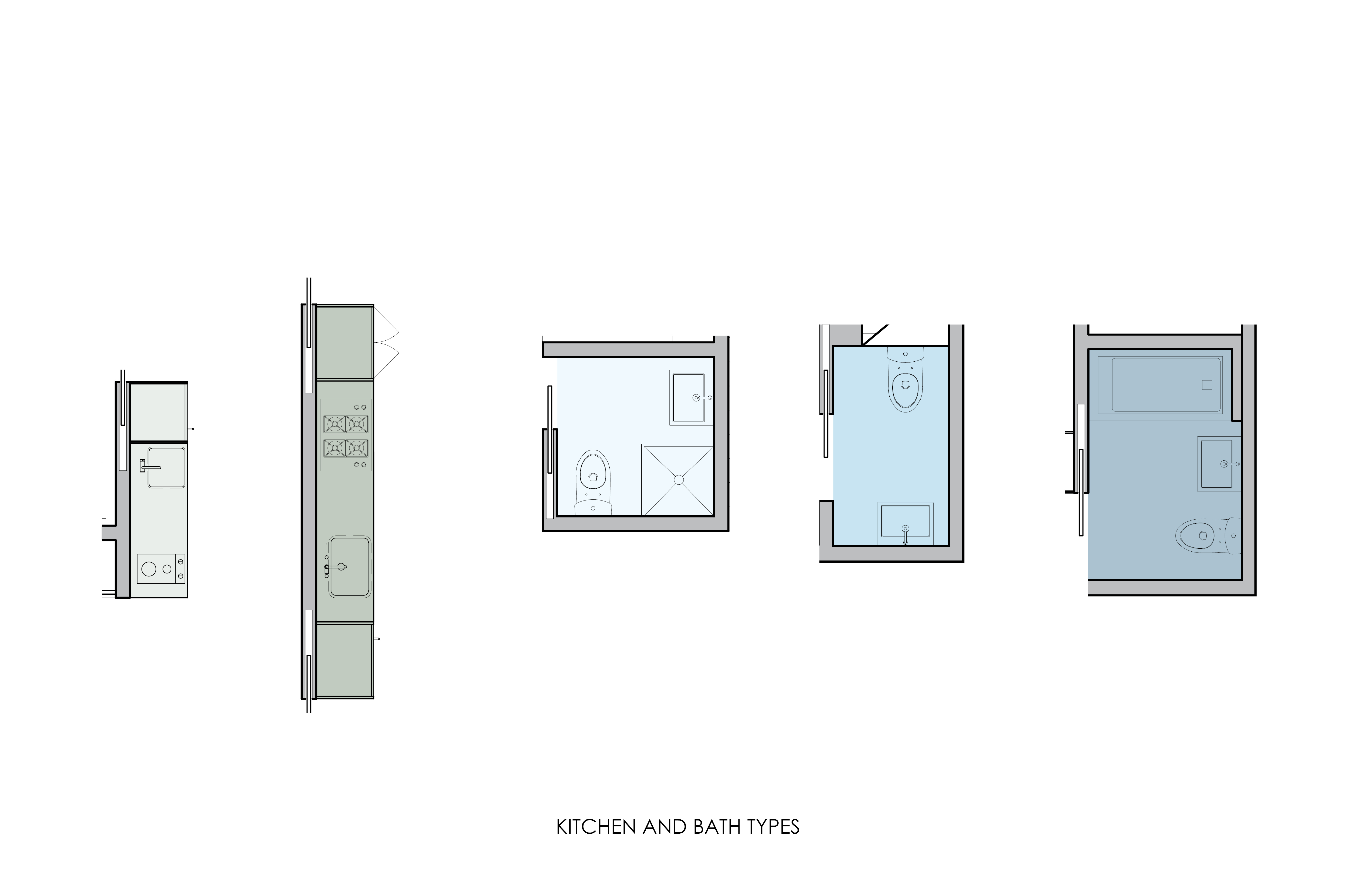 There are 120 studio, one bedroom and two bedroom units. Two kitchen types and three bathroom types are used for the entire project.