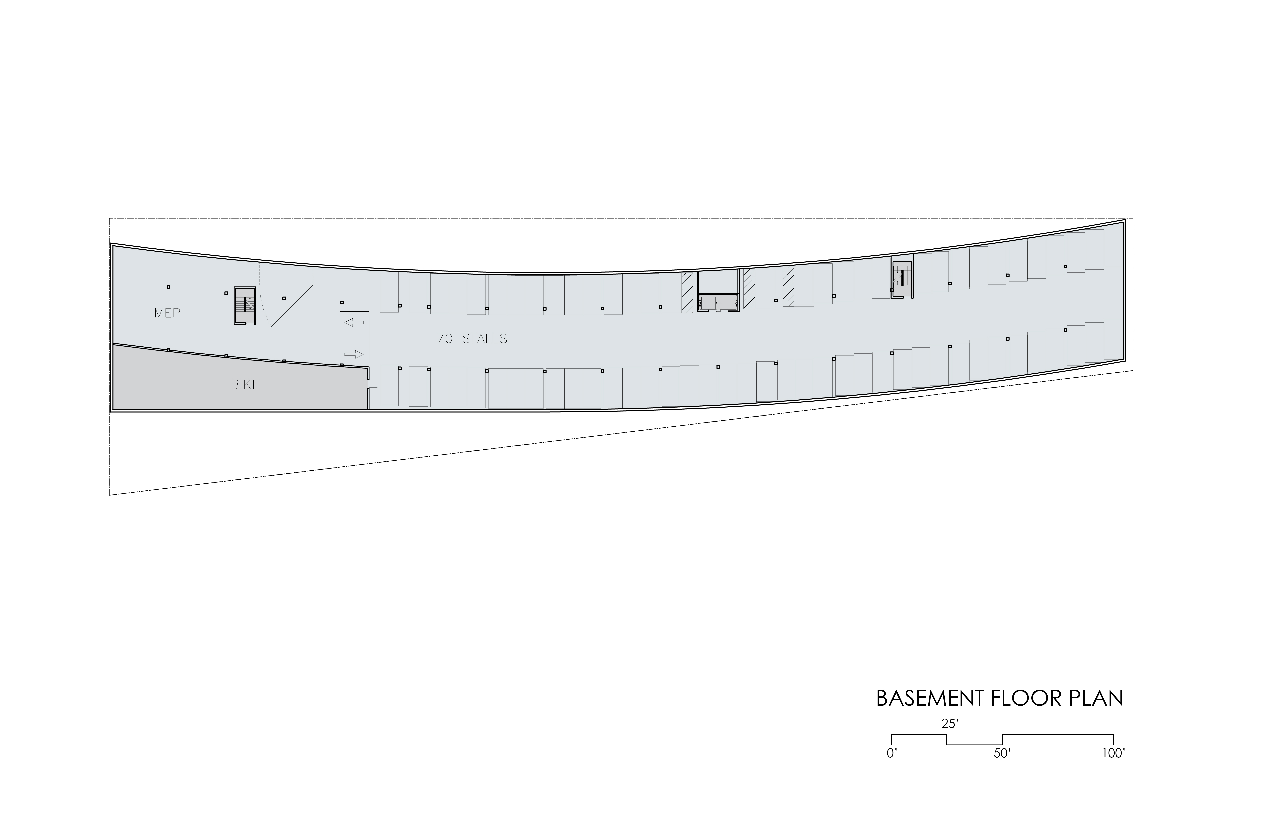 There are 75 parking spaces in a basement that projects 3’ above existing grade.