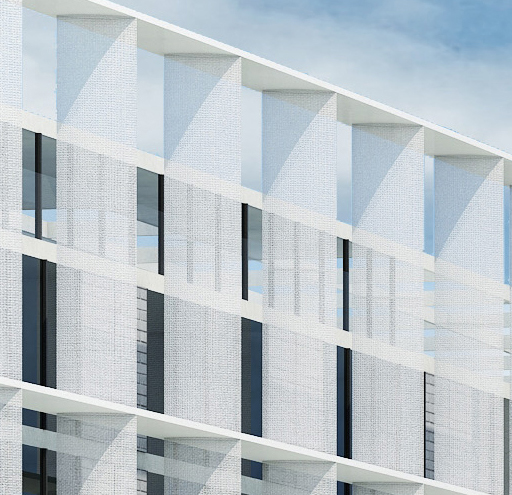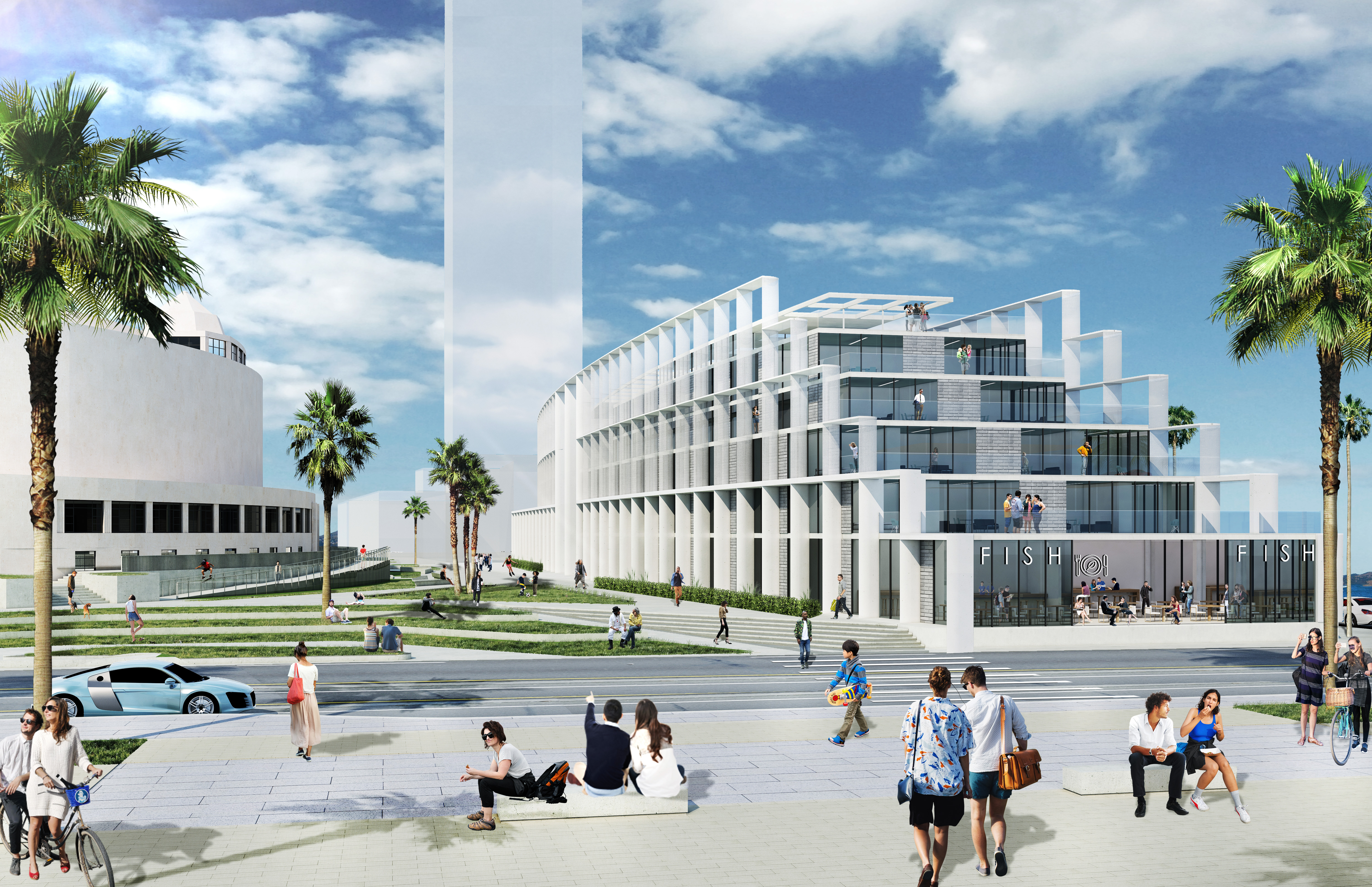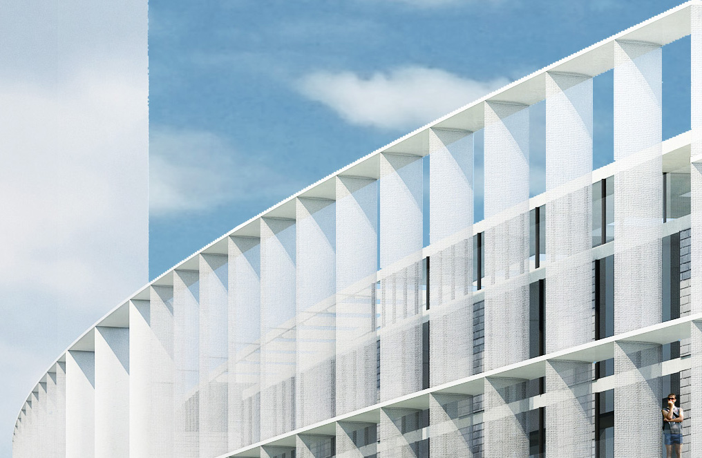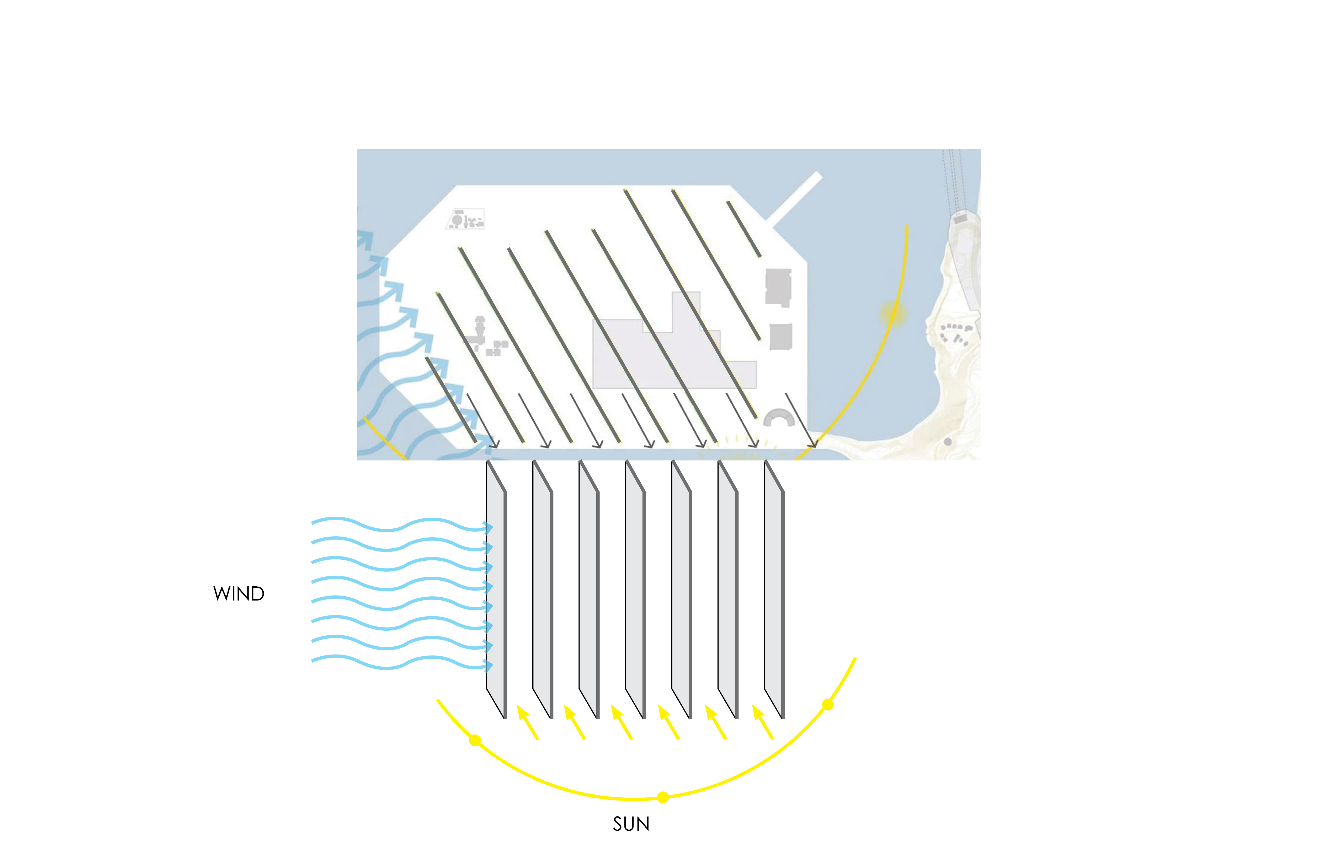 The SOM Masterplan’s ‘Climatic Grid’ establishes a plan geometry to block wind and optimize sun. This same geometry is extruded vertically to establish a Climatic Facade which shelters wind, invites sun and points to views. The material of this façade is conceived as wind form, like sails of ships, billowing fins that layer the façade.