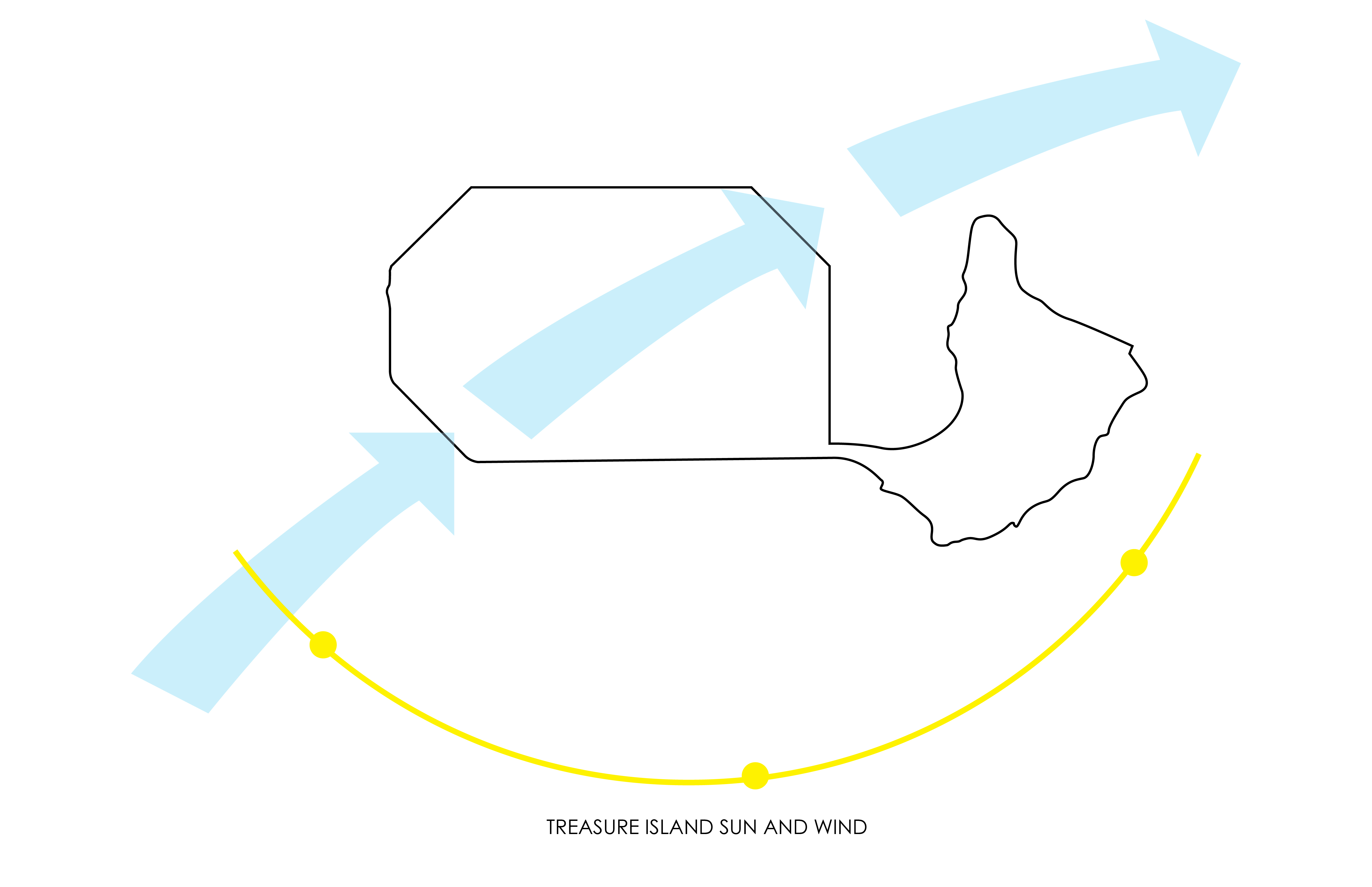Treasure Island – the name conjures a place of allure. The three ‘39 Fair buildings surrounding our site are deco architectures, stepped, arched and bowed, evoking memories of streamliners, ships and islands. Palm trees line the streets. Our building re-imagines these myths as its point of departure.