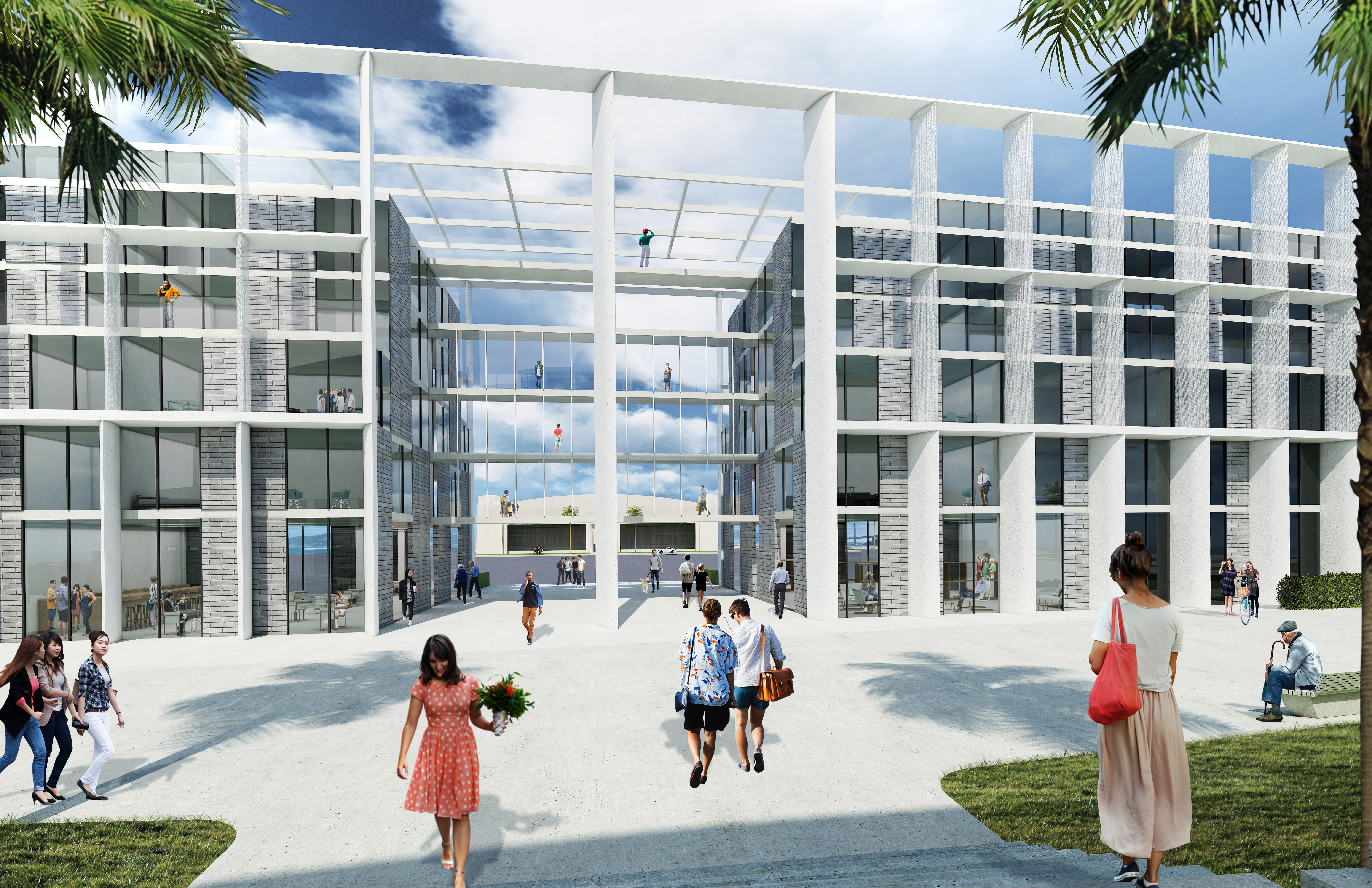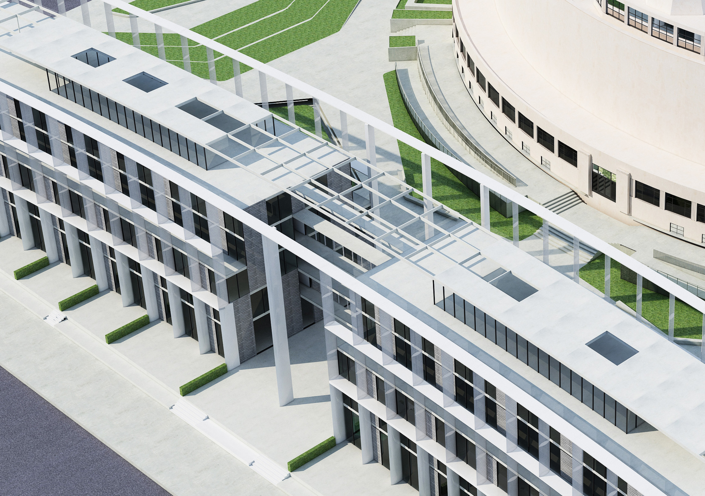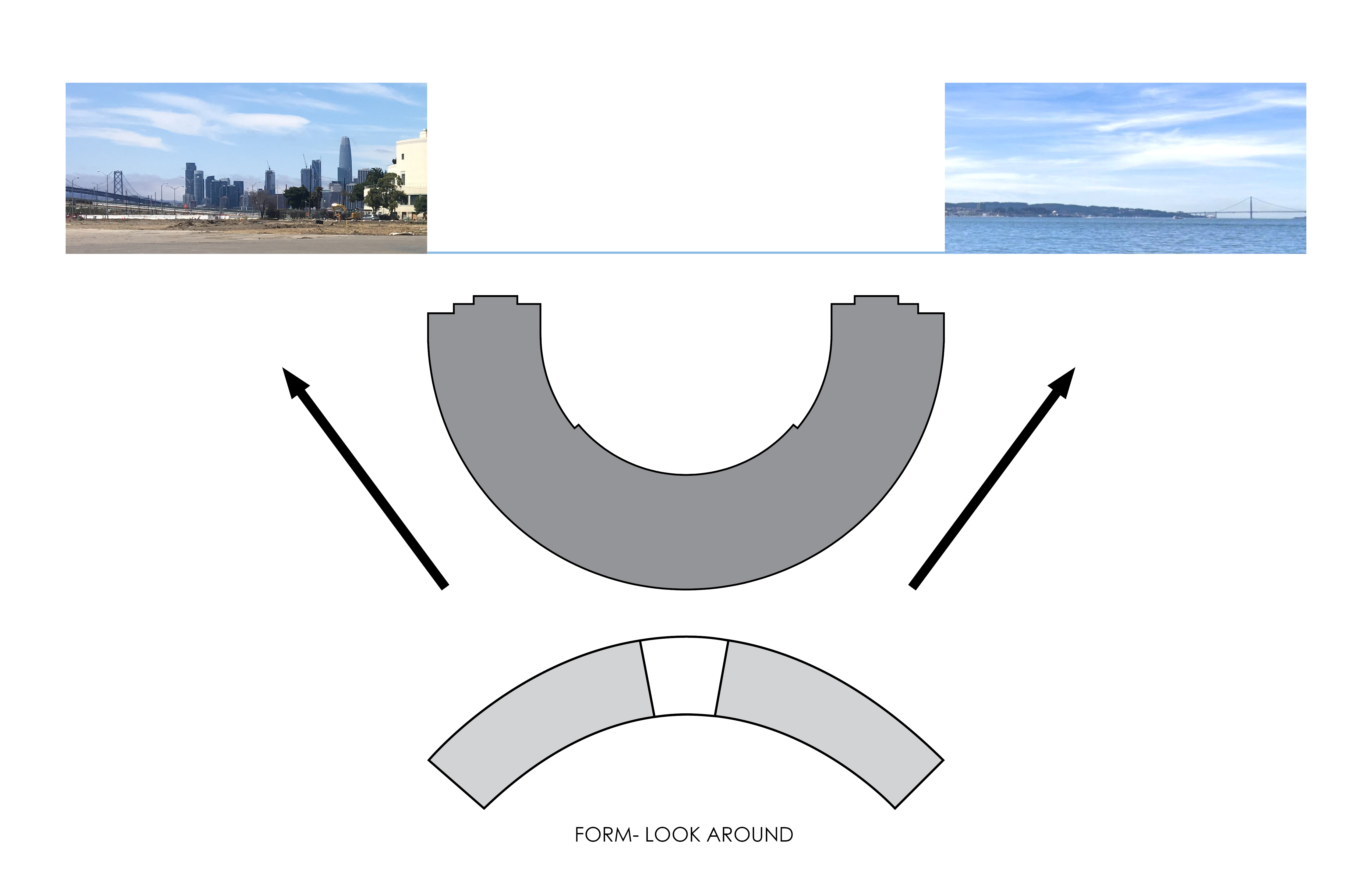 Our site is behind the Historic, horseshoe shaped, Building One. From this location, views of the city look around either side of the arc. Our building is a counter arc to optimize this look around.