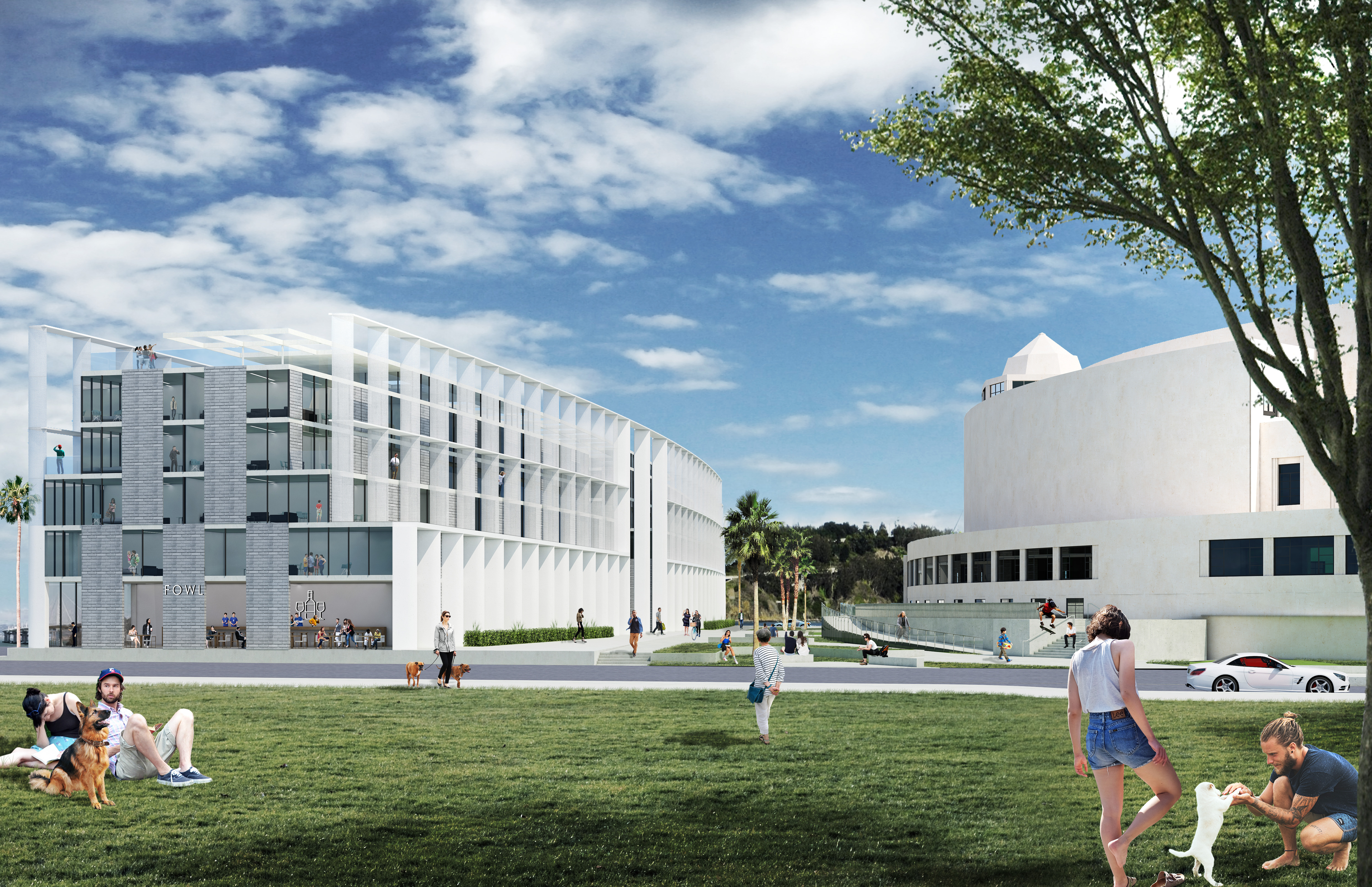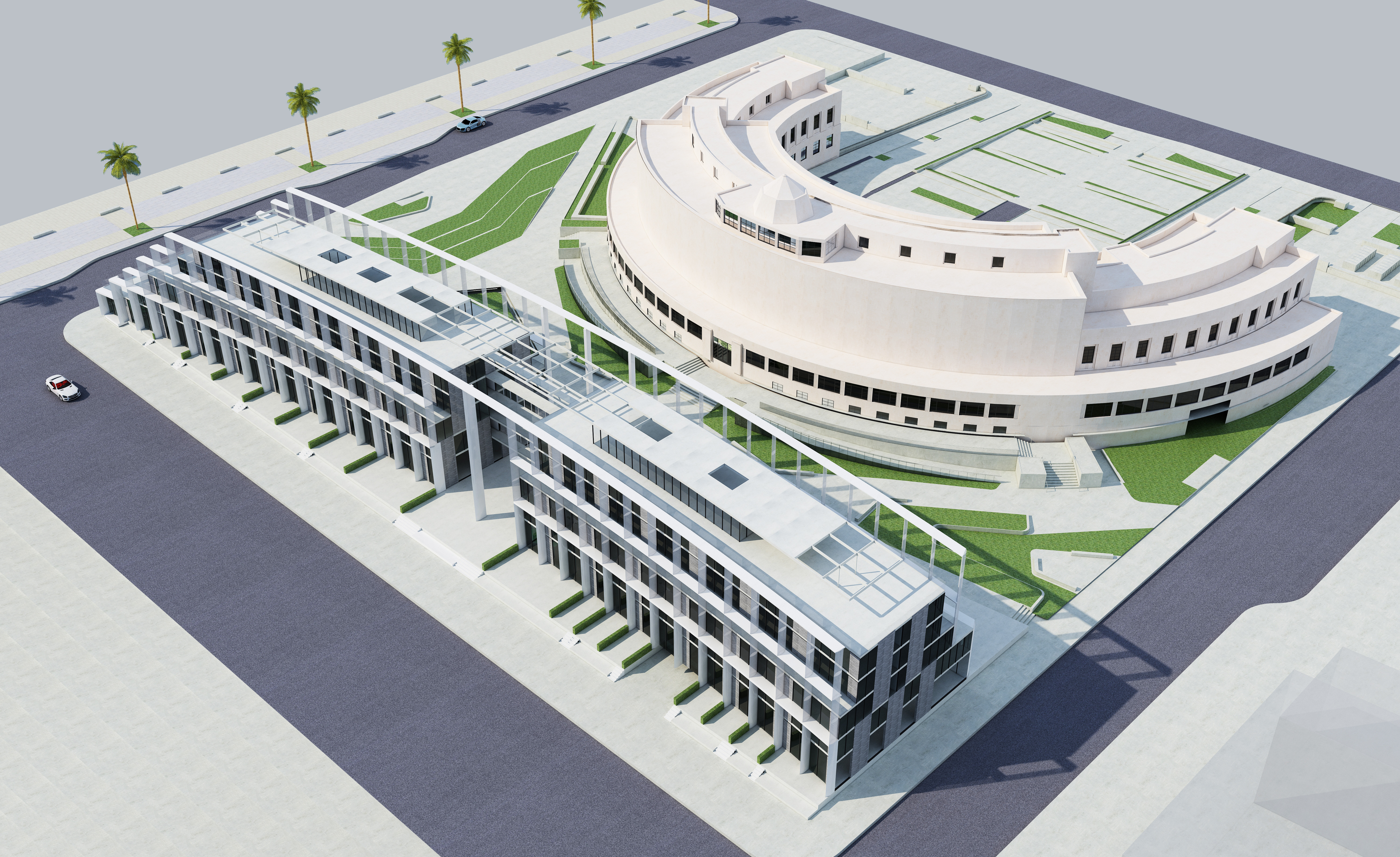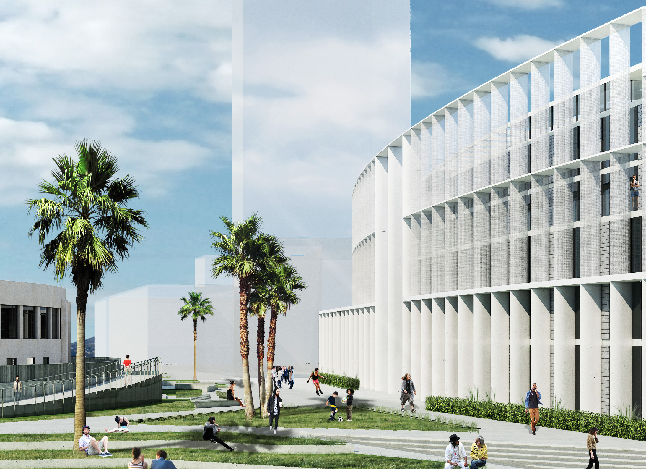 Our site is behind the Historic, horseshoe shaped, Building One. From this location, views of the city look around either side of the arc. Our building is a counter arc to optimize this look around.