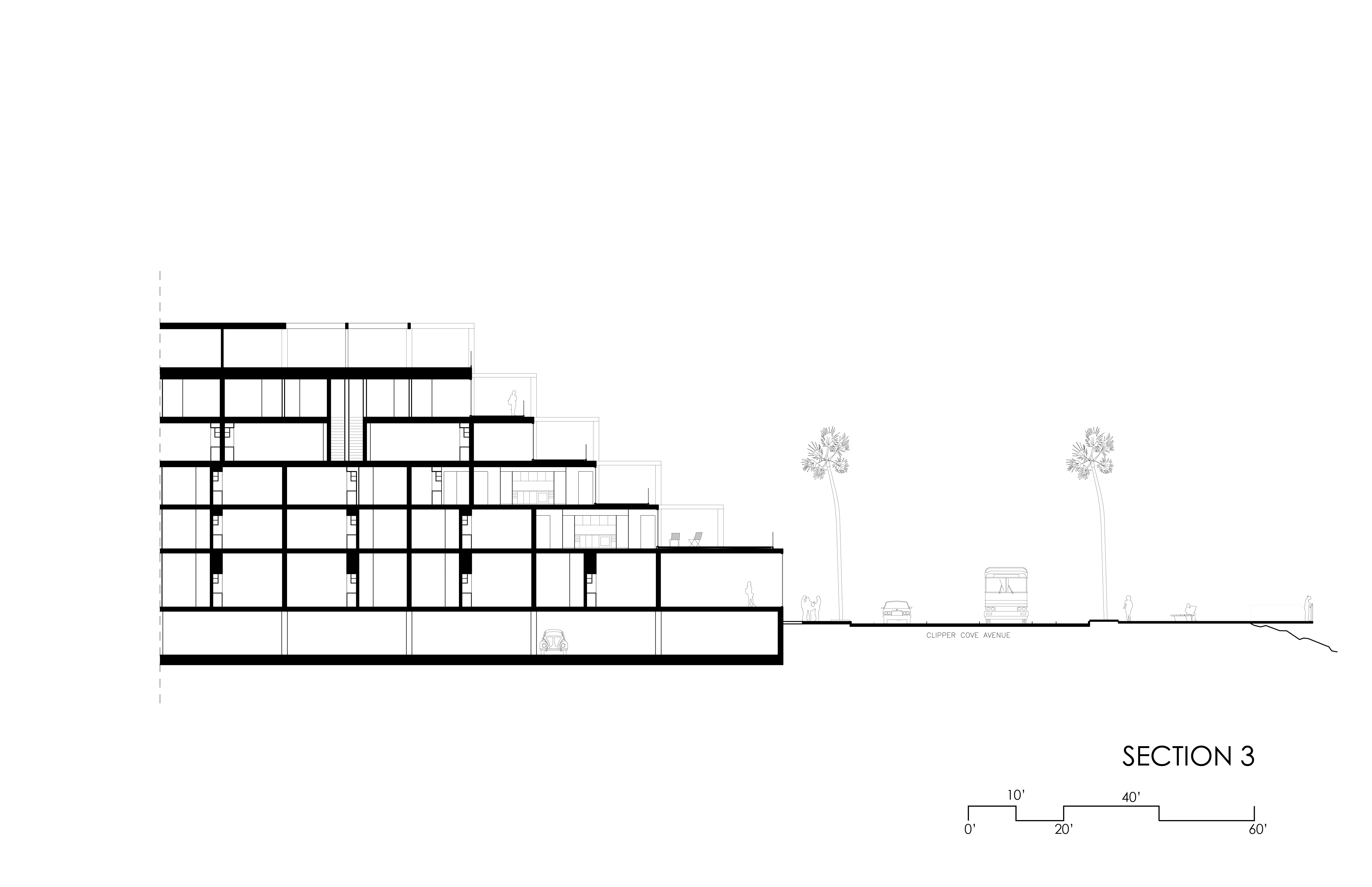 Levels 2 and 3 are double loaded corridors lined with units, with a bridge connecting across the passage. At Clipper Cove Marina units terrace back with large decks.