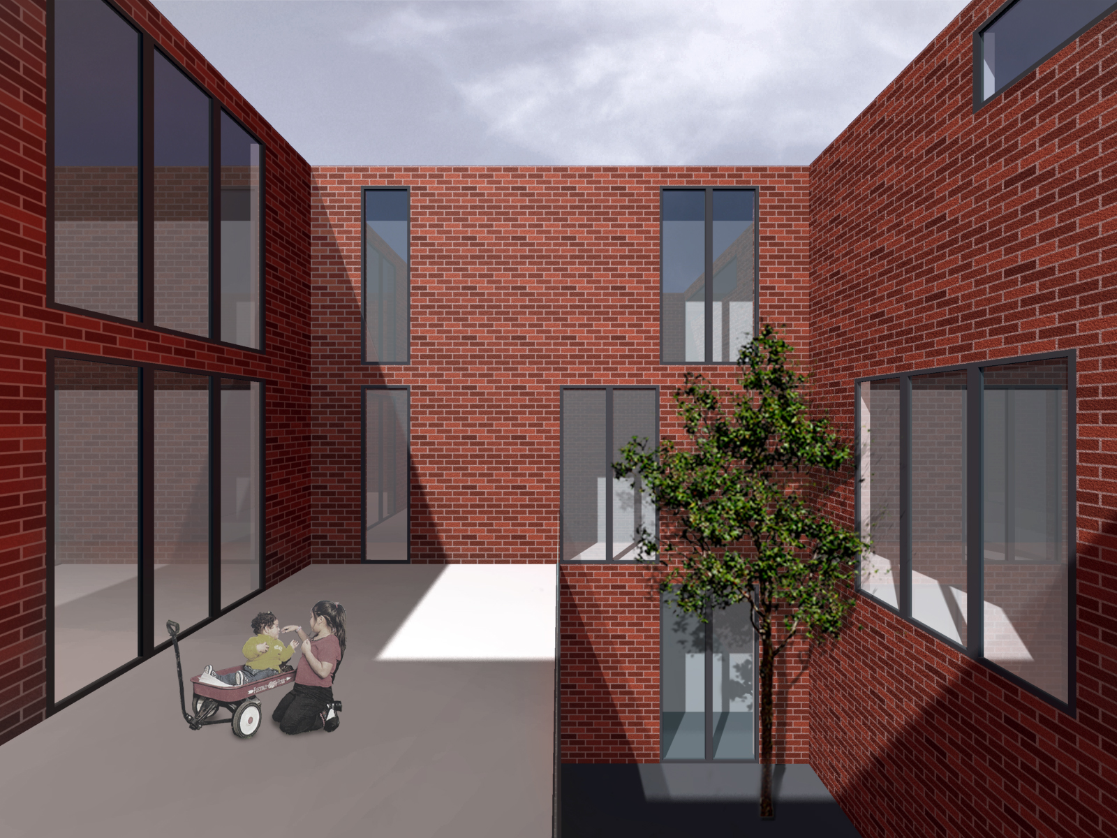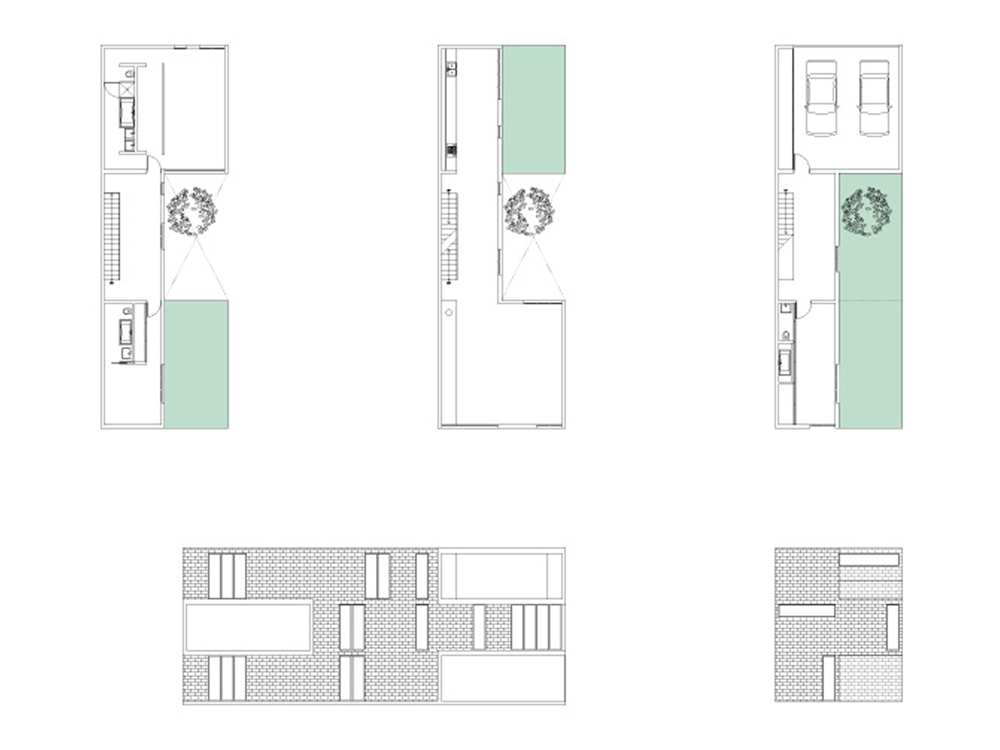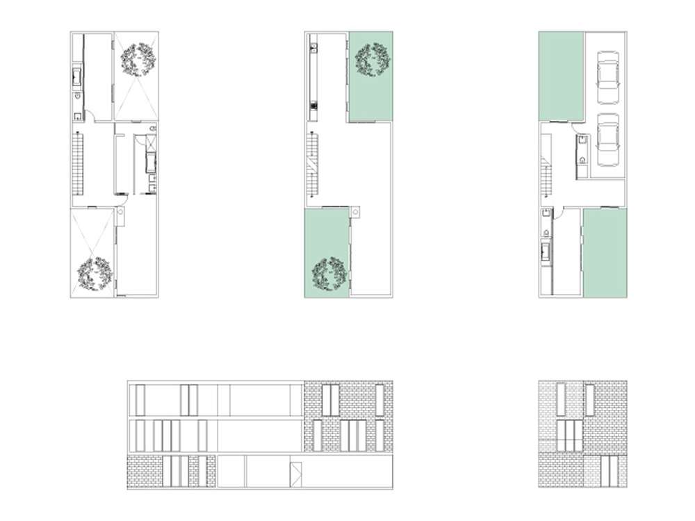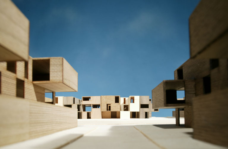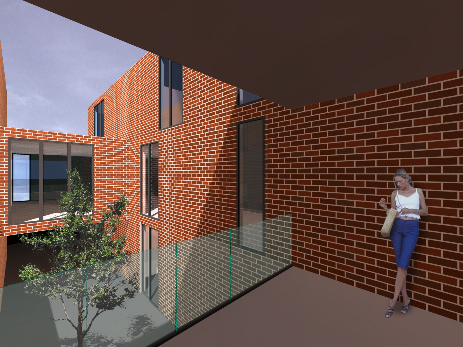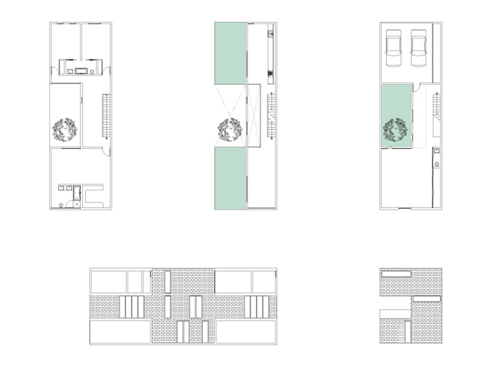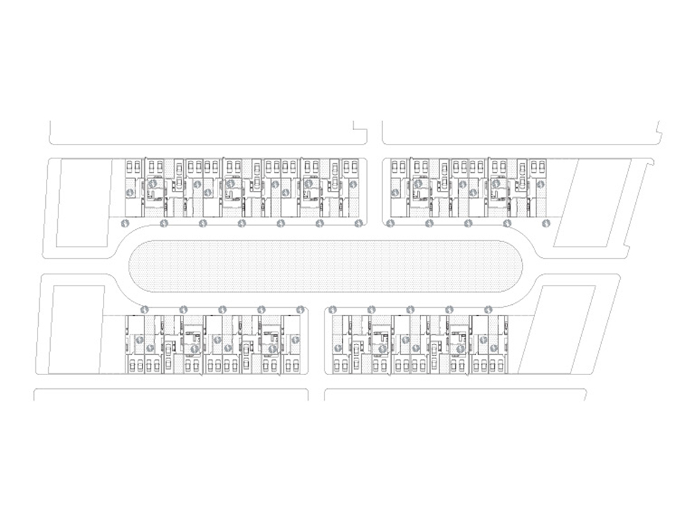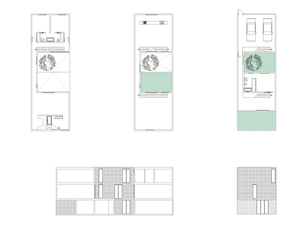 This subtractive process creates a threaded stream of interior voids in the town houses, redistributing throughout the houses the space that would have been occupied by the rear yard. The residences are in the tradition of the courtyard house, but woven vertically. Each unit has three levels arranged in one of four configurations, all variants on the theme of carving and stacking. Vertical voids weave and link to make multiple lit and shaded exterior living spaces appropriate to the hot climate. Primary access is from the central oval; secondary access is through garages, which are located along rear alleys. The principal material is brick in four shades, which adds material value to the otherwise abstract forms.