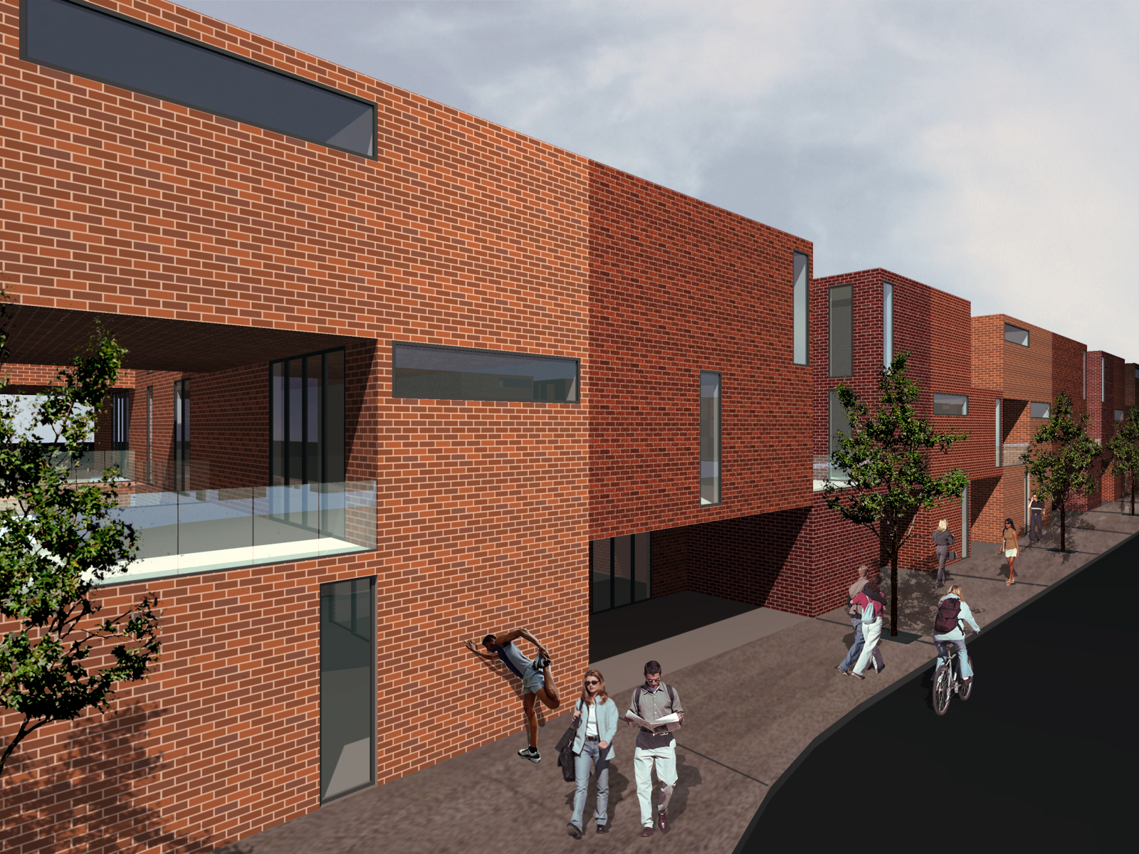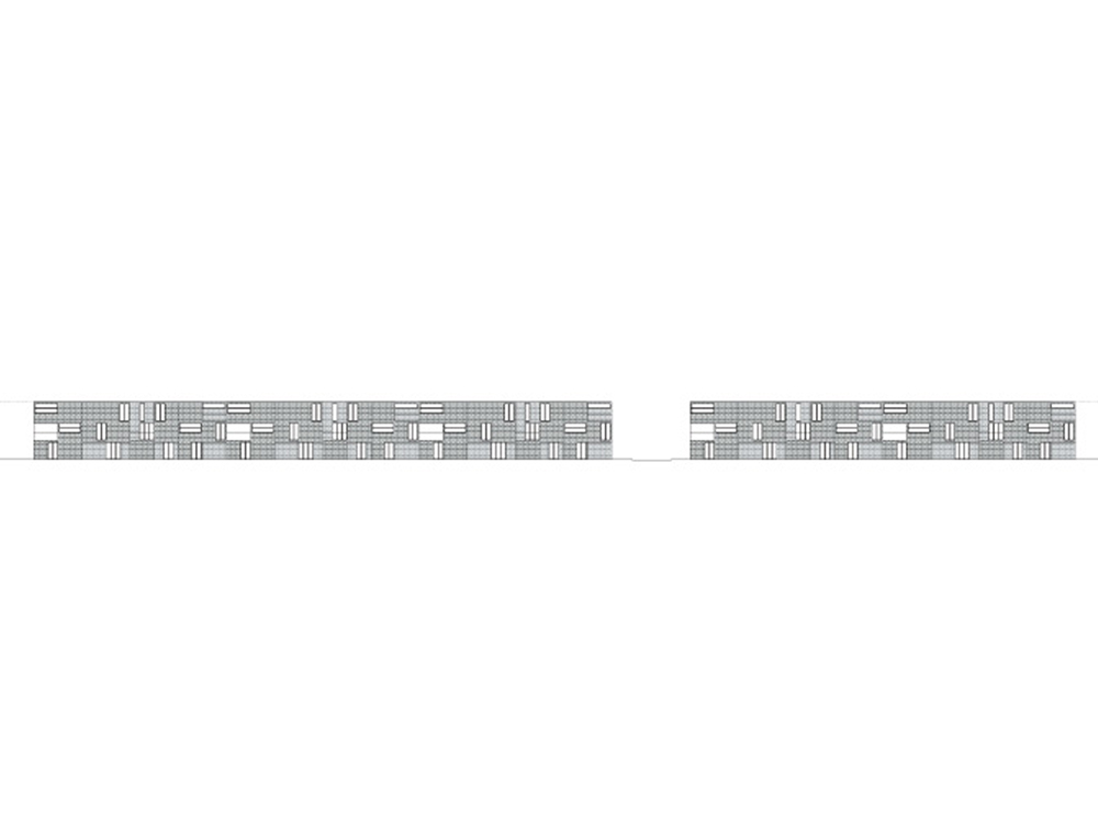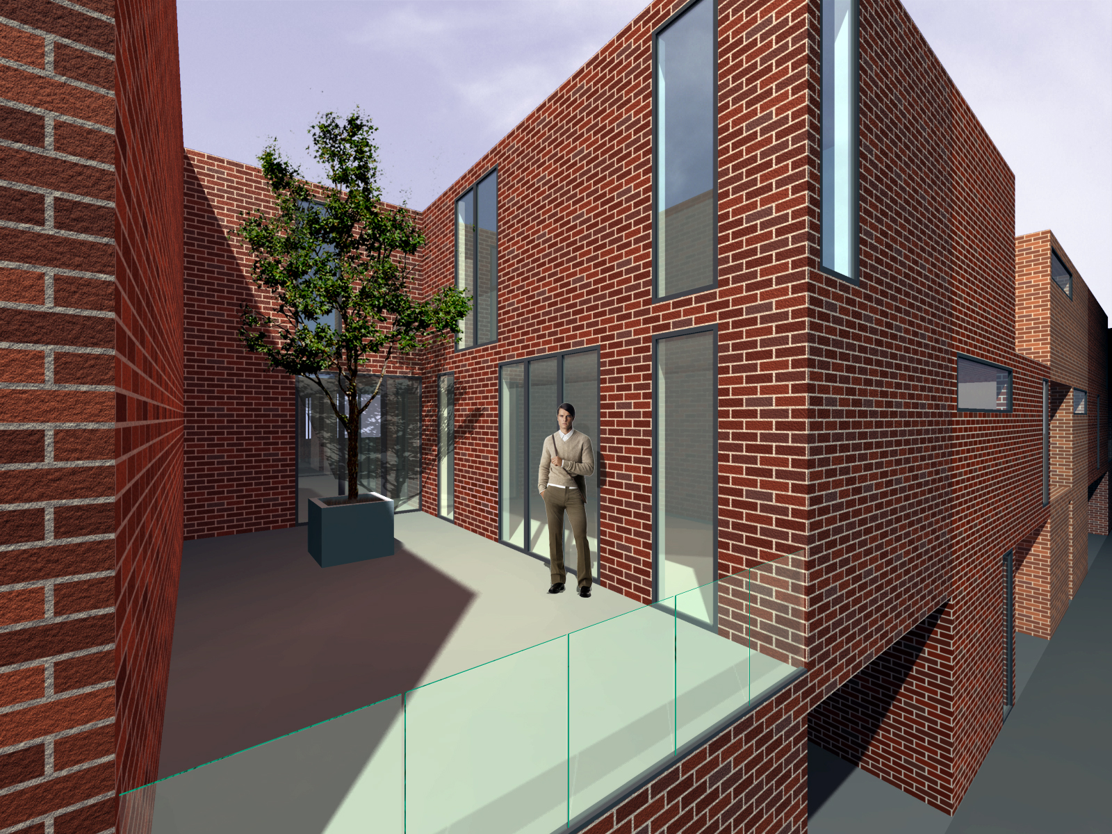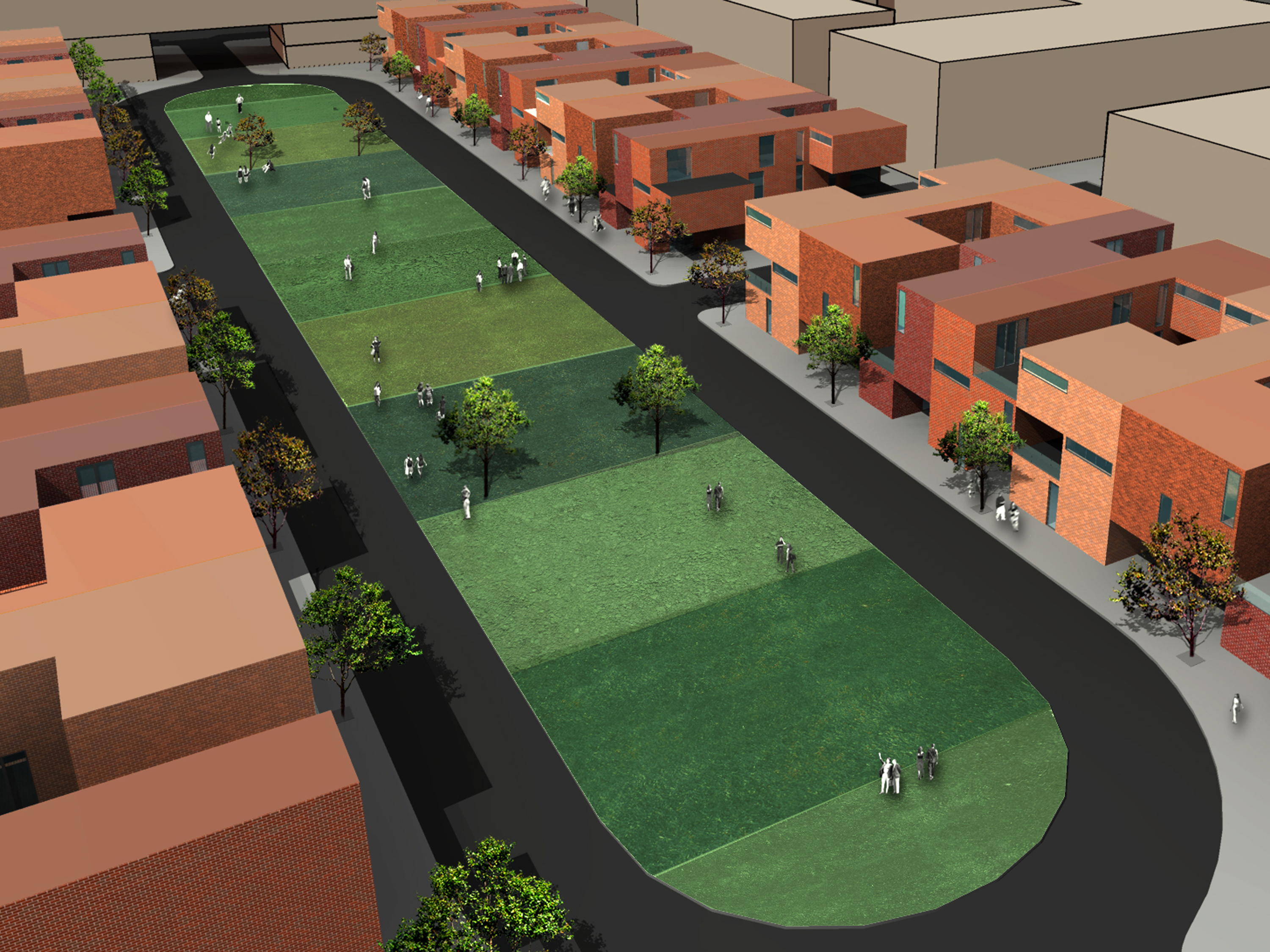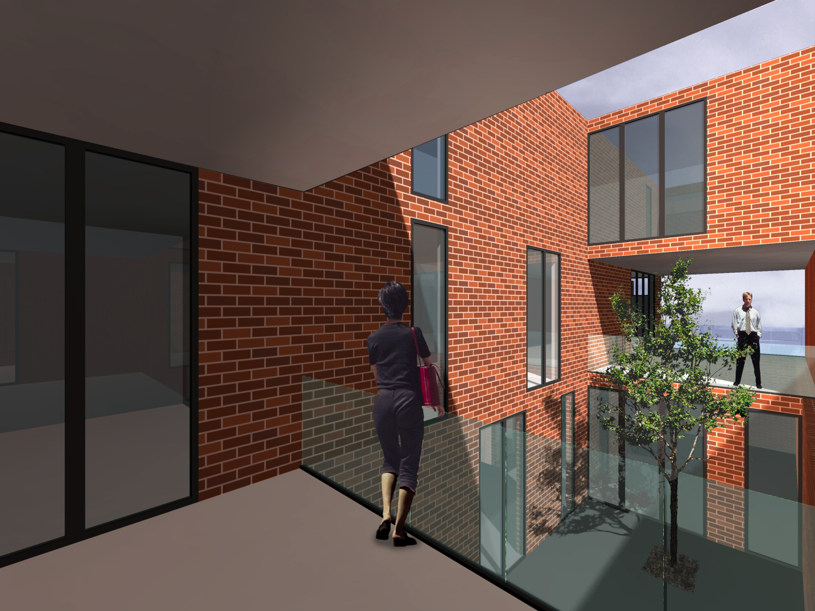 This subtractive process creates a threaded stream of interior voids in the town houses, redistributing throughout the houses the space that would have been occupied by the rear yard. The residences are in the tradition of the courtyard house, but woven vertically. Each unit has three levels arranged in one of four configurations, all variants on the theme of carving and stacking. Vertical voids weave and link to make multiple lit and shaded exterior living spaces appropriate to the hot climate. Primary access is from the central oval; secondary access is through garages, which are located along rear alleys. The principal material is brick in four shades, which adds material value to the otherwise abstract forms.