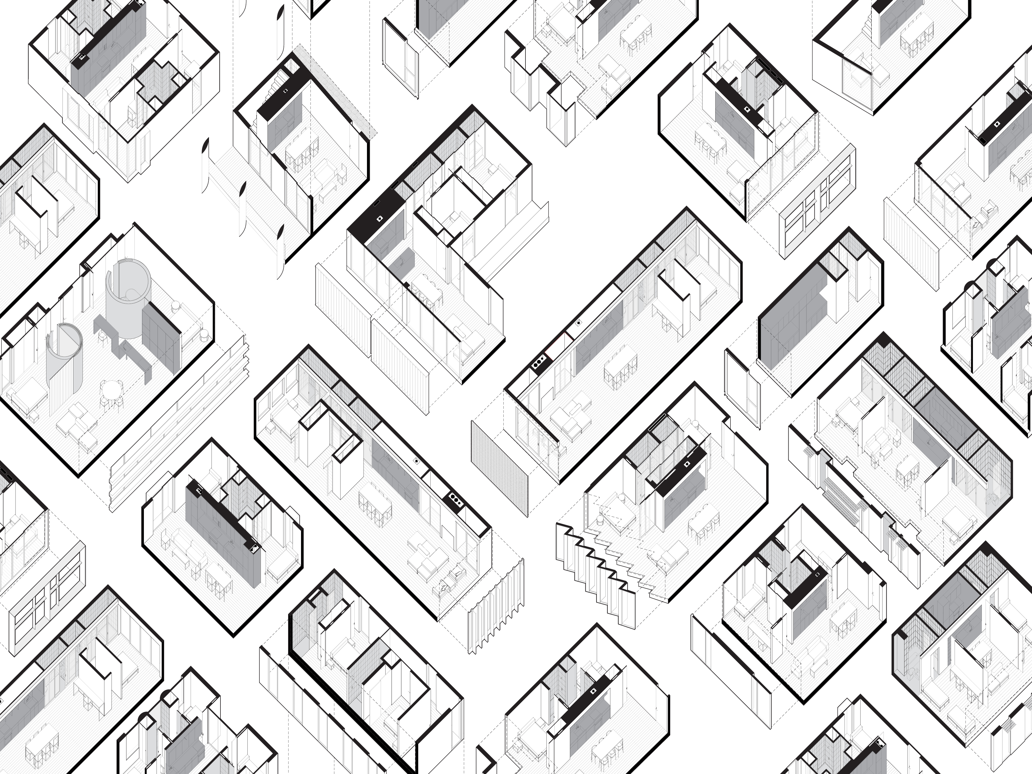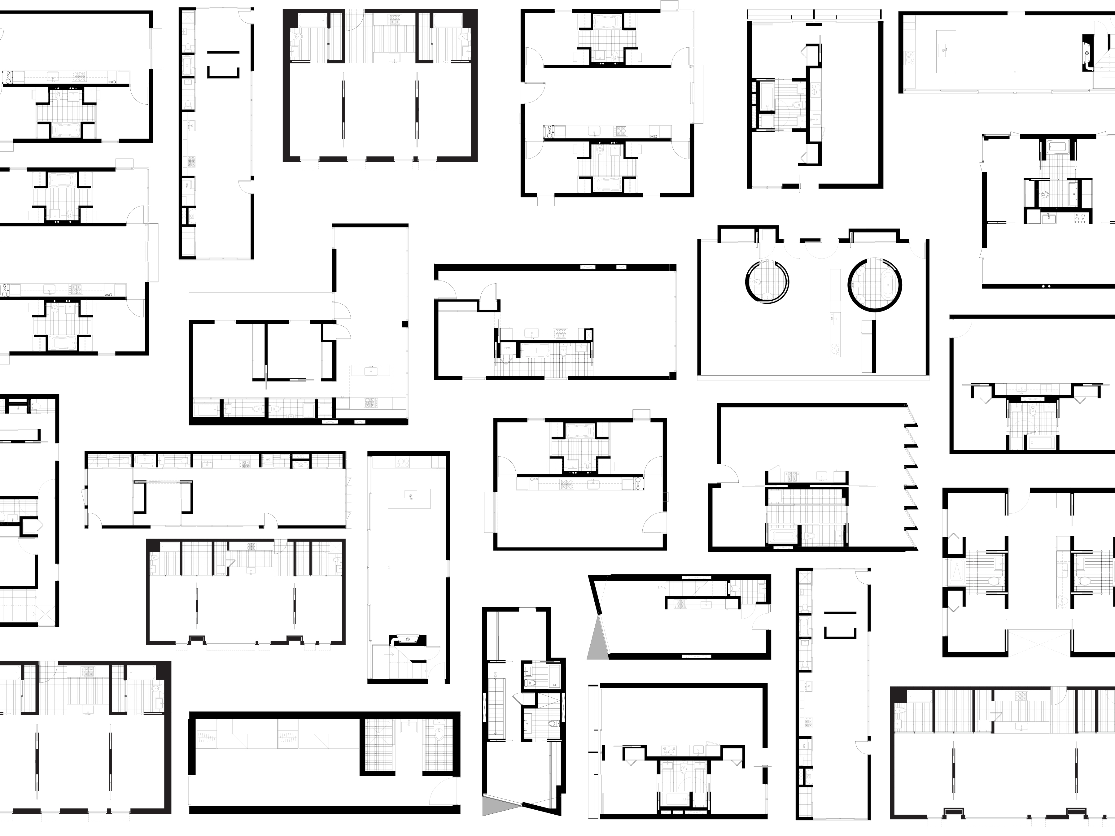 In order to provide the maximum indeterminate deprogrammed space, the service elements: kitchens, bathrooms and storage are accumulated, collapsed and minimized. These servant programs are compressed eliminating the whole idea of rooms, replacing them with continuous fields of space. The service elements double as structure and stack vertically. All mechanical, electrical, plumbing and sprinkler runs chase within these zones. All lighting emanates from these dense areas. This process of reduction, compression and repetition provides opportunities for expansion and the reallocation of resources to increase quality in other elements. Through hierarchical unities, elements are assembled, grouped and minimized, providing the maximum amount of free space for occupants to determine their own program.