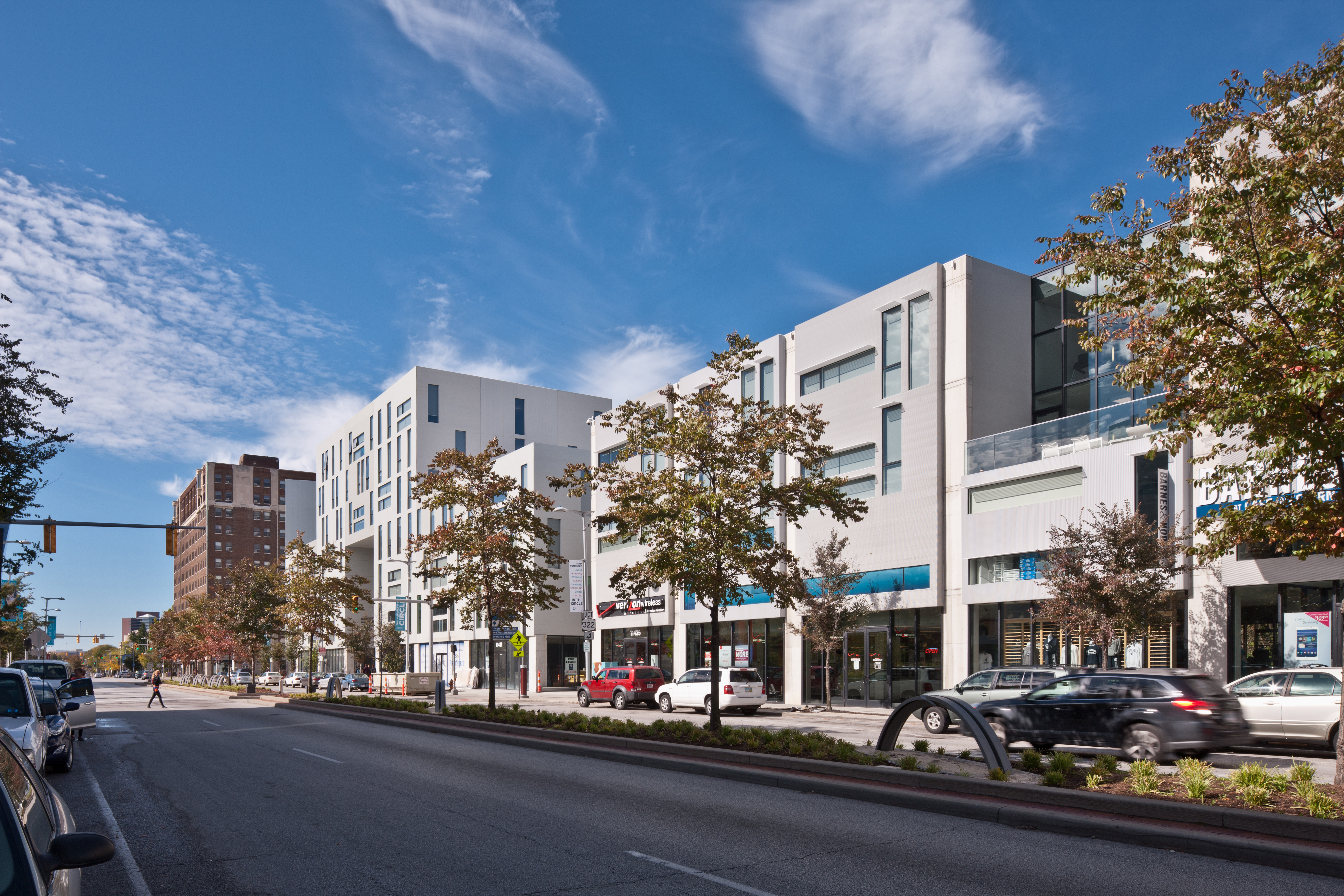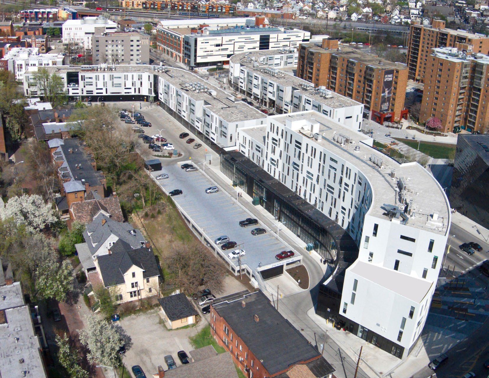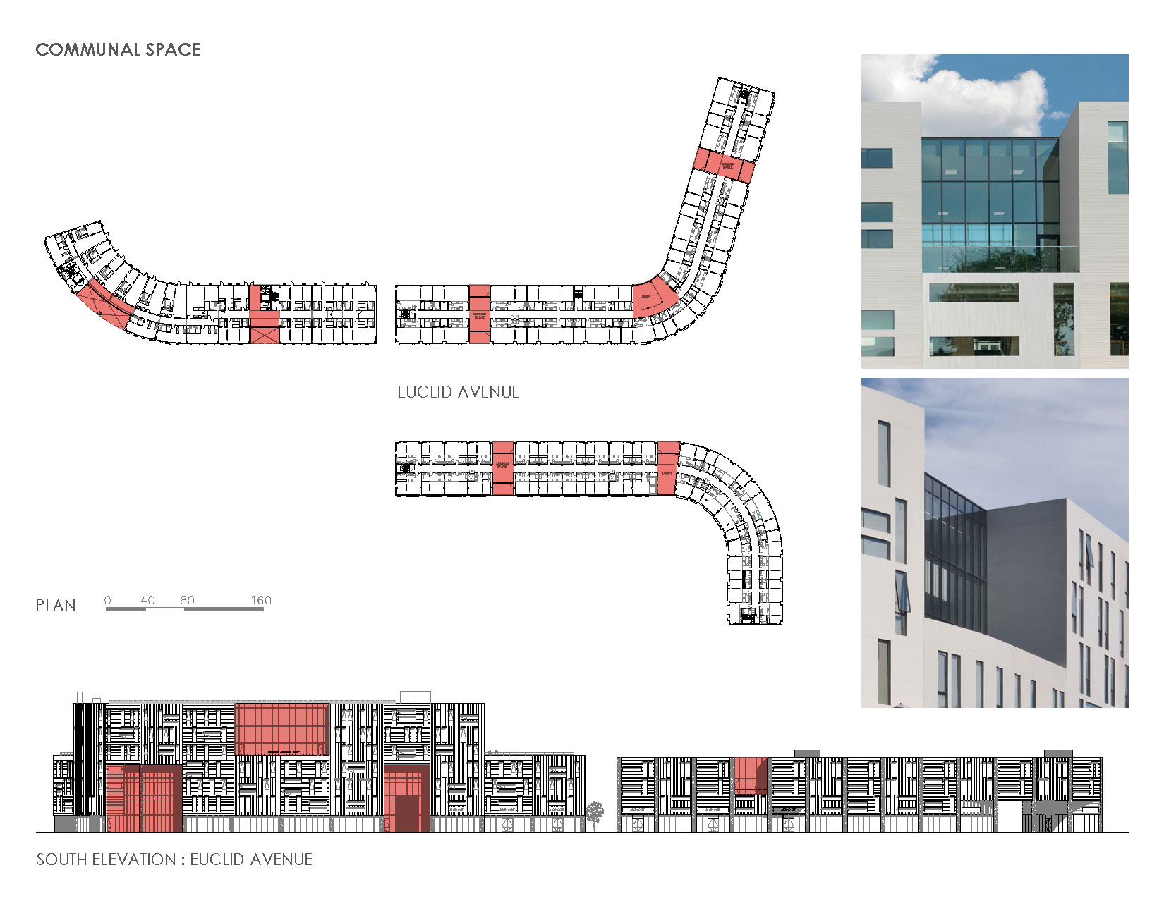 The building on the south side of Euclid Ave has commercial space lining the street, with parking on two levels at the rear. The commercial space houses a Barnes and Noble Bookstore, the entry lobby to the residences above is at a gateway which perforates the slab, and a grocery store which wraps around the corner onto 115th Street. Above are residences. Numerous types, ranging from one to three bedroom units, are structured in layers. From a double loaded central hallway, service bars are established on either side, connected to the habitable spaces on the outer walls. Three common area courtyards puncture the perforated façade.