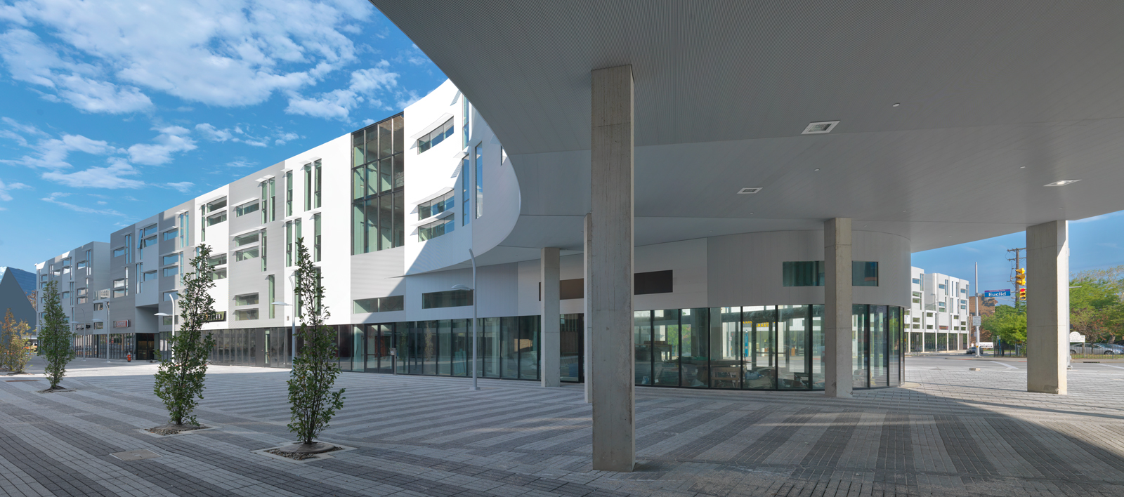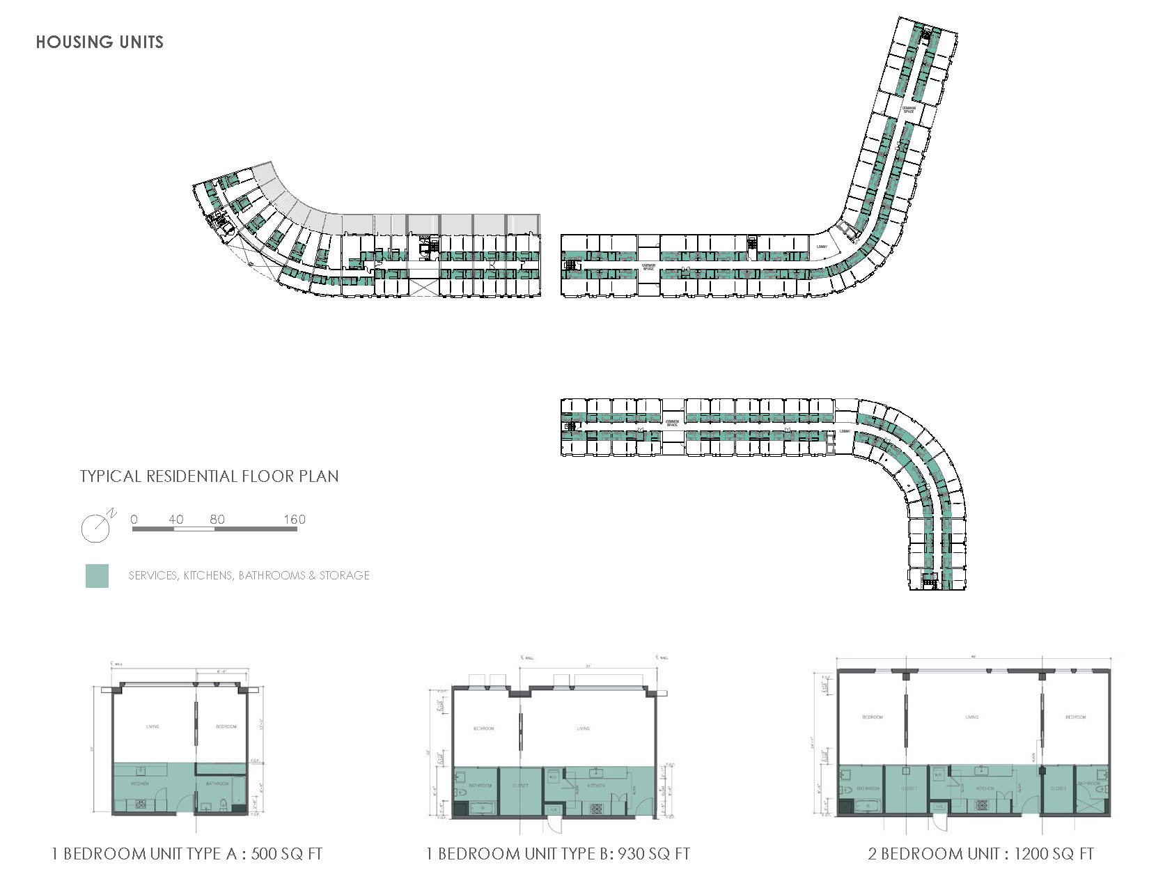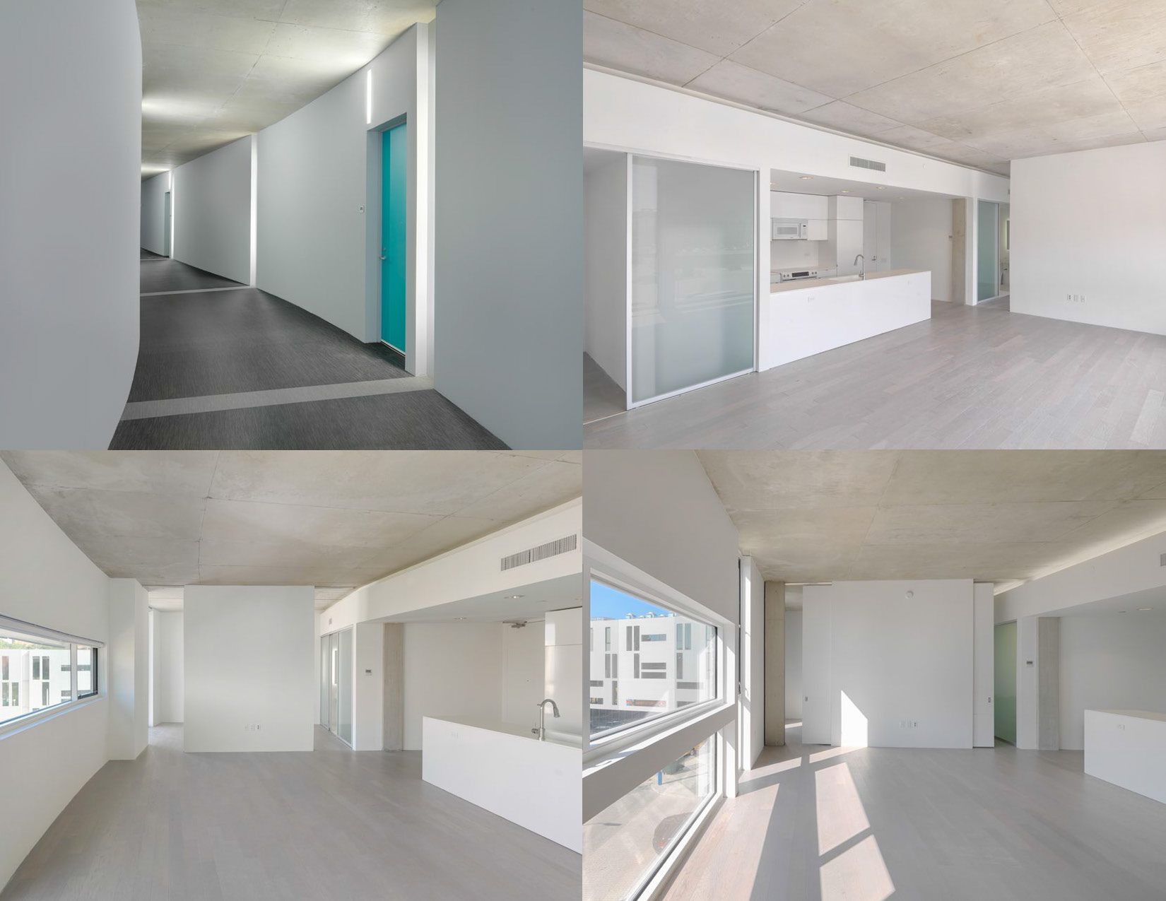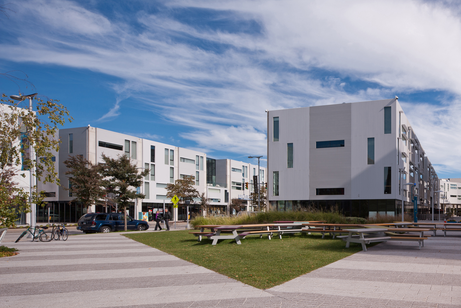 The building on the south side of Euclid Ave has commercial space lining the street, with parking on two levels at the rear. The commercial space houses a Barnes and Noble Bookstore, the entry lobby to the residences above is at a gateway which perforates the slab, and a grocery store which wraps around the corner onto 115th Street. Above are residences. Numerous types, ranging from one to three bedroom units, are structured in layers. From a double loaded central hallway, service bars are established on either side, connected to the habitable spaces on the outer walls. Three common area courtyards puncture the perforated façade.