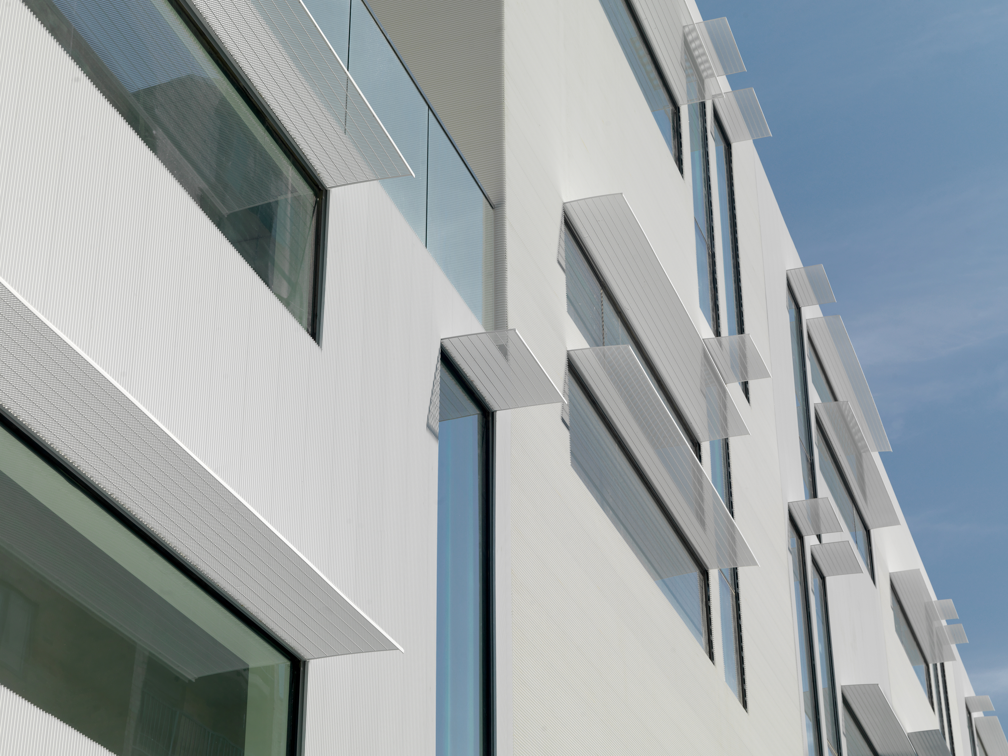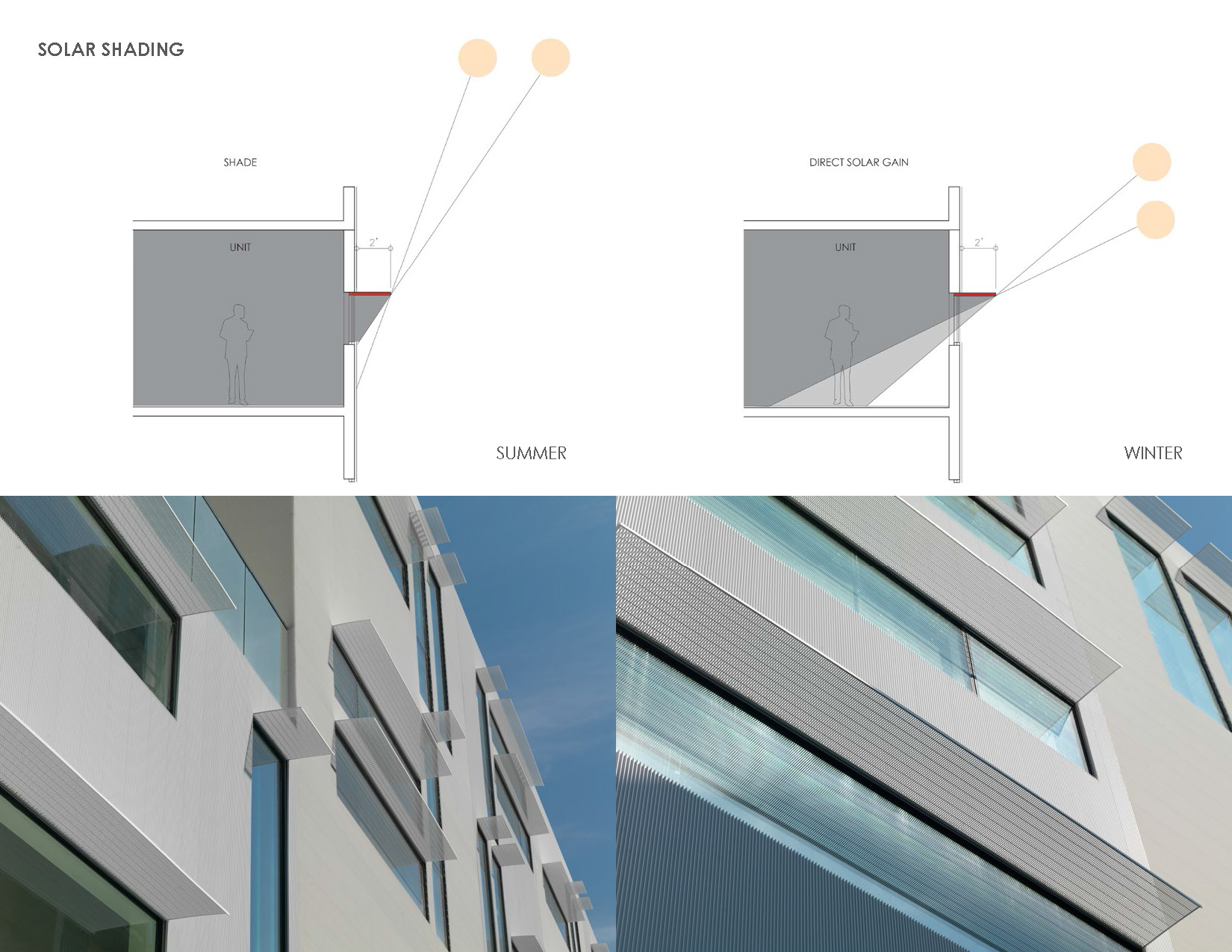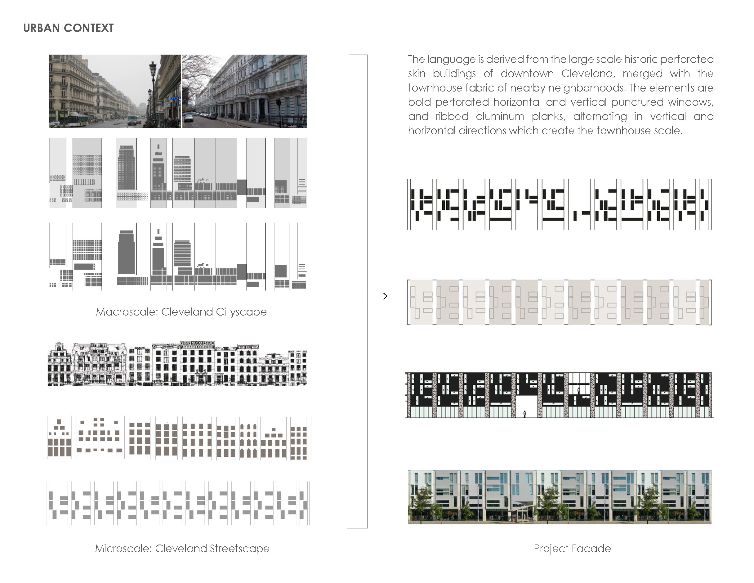 Architecture’s role here is to build a piece of city, and a common language and palette of materials repeat on the buildings in the tradition of great cities like Paris and London, where continuous architecture crates the fabric of a district. The language is derived from the large scale historic perforated skin buildings of downtown Cleveland, merged with the townhouse fabric of nearby neighborhoods. The elements are bold perforated horizontal and vertical punctured windows, and ribbed aluminum planks, alternating in vertical and horizontal directions which create the townhouse scale.