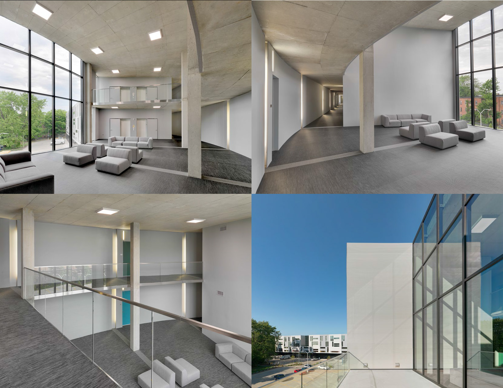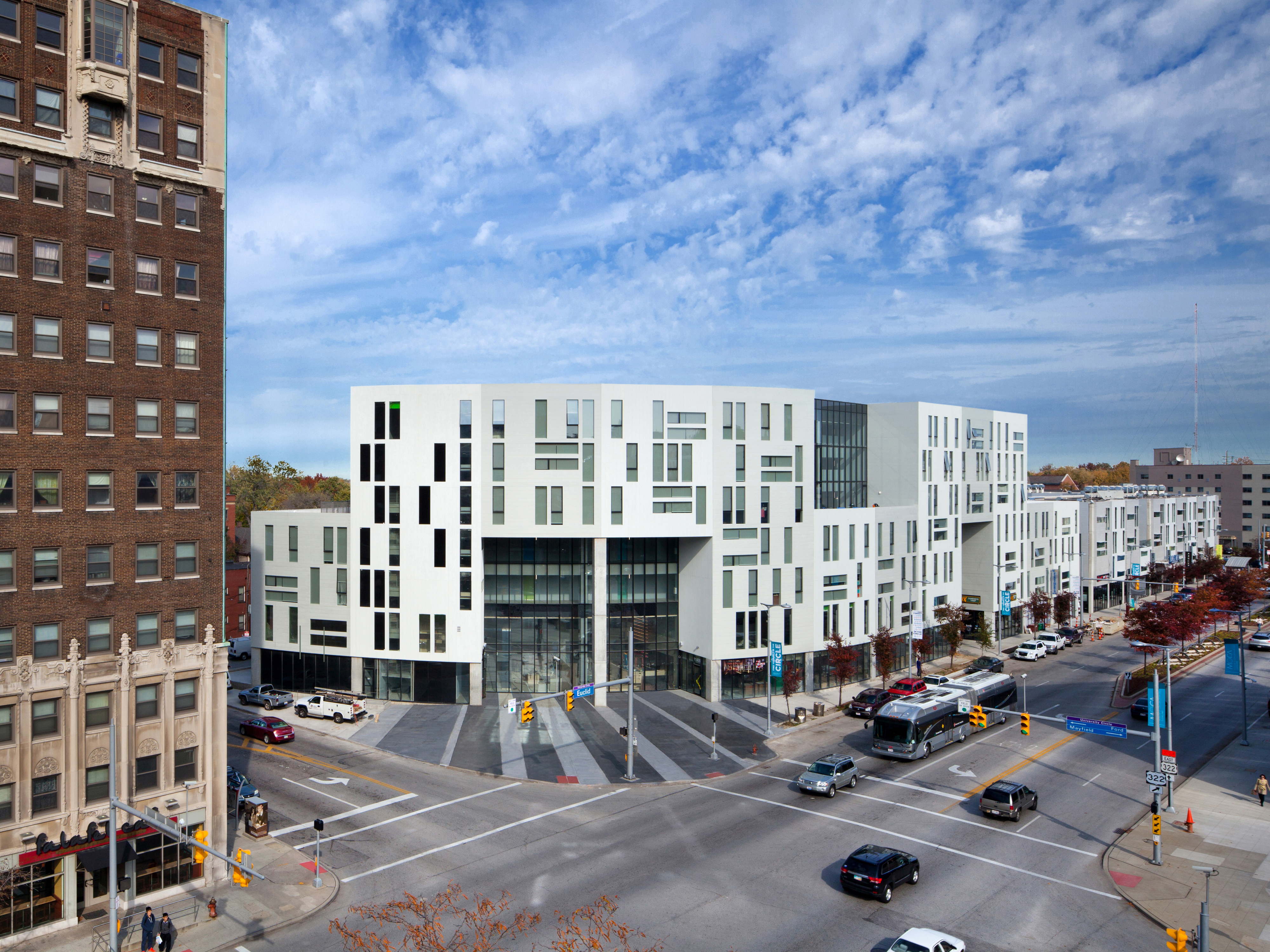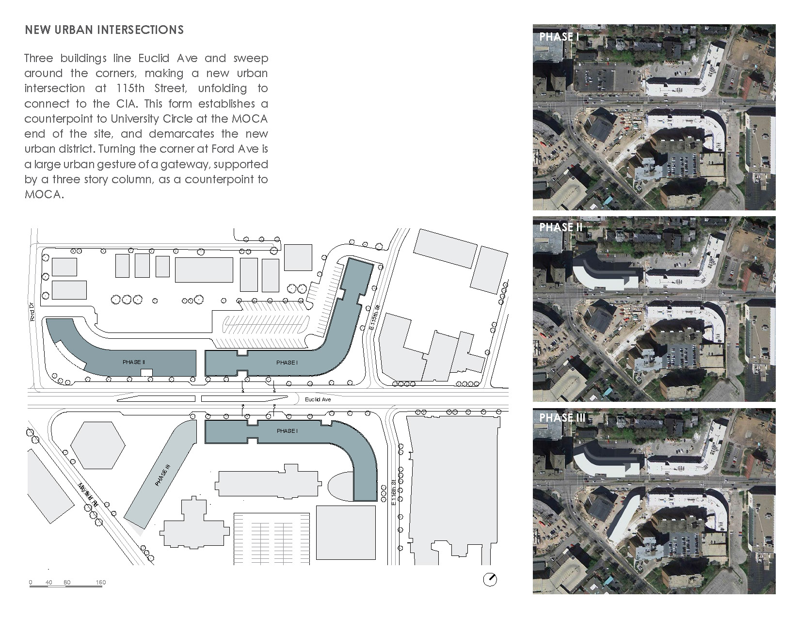 Two completed buildings line Euclid Ave and sweep around the corners, making a new urban intersection at 115th Street, unfolding to connect to the CIA. This form establishes a counterpoint to University Circle at the MOCA end of the site, and demarcates the new urban district, Uptown.