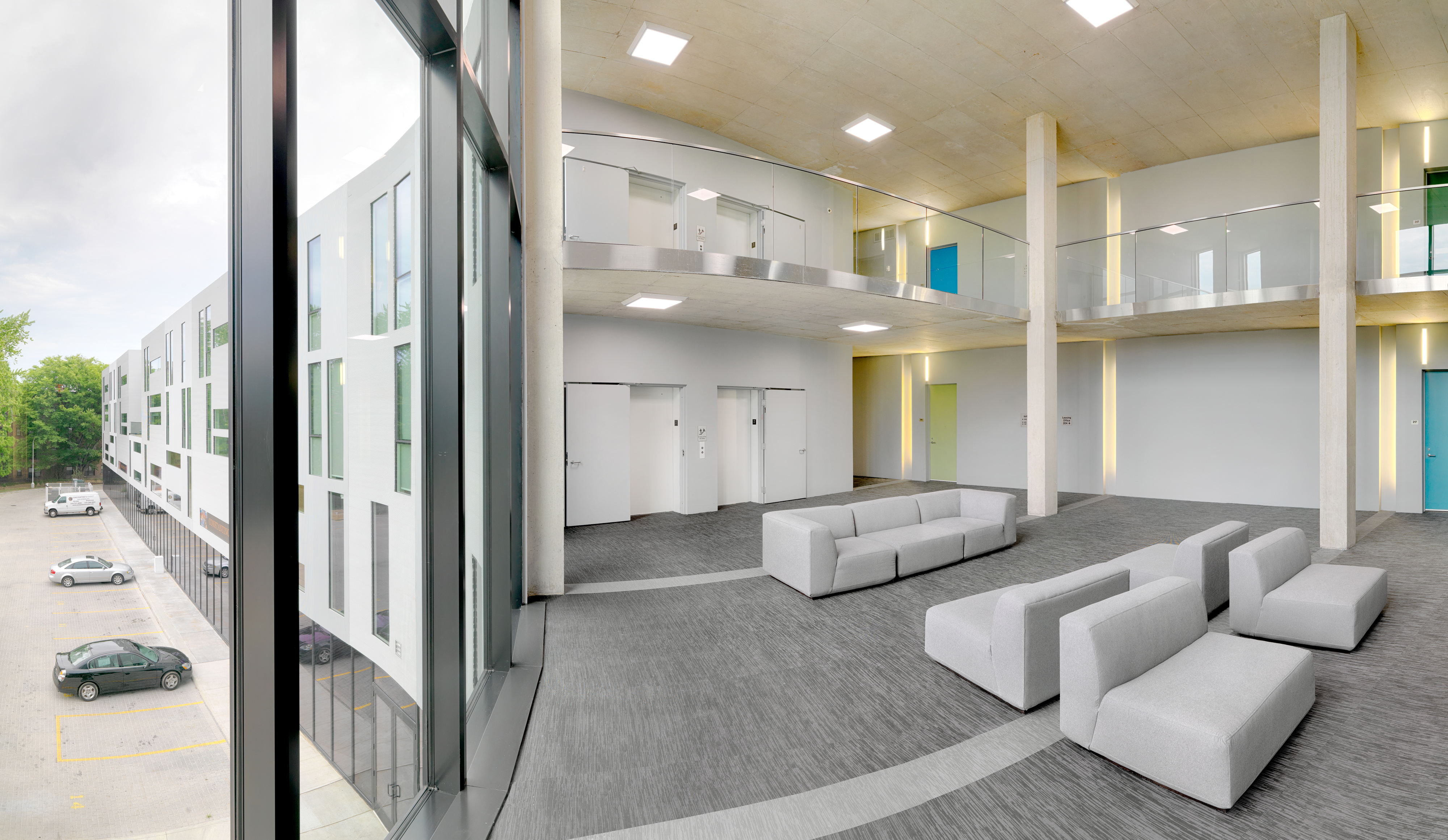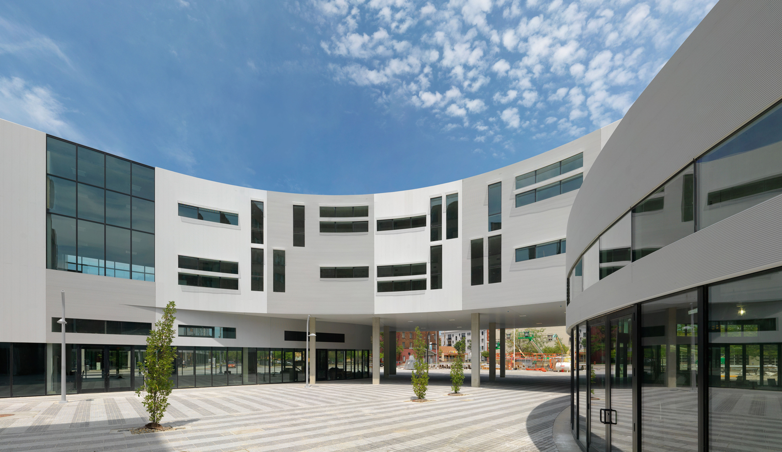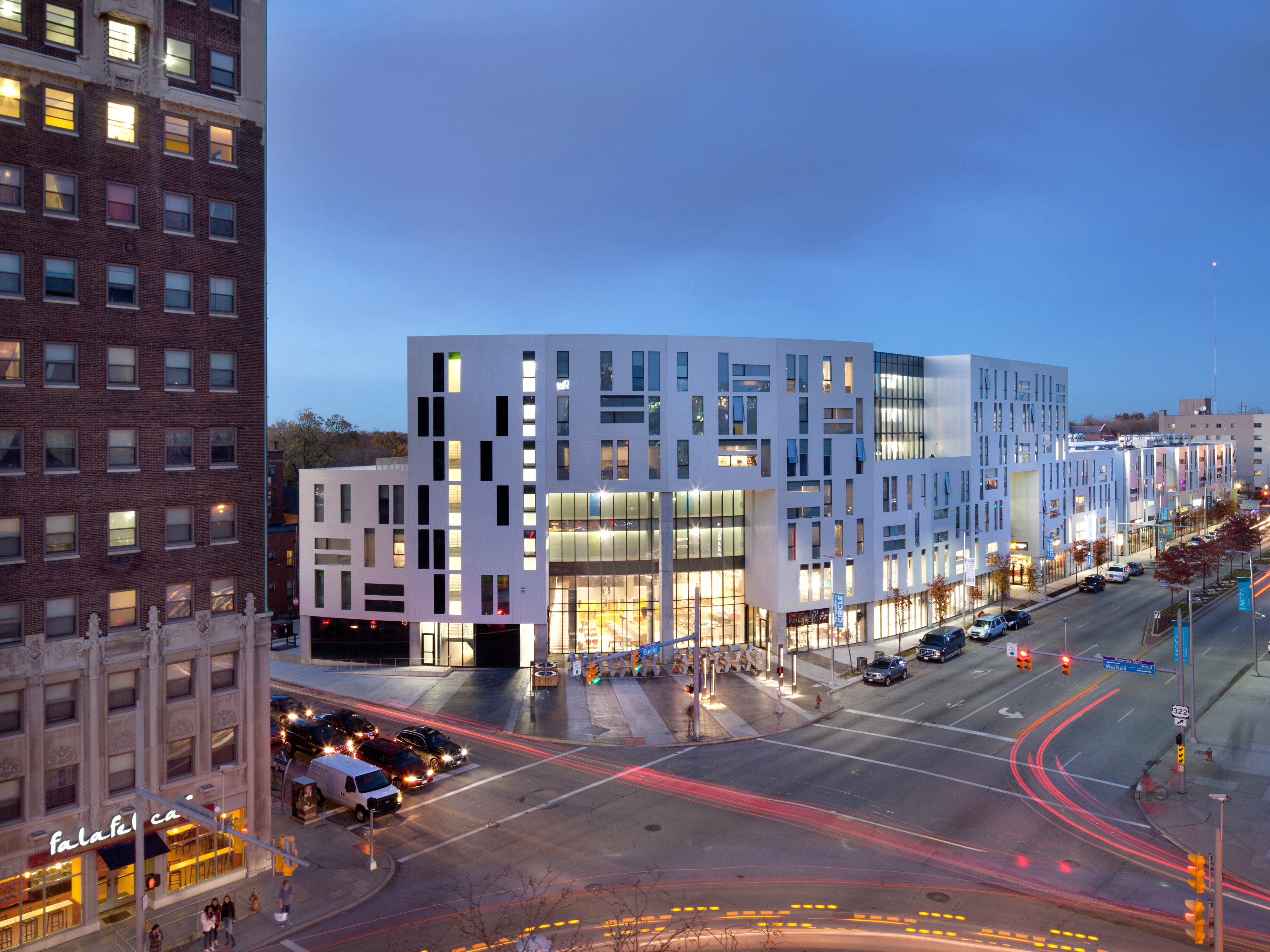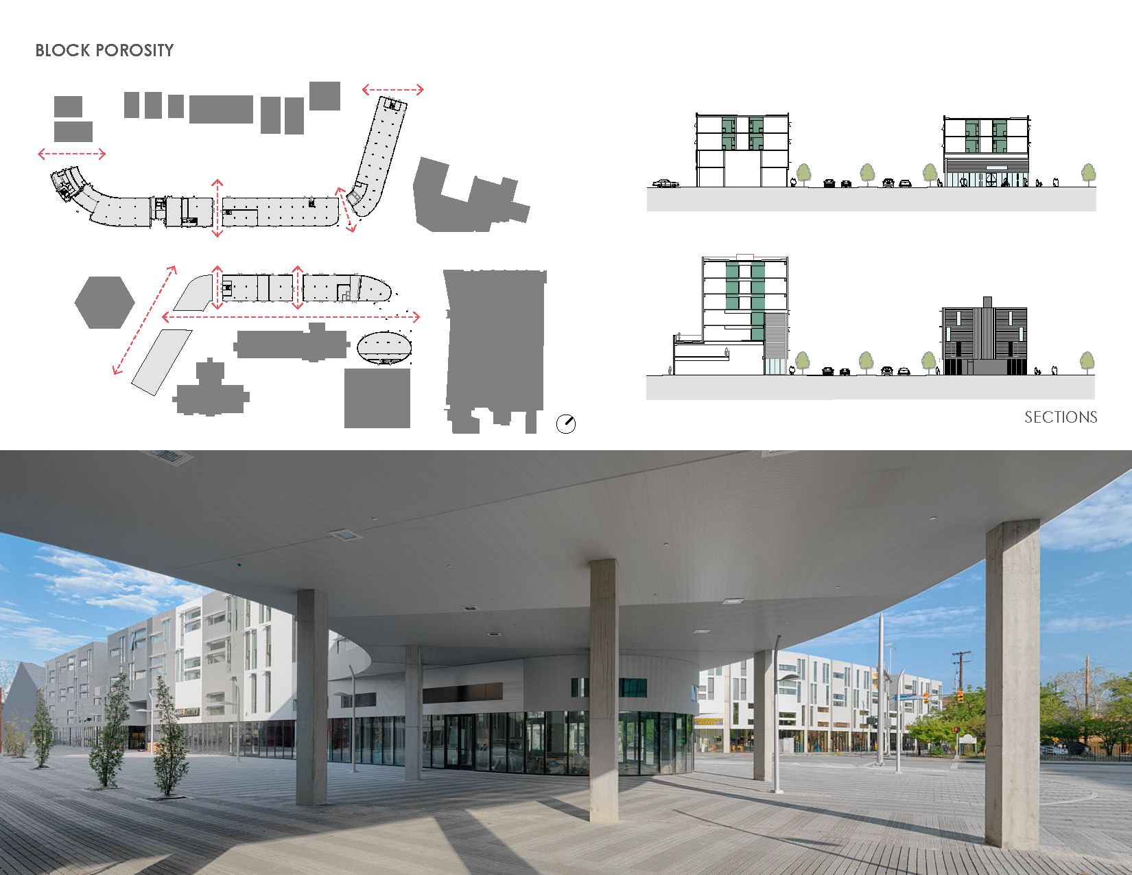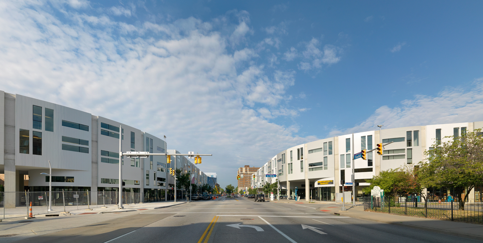 The commercial bases on both sides of the street are transparent, perforated and light. The façades of the two buildings are gridded and perforated, and recall Downtown Cleveland for Uptown, the new center at the hub of the most vital part of contemporary Cleveland.