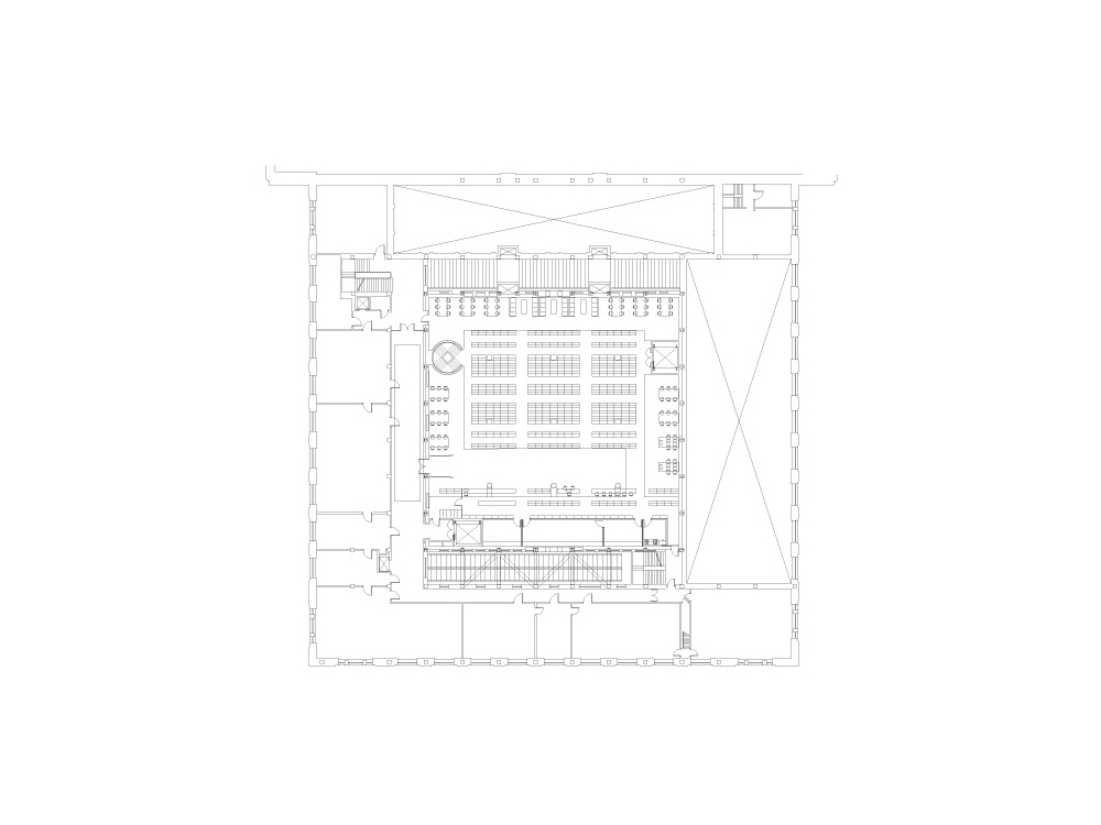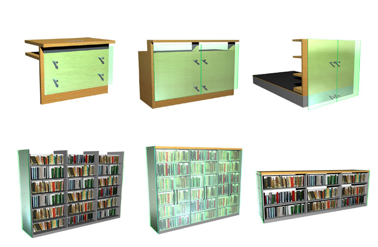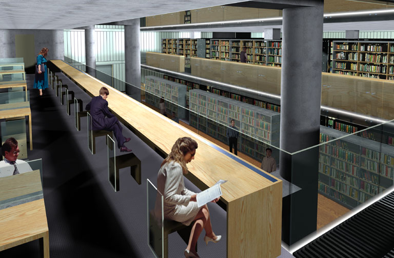 Juxtaposed with the storage of books in the densely stacked floors of shelves is the activity of reading, which takes place on trays. The book stacks are linked to the trays by a bridge that slices through the volume of light. A circular stair and an elevator link the book building and the reading trays to the main floor. The three elements of circulation—elevator, stair, and bridge, each with a distinct form—pivot around the book building. Entry to the Visual Arts Library is on the third level of Doe. The book building is to the left; the circulation desk and reference area, with the staff spaces and librarian’s office behind, to the right. Above are the reading trays. Light fills the library, filtering from the skylight above and radiating from the walls. A glass skin hides the accumulation of mechanical equipment outside the windows. The structure is a rigid cage on the existing foundations; it is tied at the top, above the ceiling, and connected to the concrete shear walls via the stair tube and elevator shaft. The furniture and lighting are integral, made of solid material and illuminated glass. Lighting sources are concealed, providing only the effect of illumination in this radiant volume.