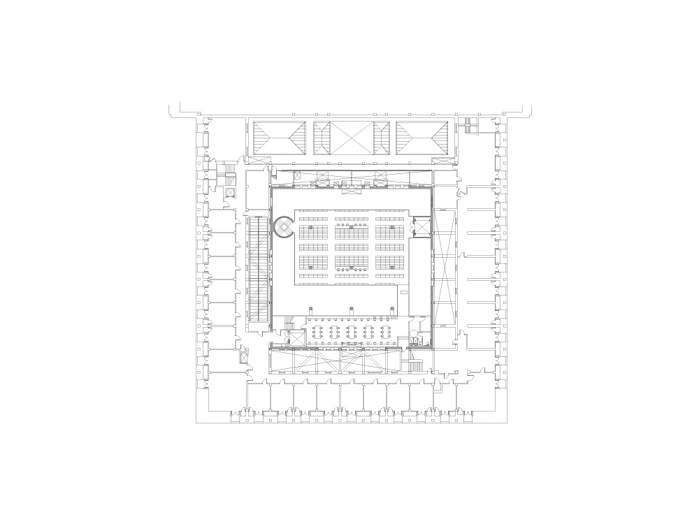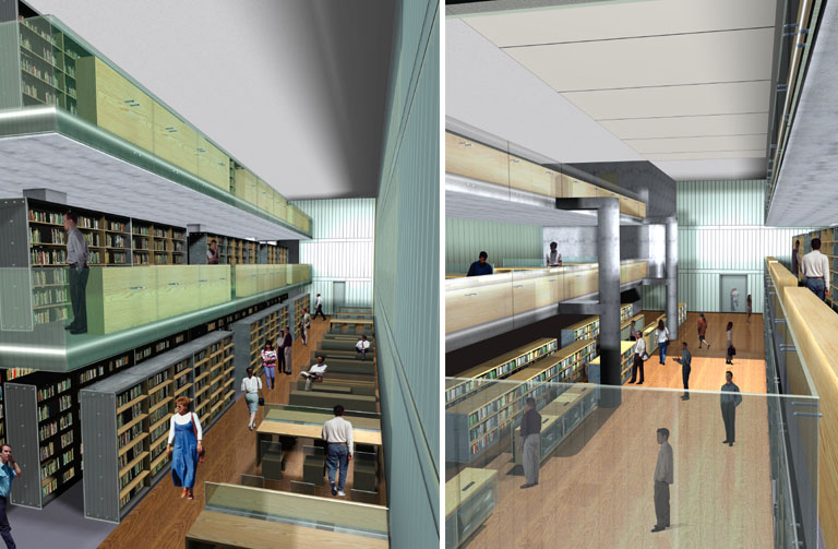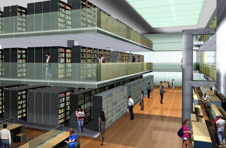 Architect John Galen Howard placed the Doe Library at the center of the original campus plan for UC Berkeley, at the heart. In the middle of the library is a void. This center of the center is the site for the Visual Arts Library. The design builds a building within this building, a transparent case, a container, an object that protects the precious material of the library. The idea for the building revolves around two intertwined concepts: the display of the collective mind, manifested by the presence of a vast collection of books, and light, both for reading and as an emblem of illumination.