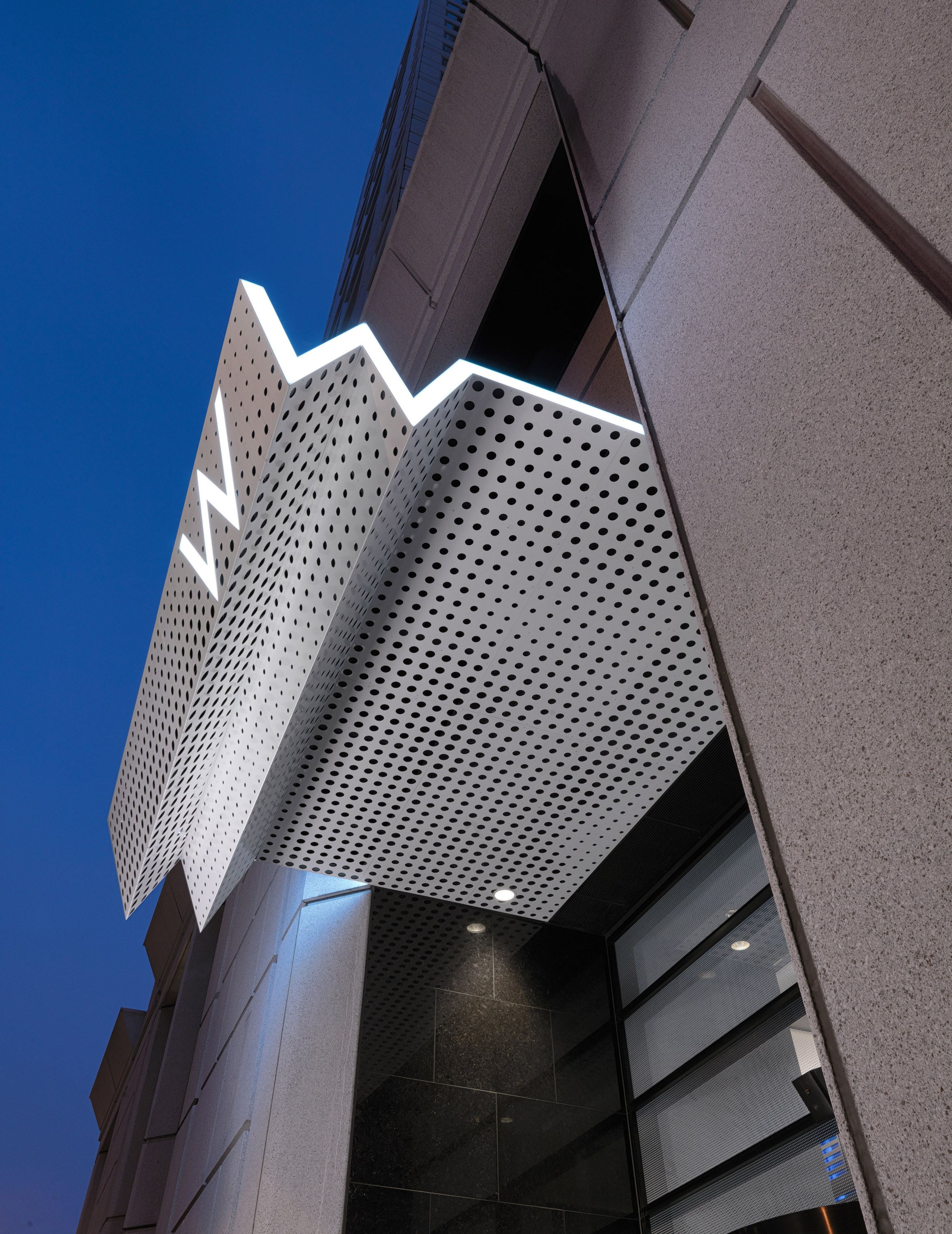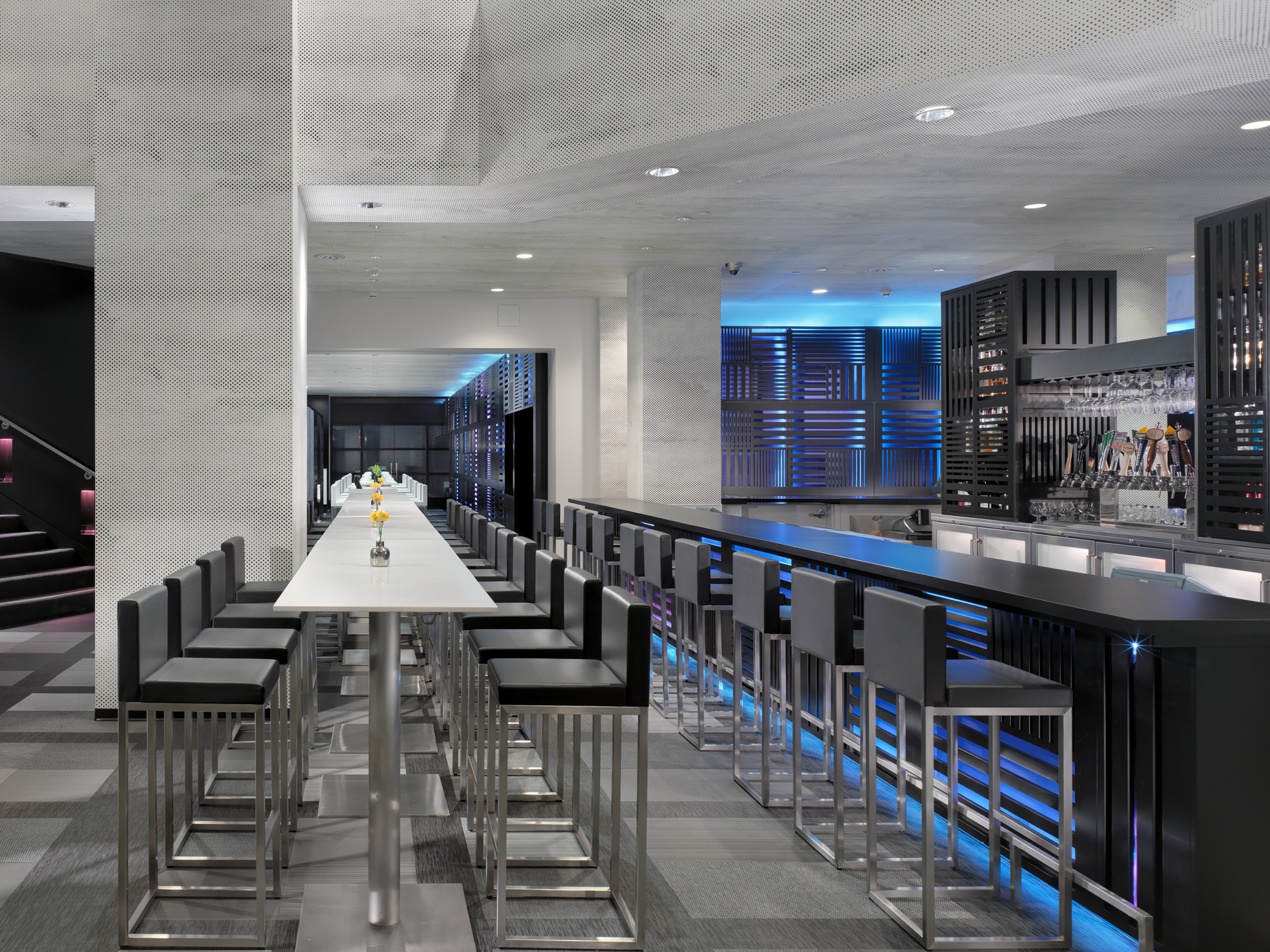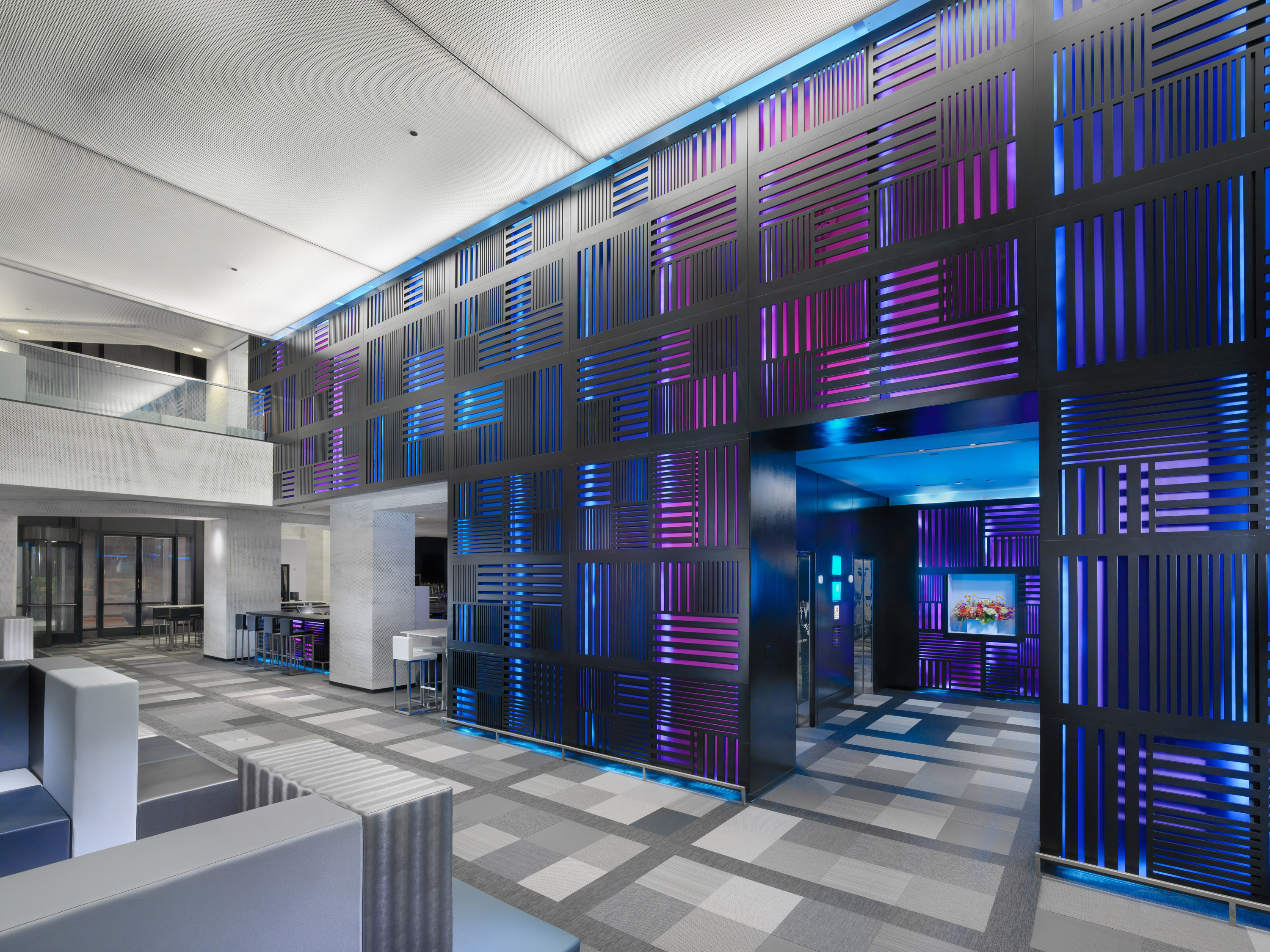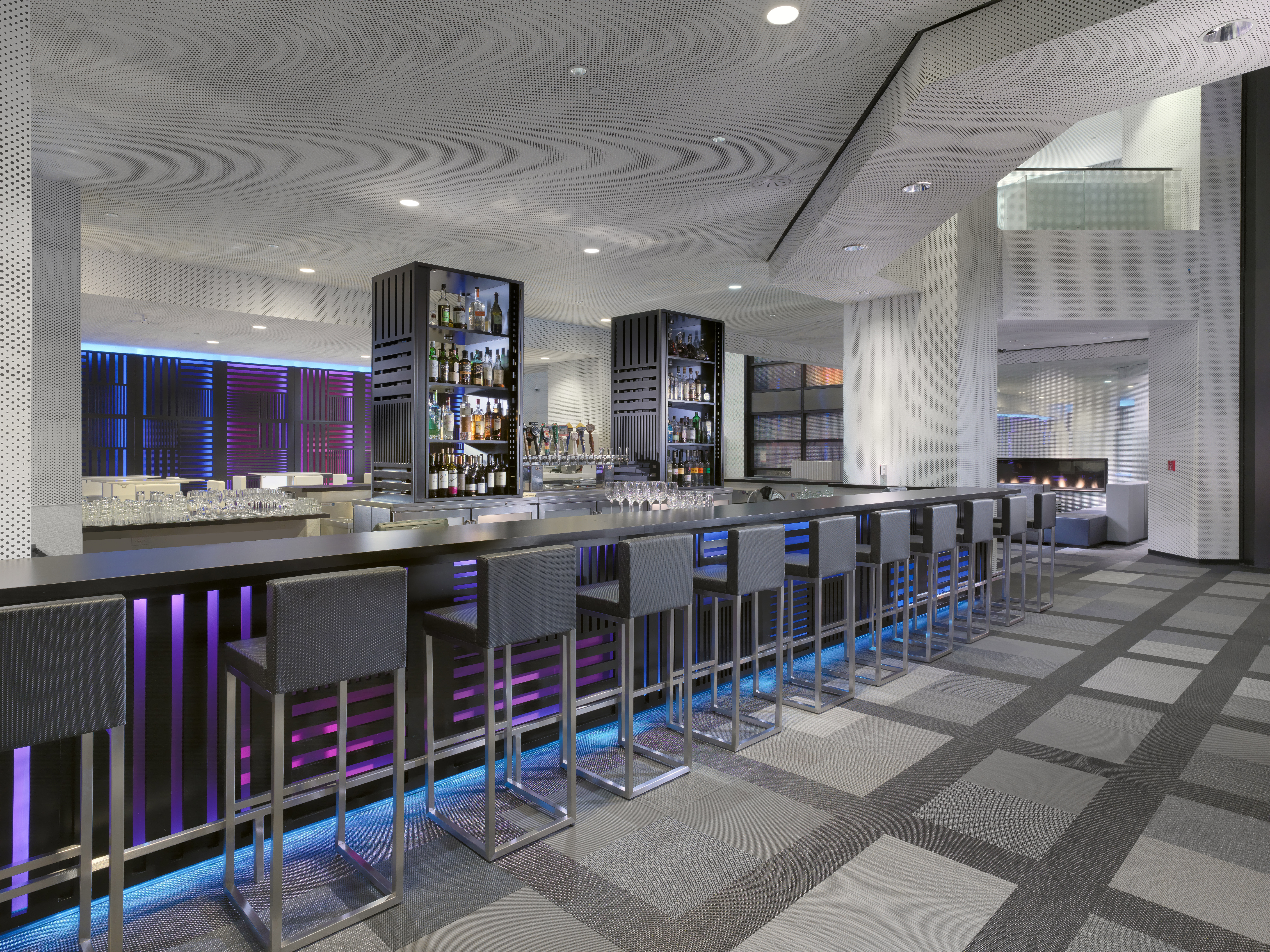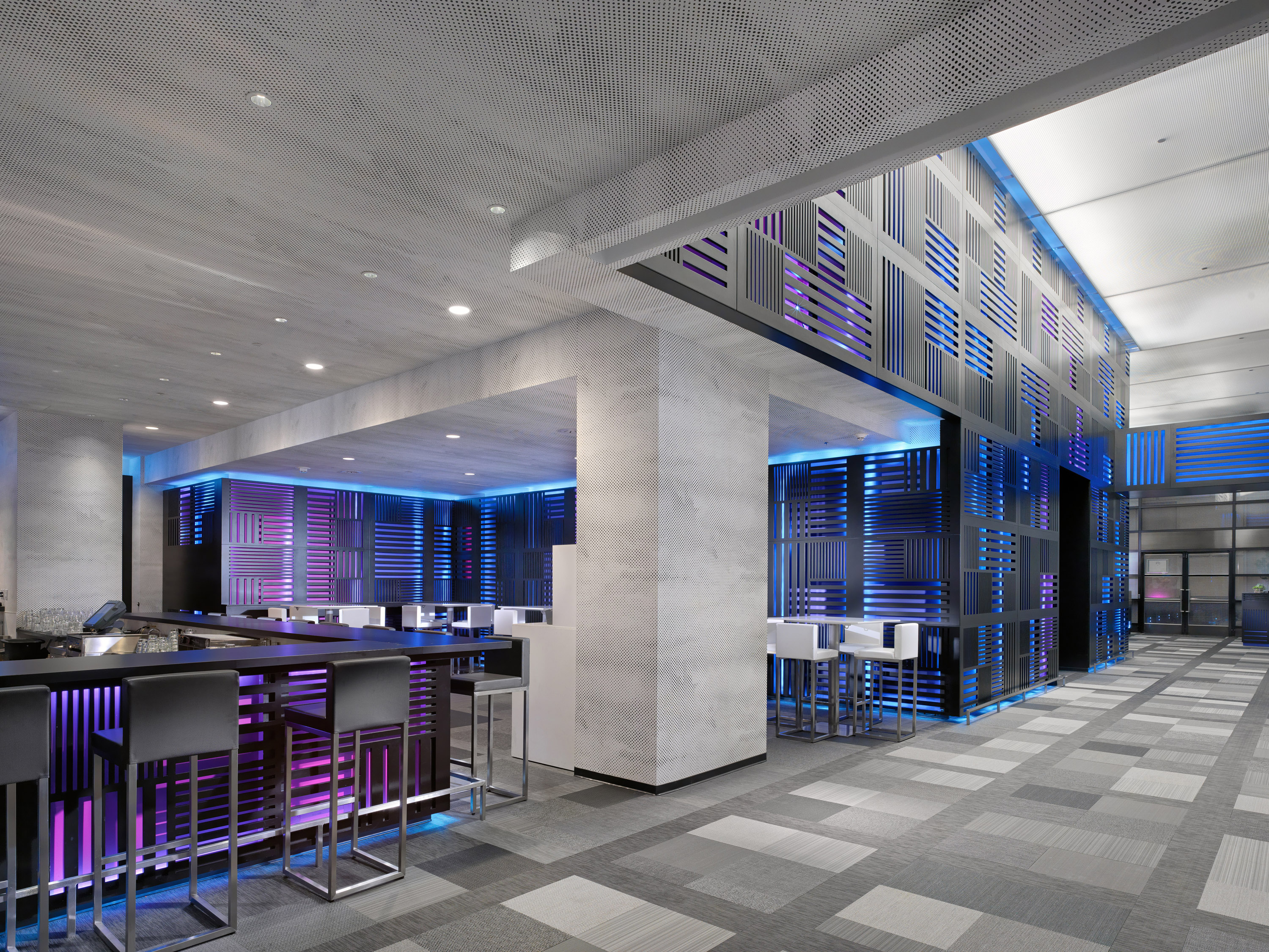 The new interior of the W is a fantasy cityscape, an image of the city as remembered in movies and songs, shrouded in glowing fog.