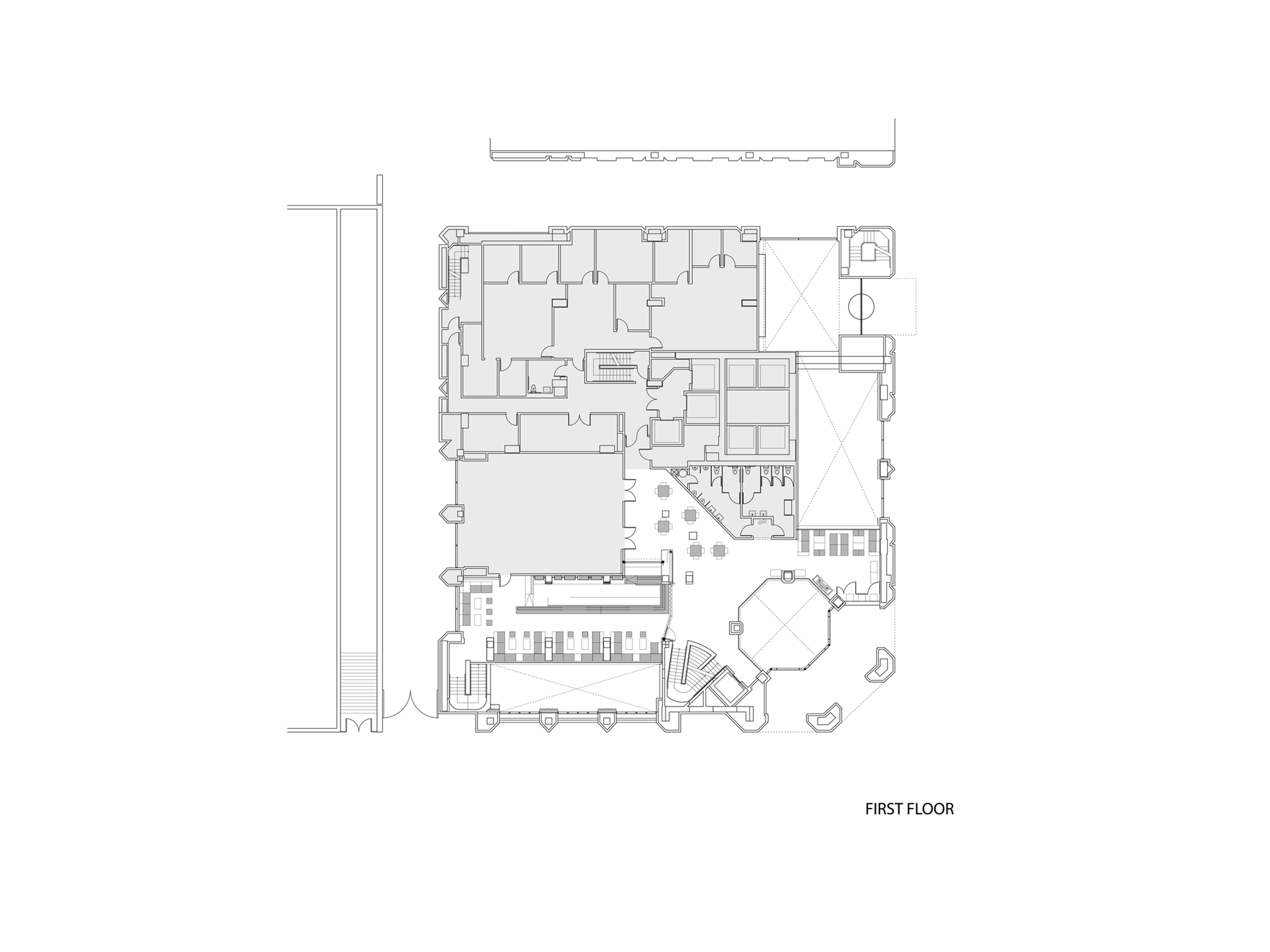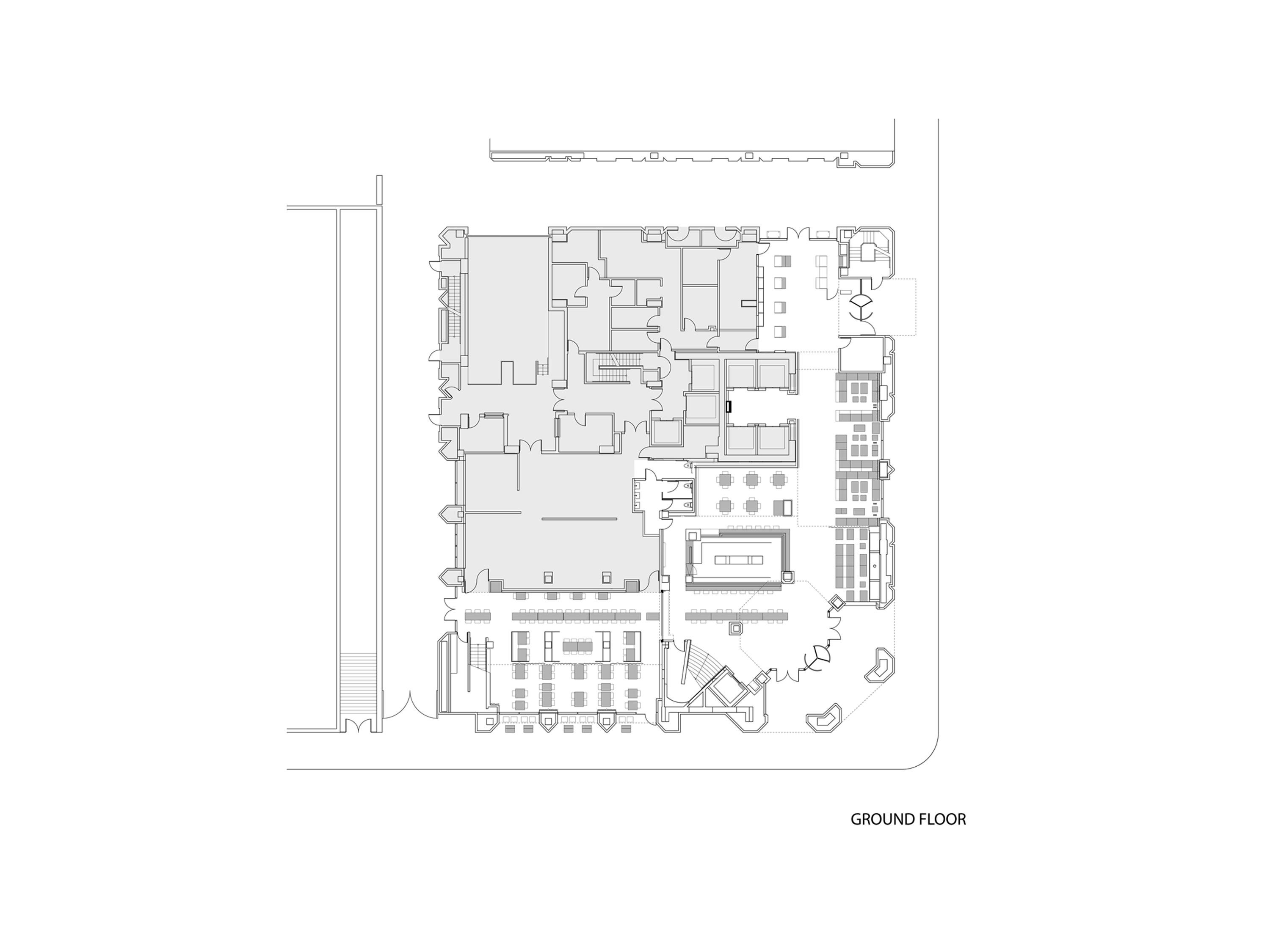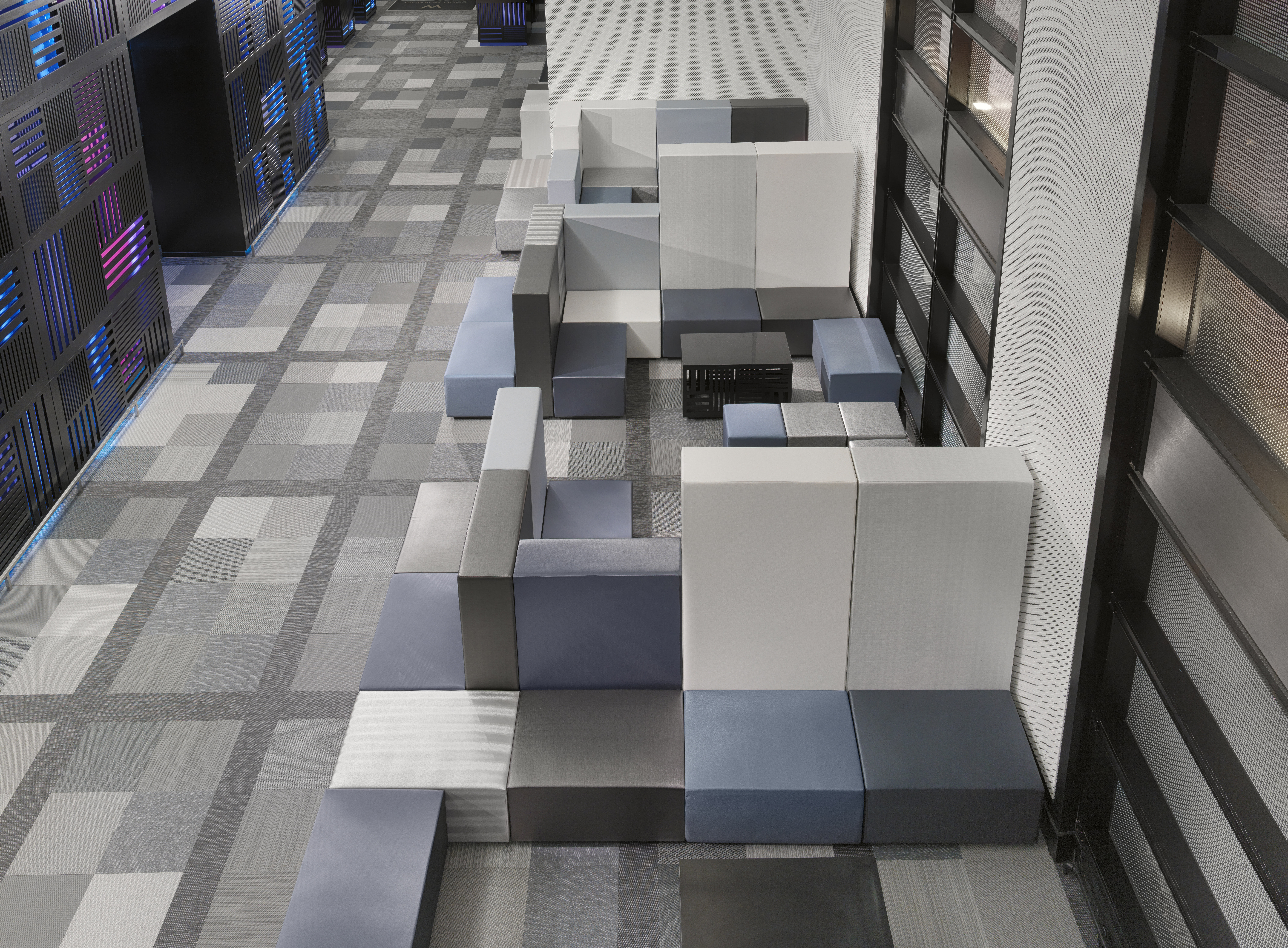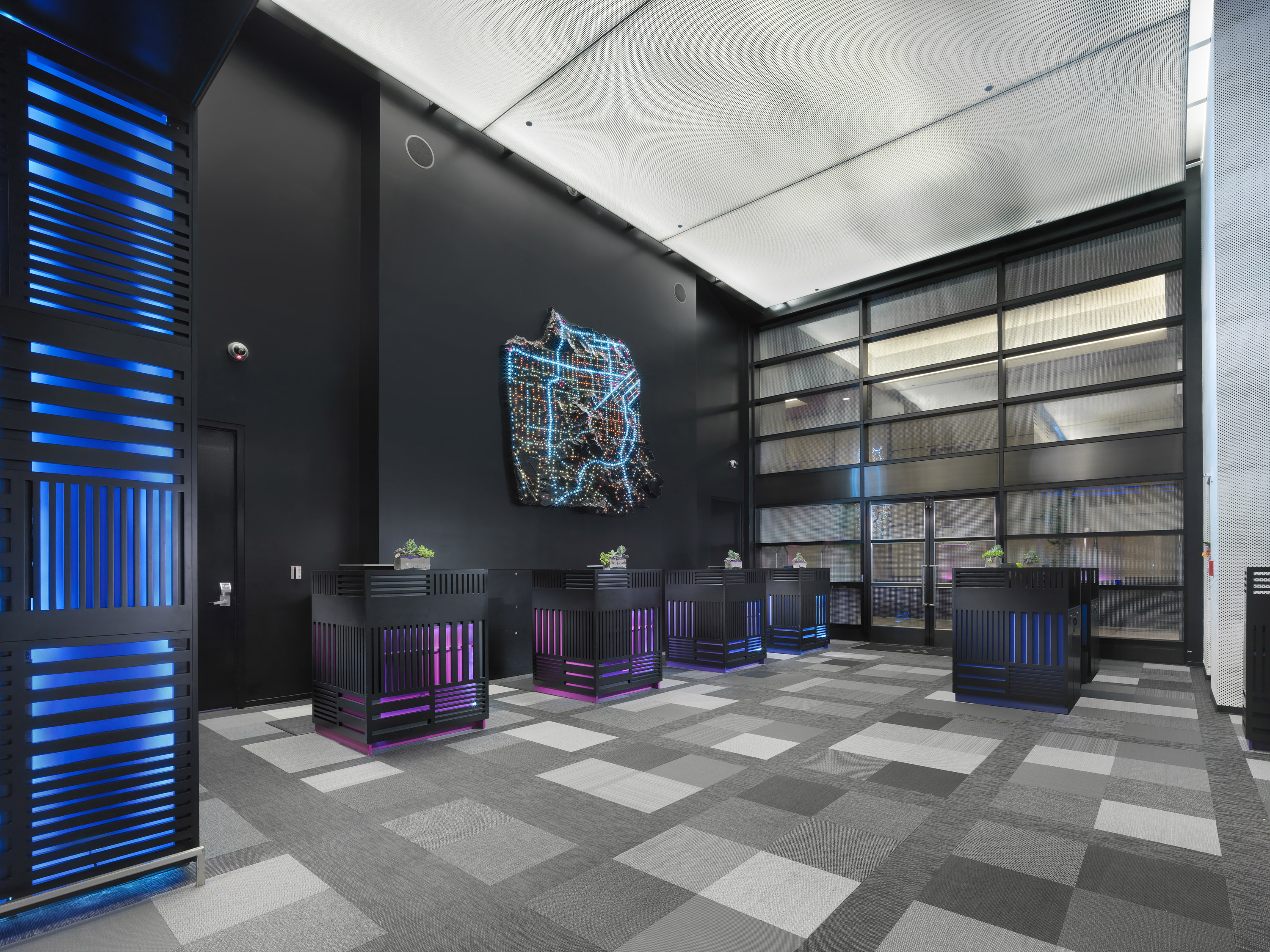 The grids of streets and lots that cover the floor are patterned carpet, and wrap up the interior walls as backlit wooden panels. The reception desks, furniture, bars, bar storage, tables, seats and couches are cubic extrusions from this carpet map. Each piece of furniture is a fragment of the San Francisco cityscape, recreated as an interior landscape, to be sat on or in, to store and support the functional elements of the hotel.