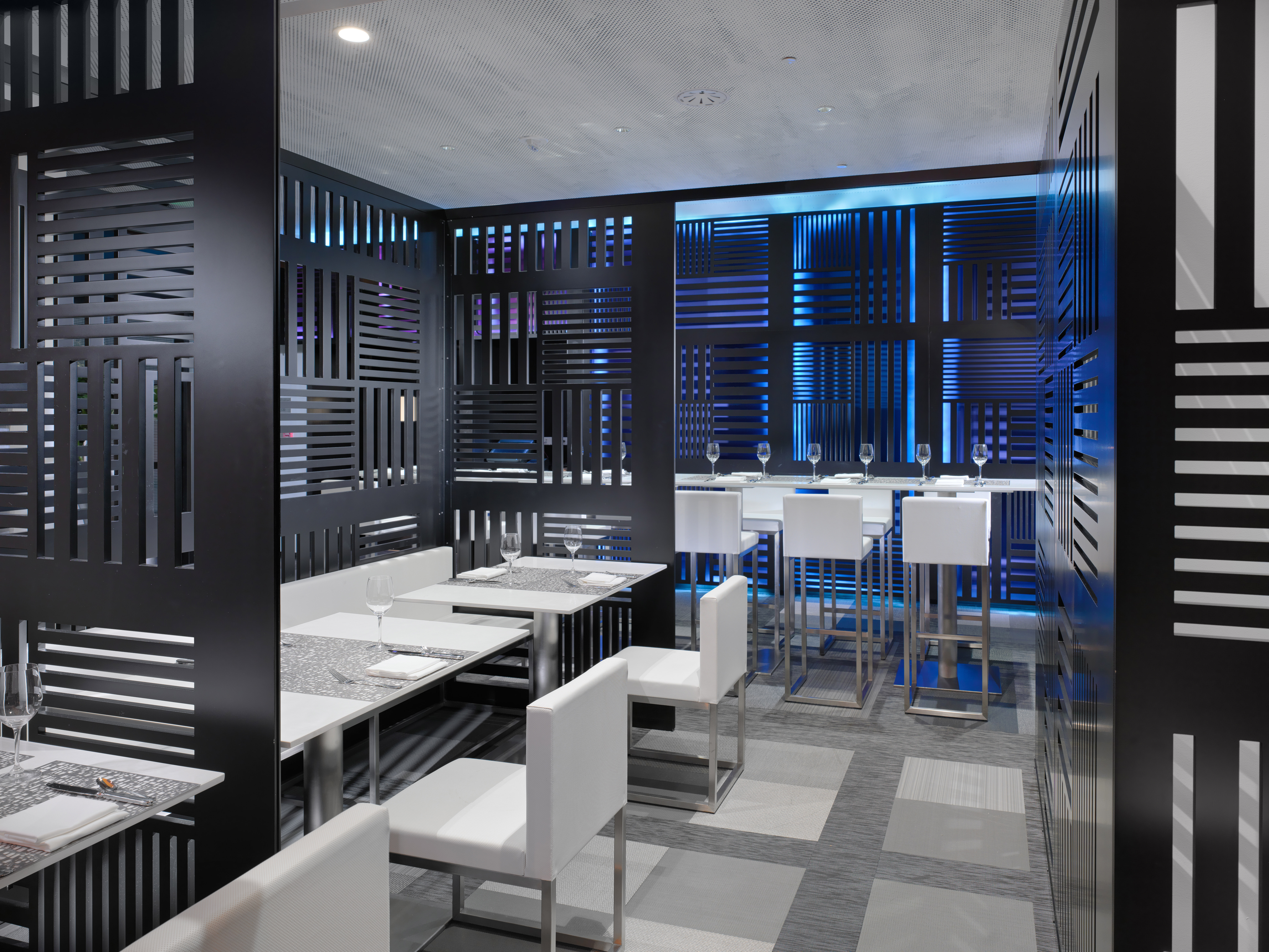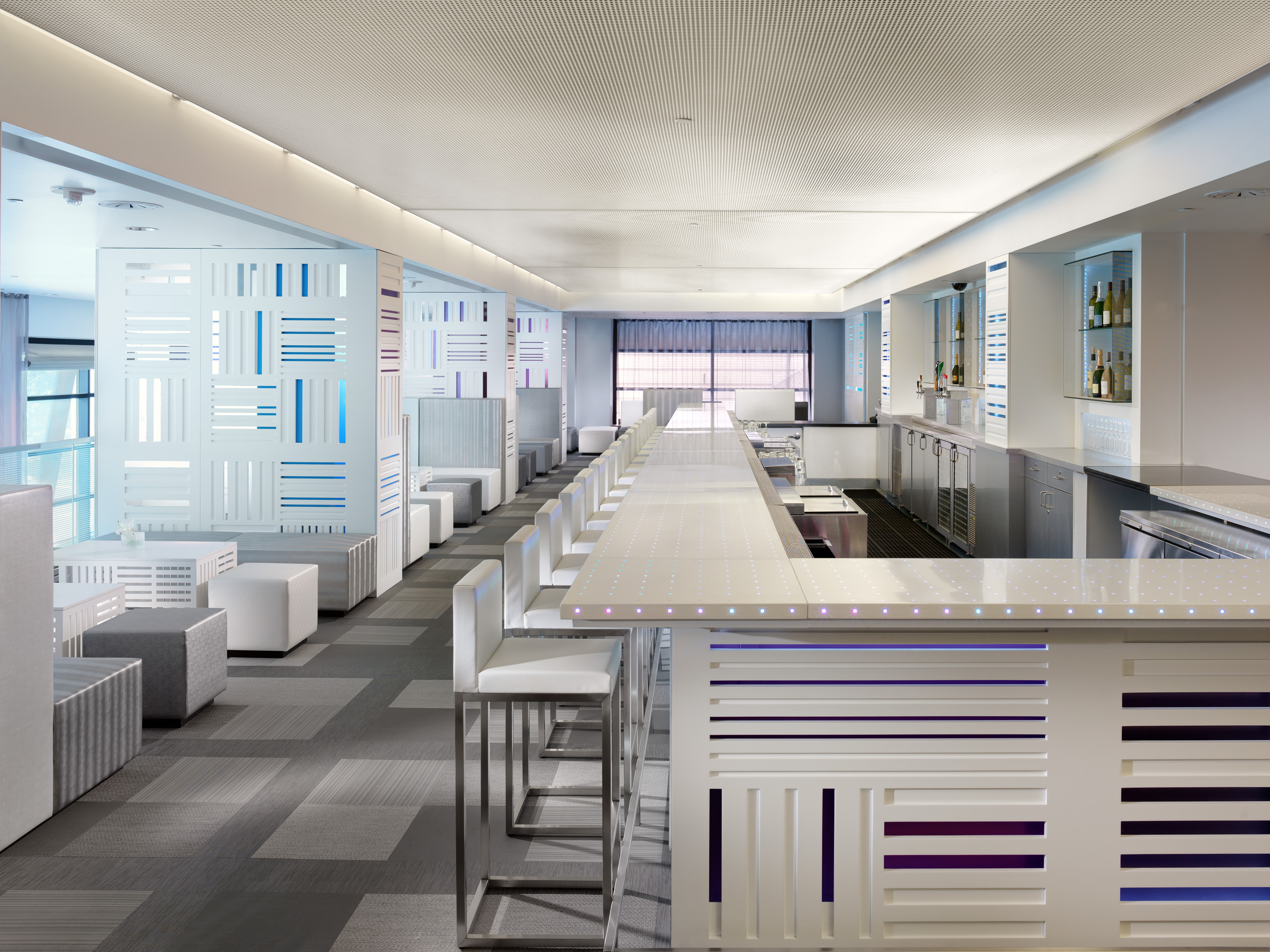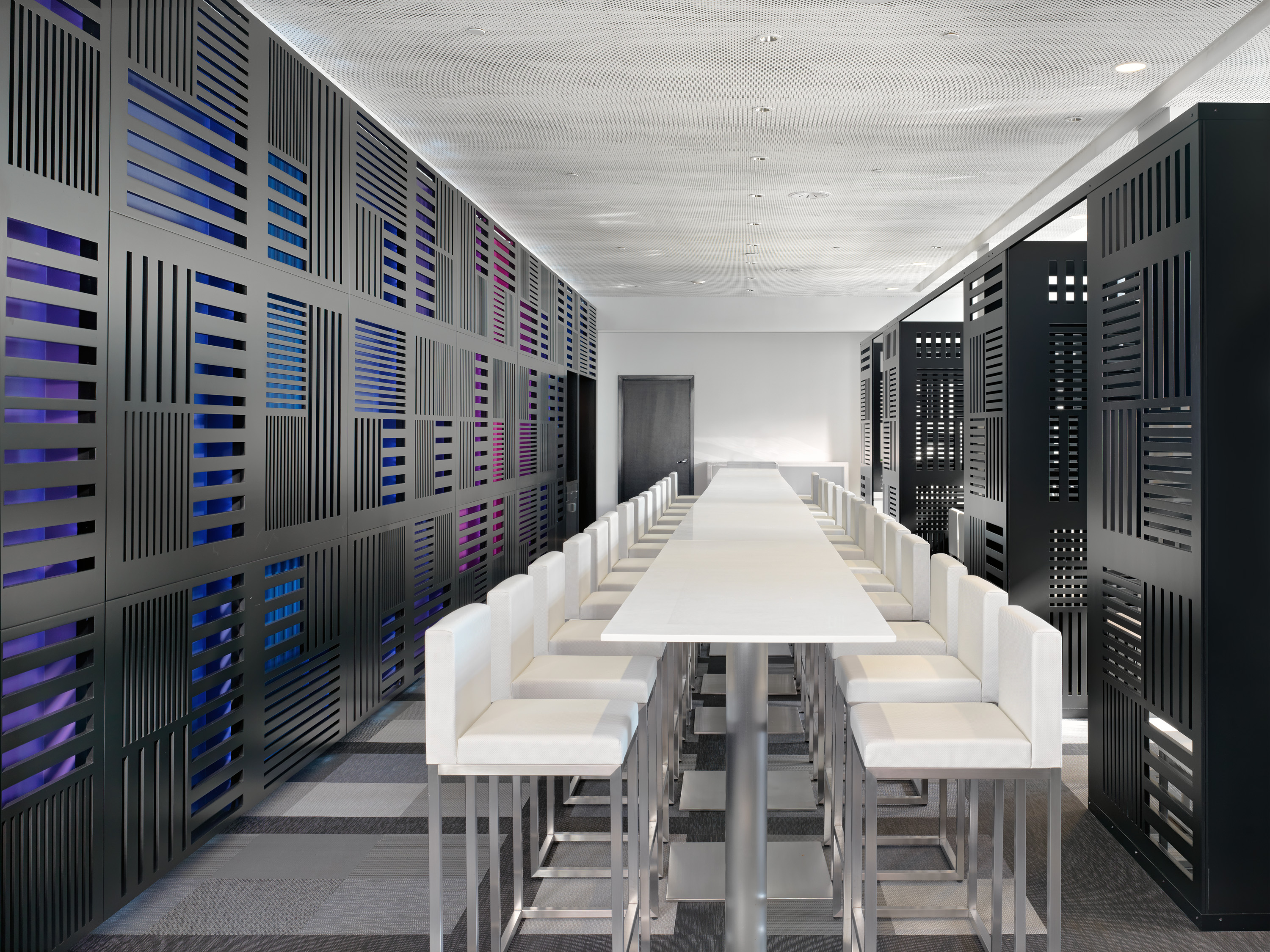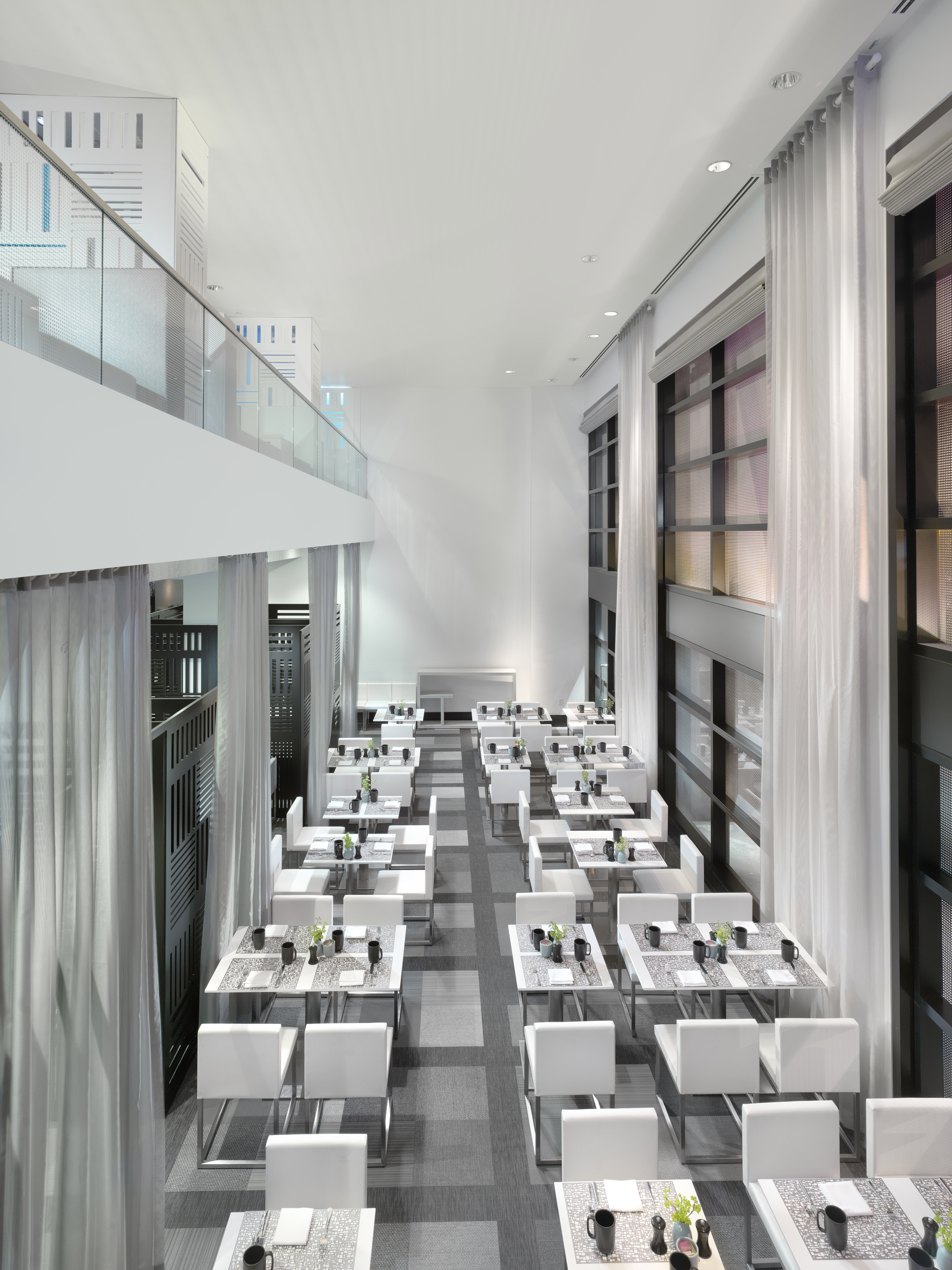These pieces of the remade interior city are enveloped in patterns of fog that cover the windows, walls and ceilings, backlit and shimmering, making them both ephemeral and focal. Fog is presented as fabrics, drapes, and pixilated wall coverings that wrap the surfaces. As one goes higher in the interior, upstairs to the bar, the fog thickens and the colors change to white and mute.